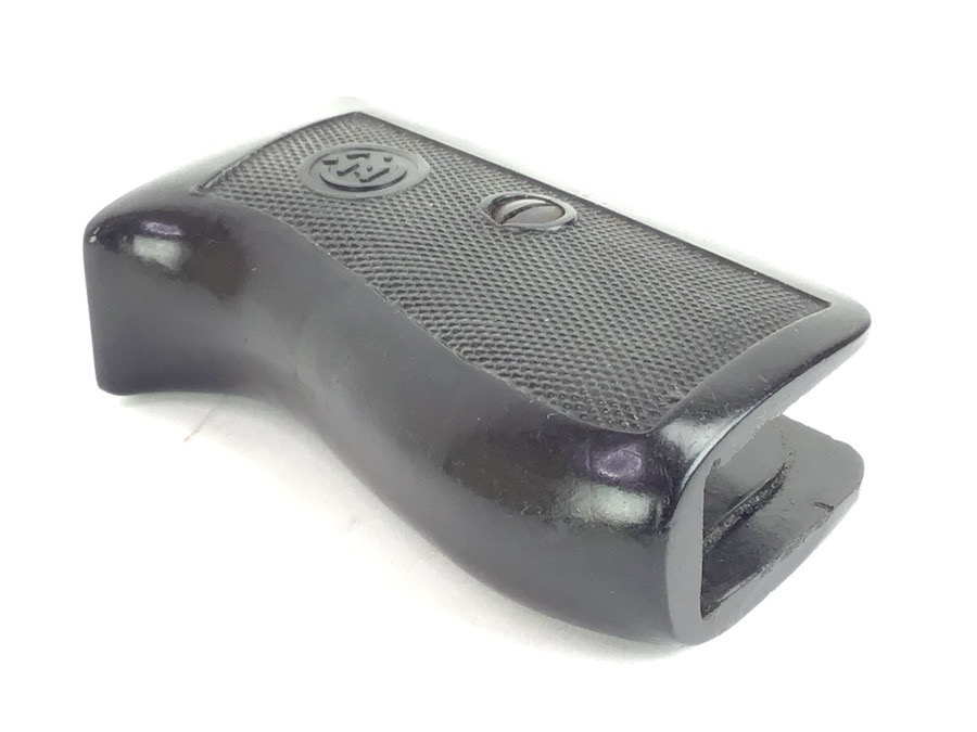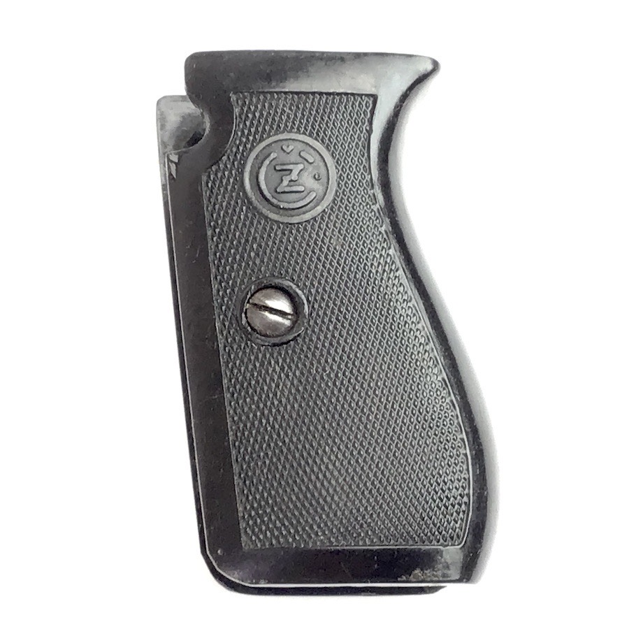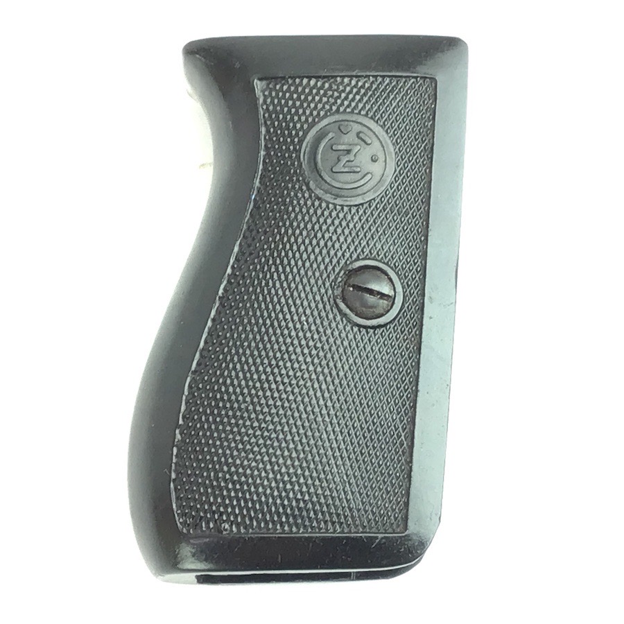 7/12/24 – This is an original WW2 era CZ model 27 grip. The grip is in excellent condition, and the earlier wartime variation. Each side of the grip has the CZ logo inside a circle. The dark brown bakelite is in excellent condition. Some minor surface wear, but no cracks or chips. The grip comes with two original screws.