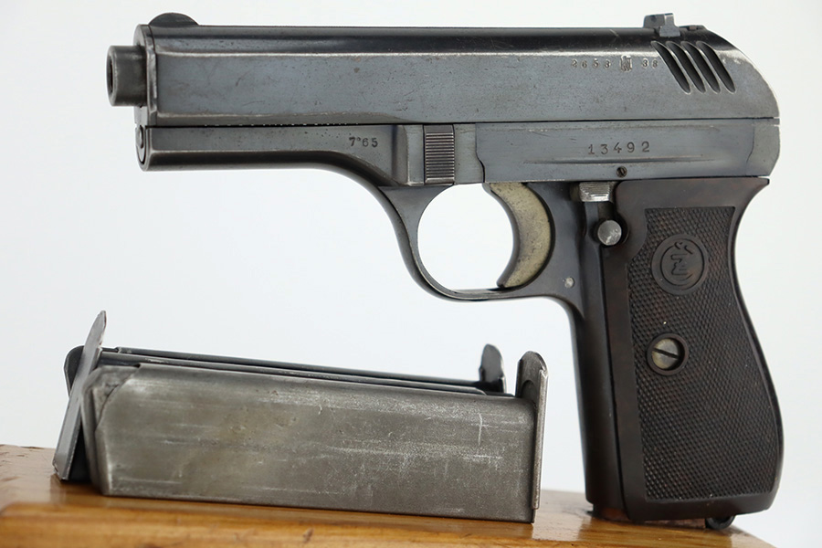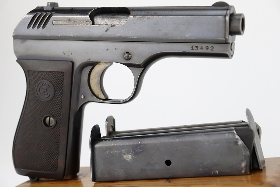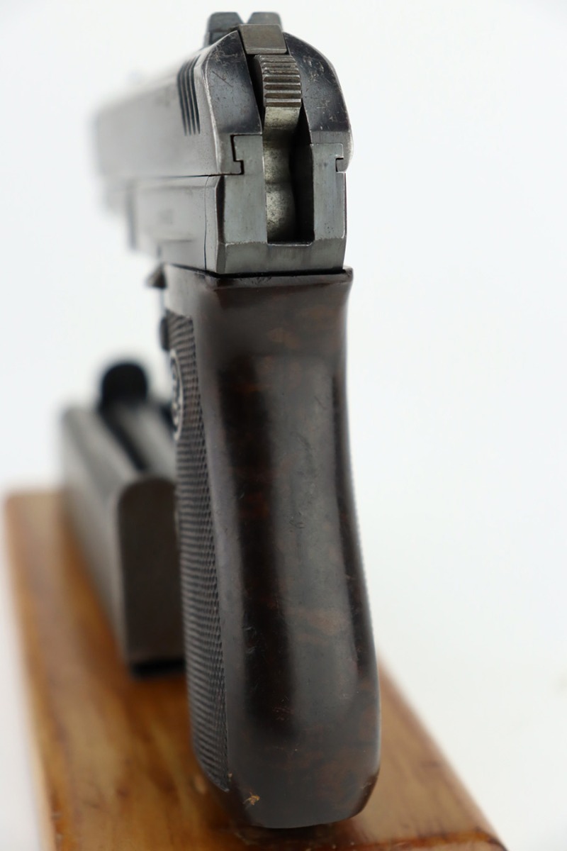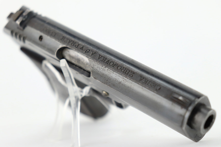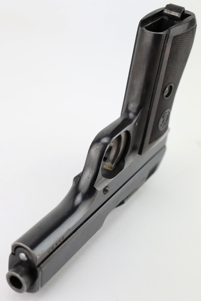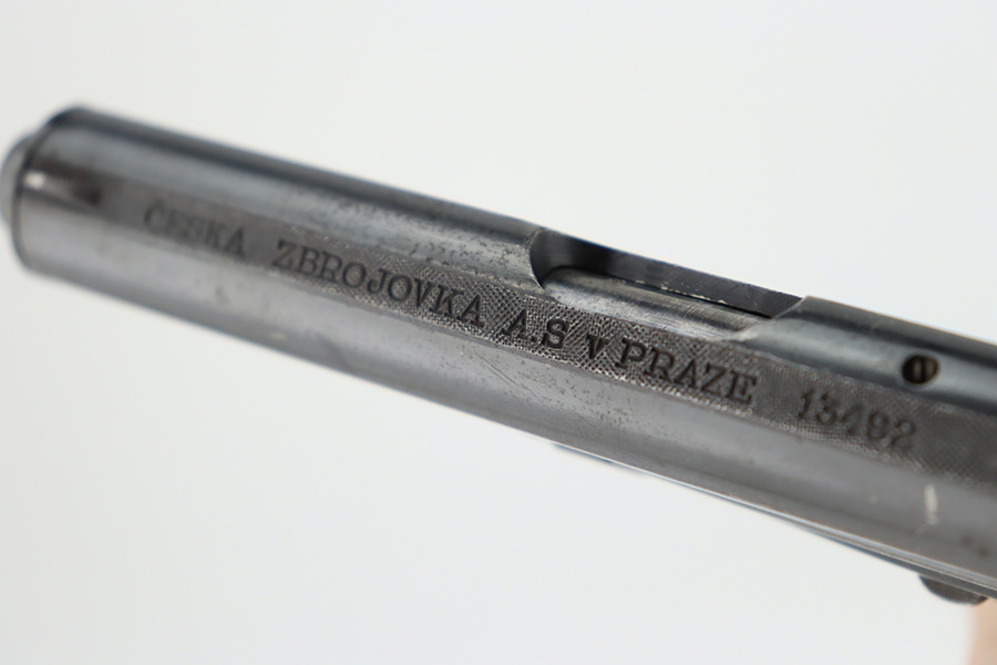 1/8/24 – This is an early Czech CZ Model 27 manufactured in 1938. All matching with the proper Czech lion proofs. This is often referred to the Ceska variation, given the slide legend. These characteristically have early high polish finishes and straw-colored small parts. The bluing rates about 90-92% with general high edge wear and tiny handling marks and scratches throughout. Fitted with a proper bakelite grip – no cracks or chips. Comes with three magazines – two are blank, one is “CZ 27” marked. Mint bore.