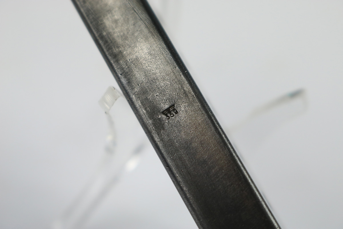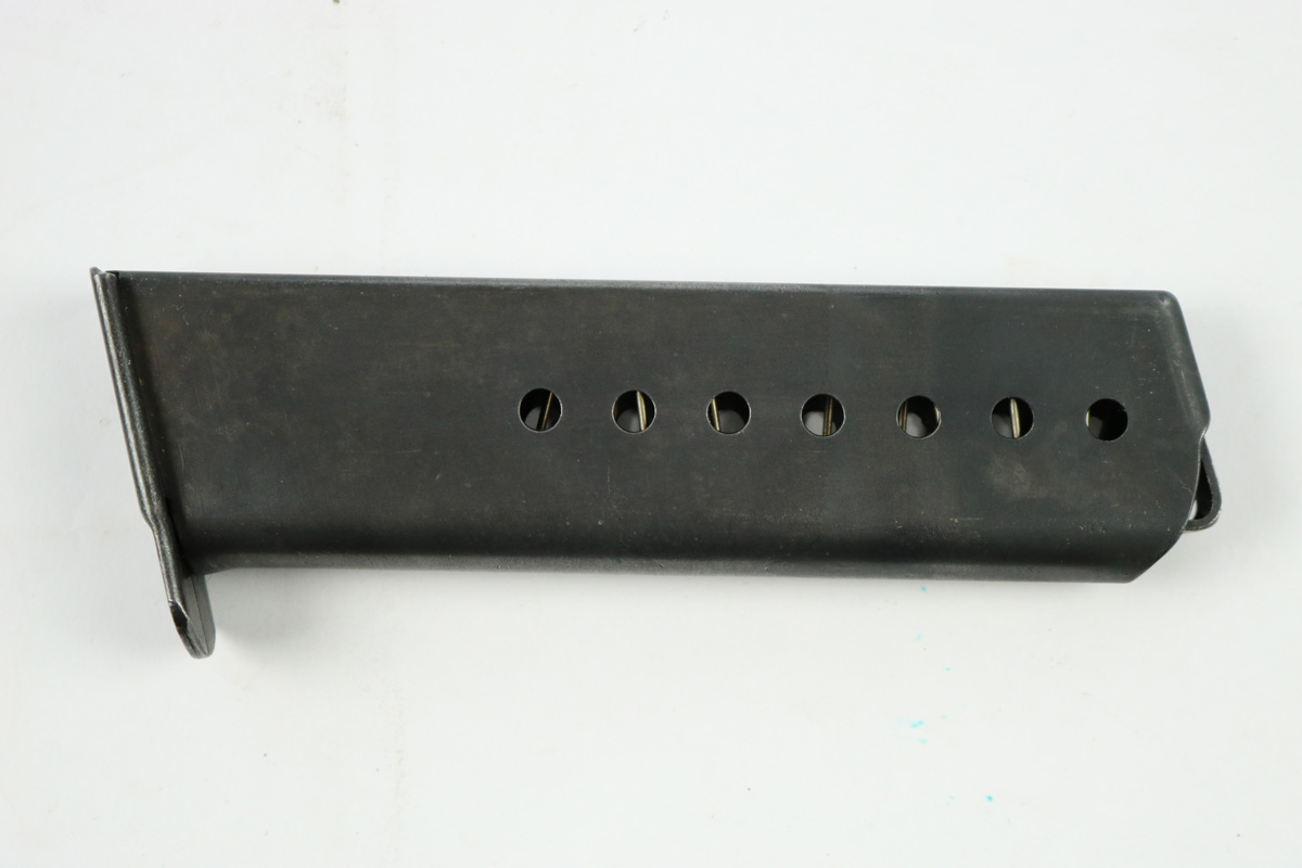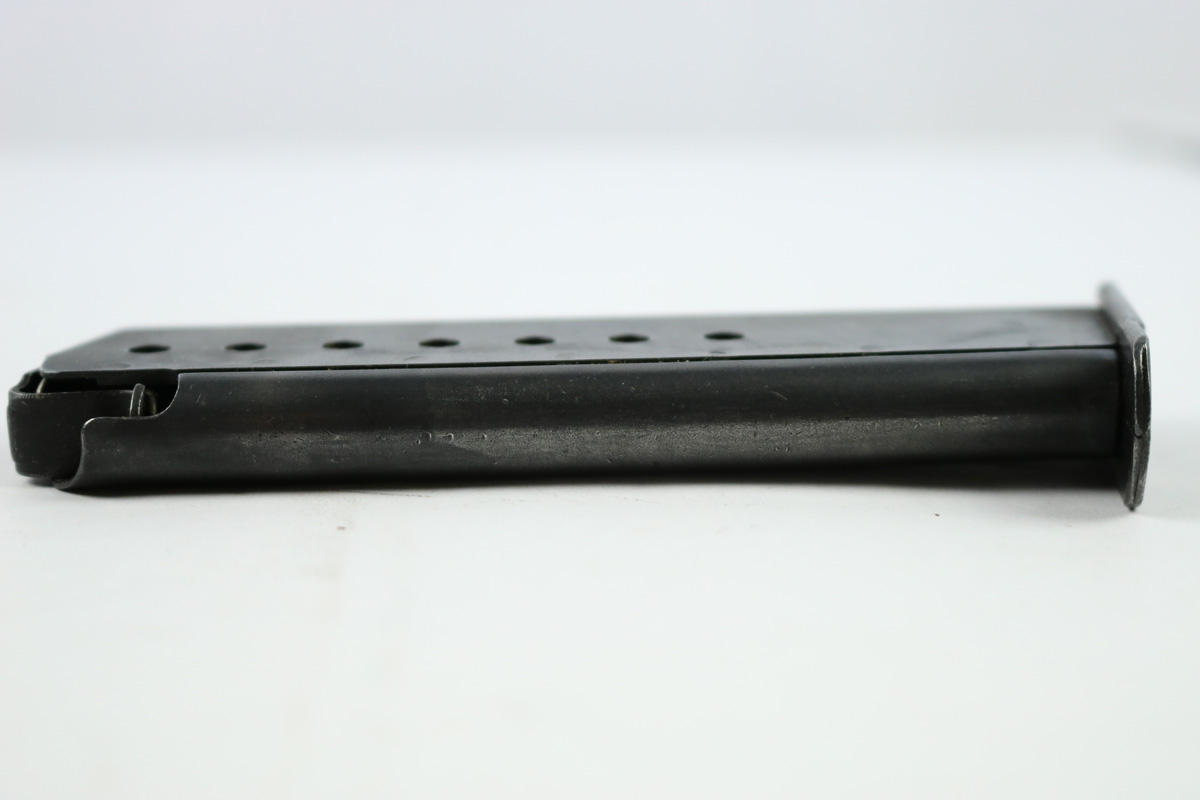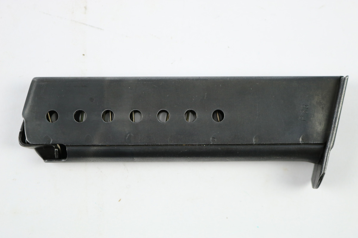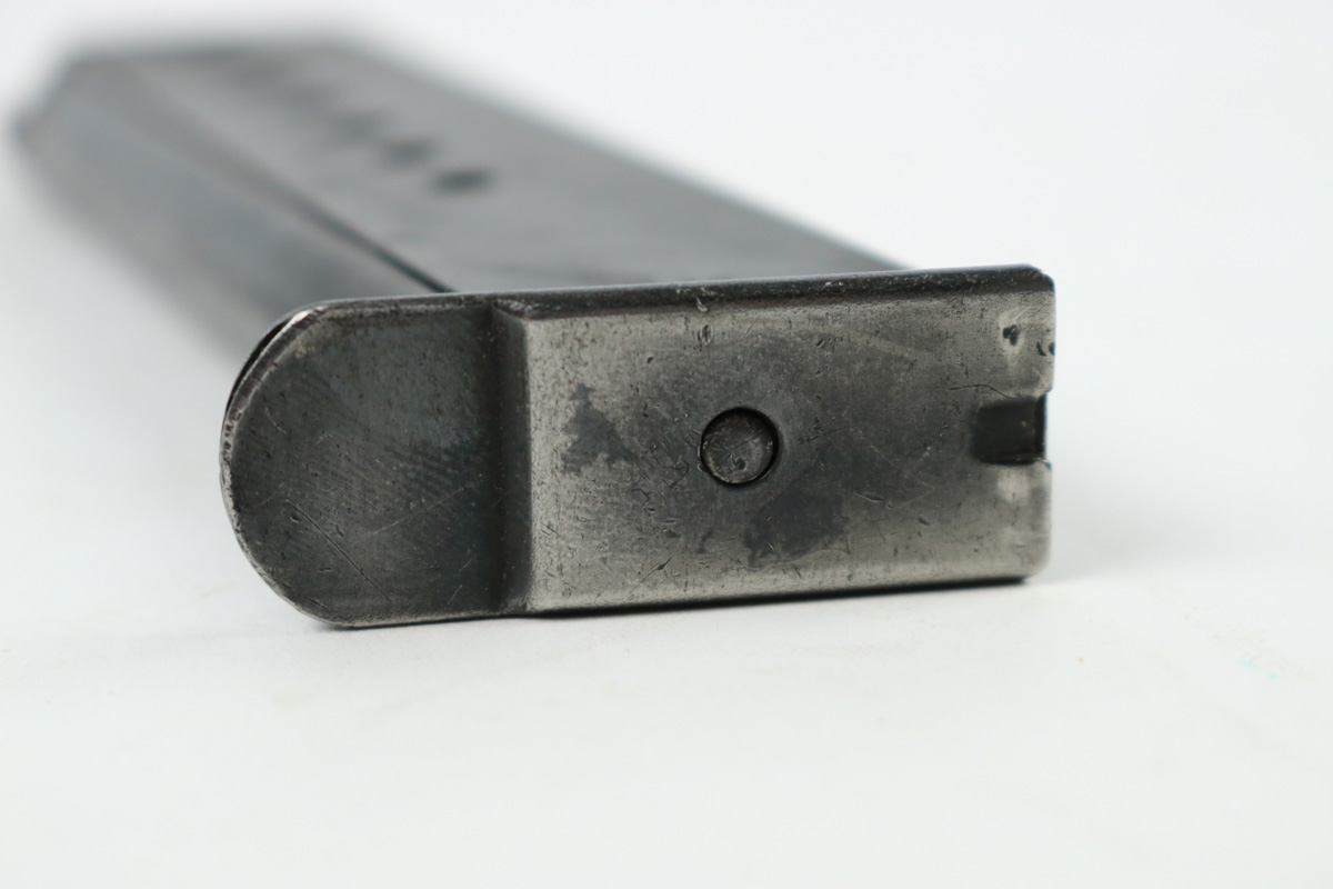 10/1/18 – This is an original early variation Walther P.38 magazine. The spine of the magazine has two eagle/359 proof stamps, as opposed to just one stamp seen on most. The magazine is all original with a fully functional spring. However, the follower is the only internal part that’s eagle/359 proofed (price reduced accordingly). The floorplate and base plate are both unmarked, yet WW2 era original. There’s minimal bluing loss on the magazine frame, but the base does show a little more significant bluing loss and wear. There’s no serial number on the base. Guaranteed original.