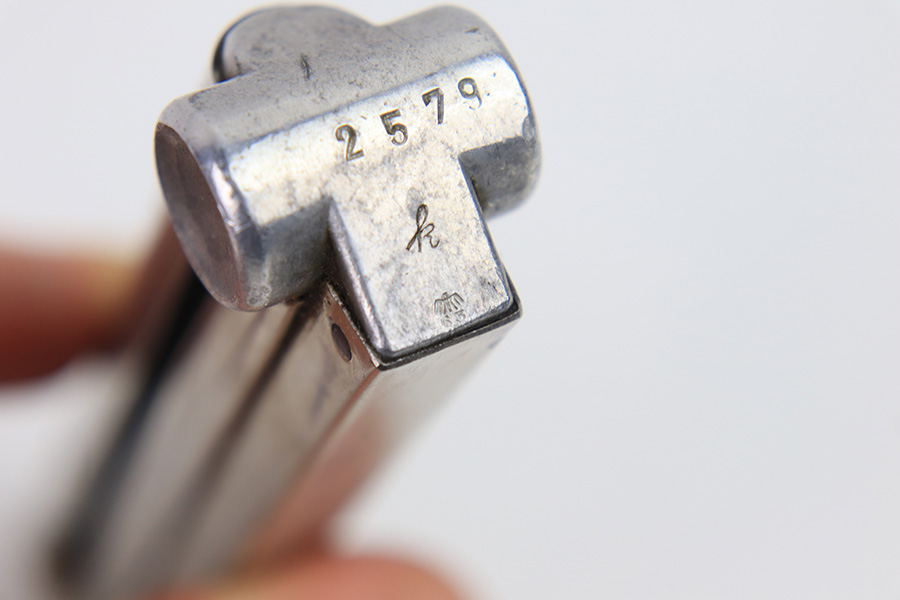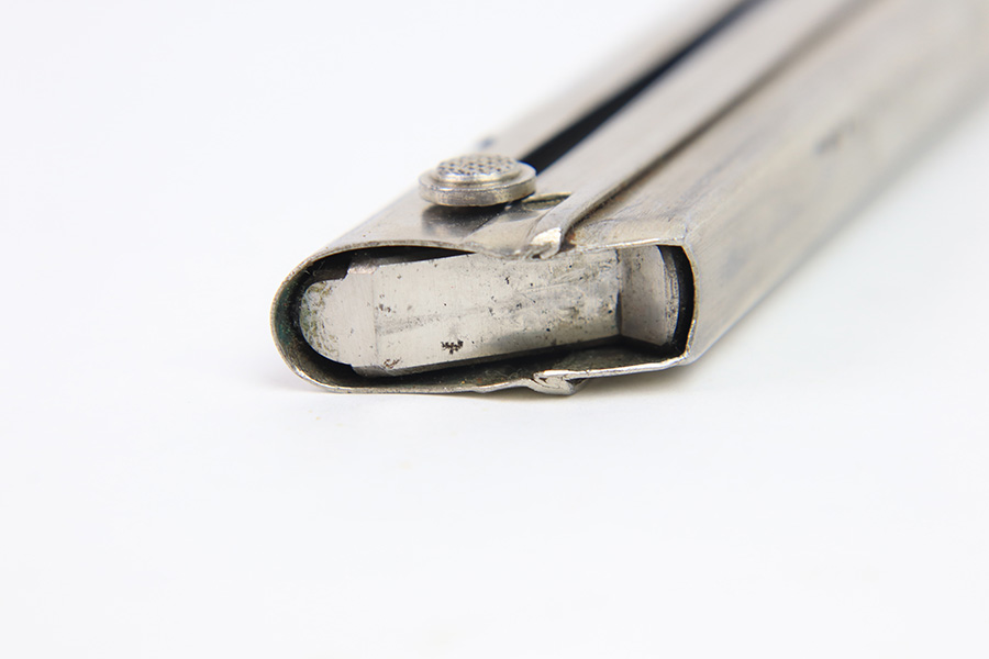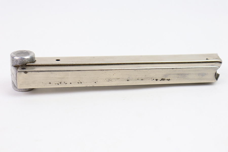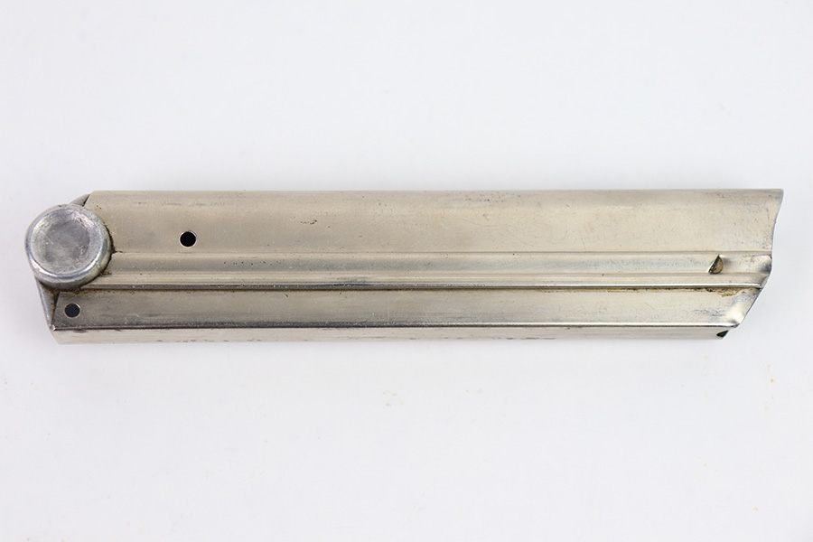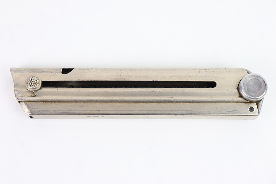 12/27/22 – This is an early WW2 production Luger magazine with a nickeled tube and aluminum base. The base is serial numbered and proof stamped with a droop winged eagle 63 proof. Excellent overall condition with some mild surface patina but no rust or pitting. Strong, fully functional spring.