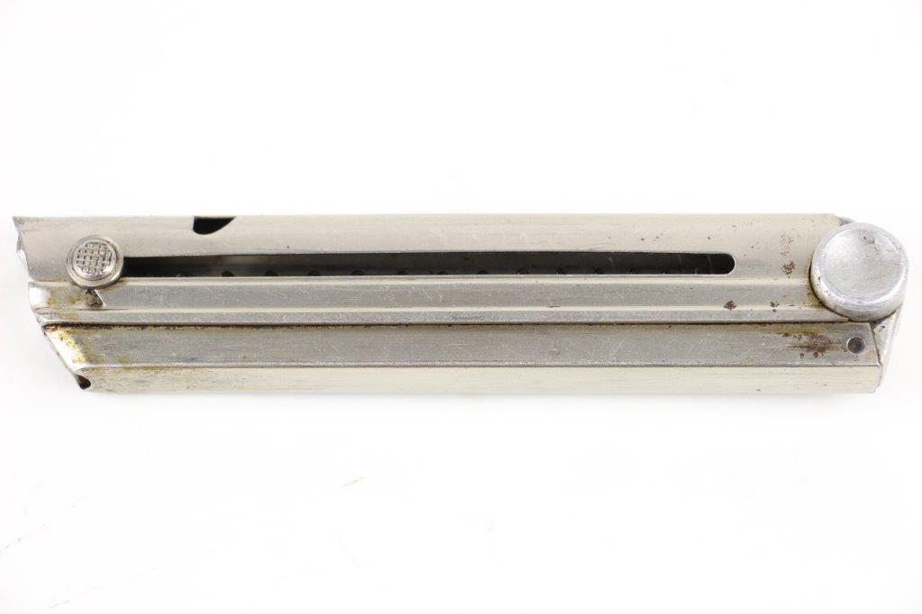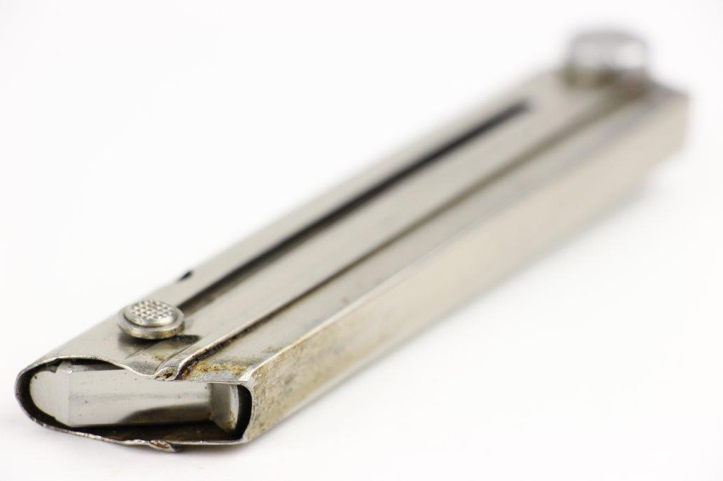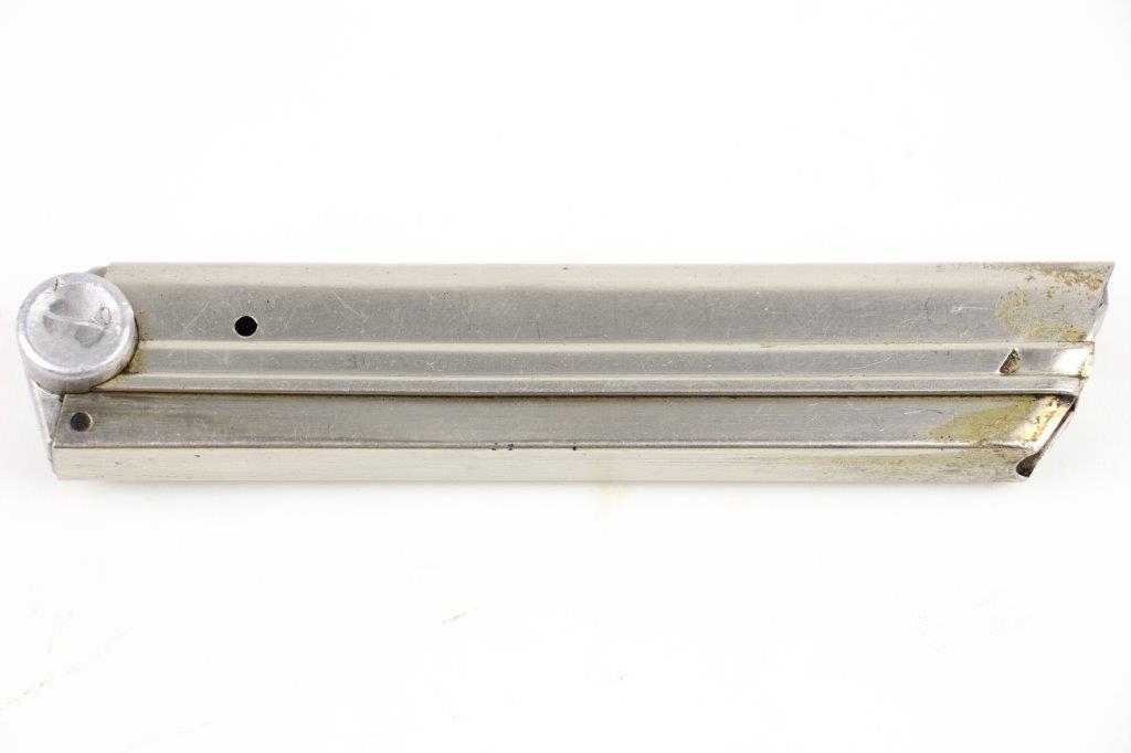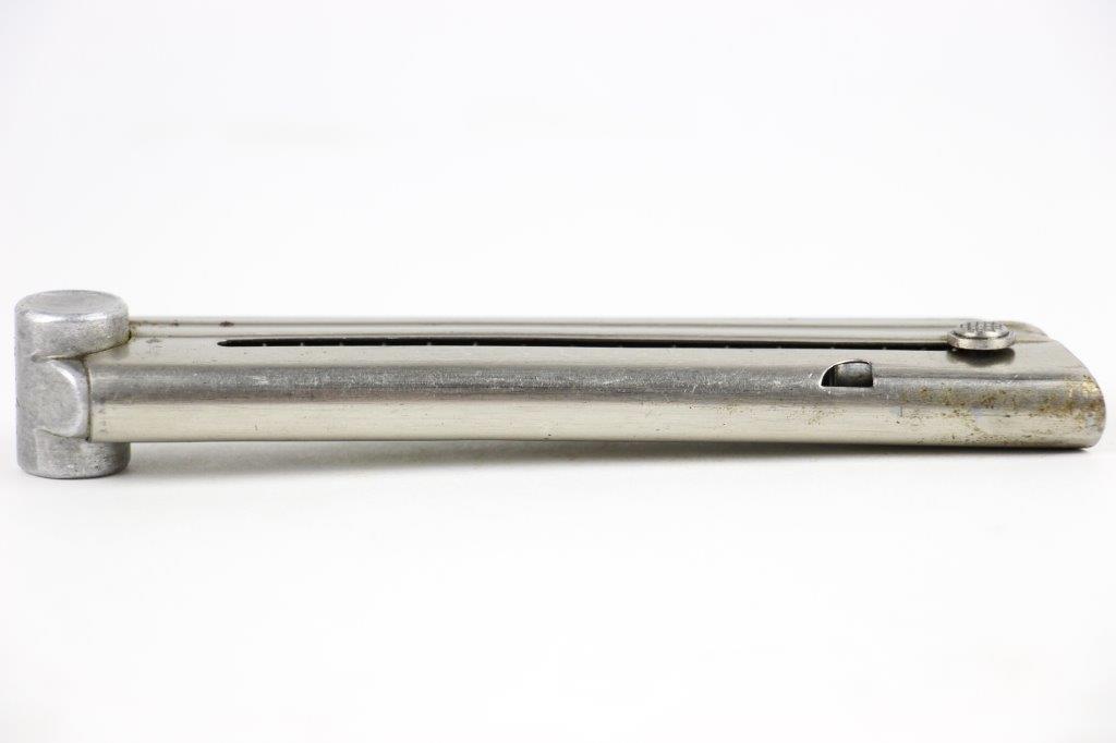 5/28/24 – This is an original, early WW2 production Luger magazine. This example has early features like a nickel finished tube and droop eagle/63 proof stamp on the base. The tube has light surface scratches and a few spots of discoloration but is in great overall condition. There’s no rust or pitting. The base is aluminum and stamped with a serial number 1696L and a military proof stamp. Strong, fully functional spring.