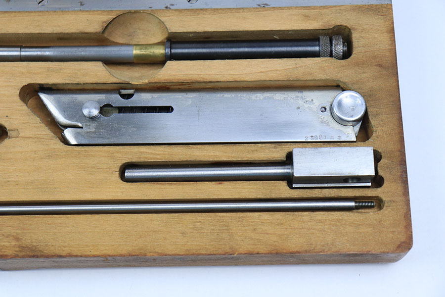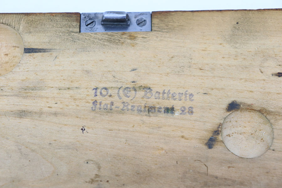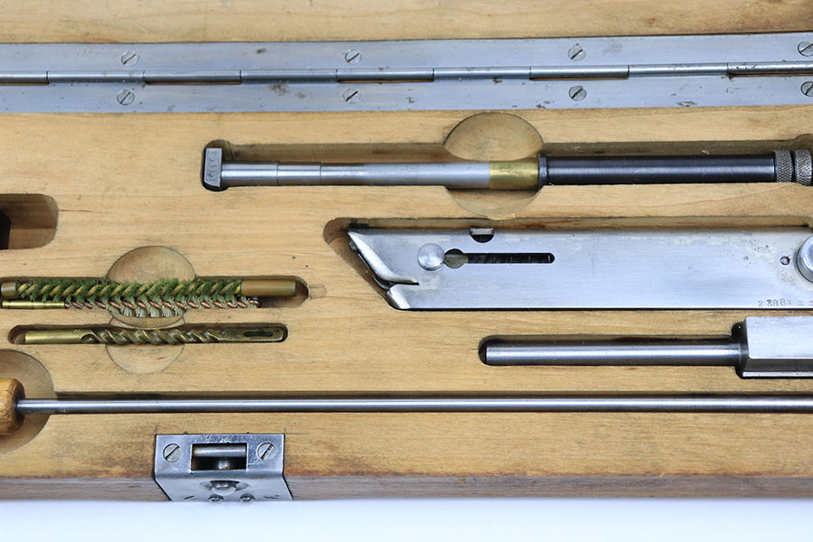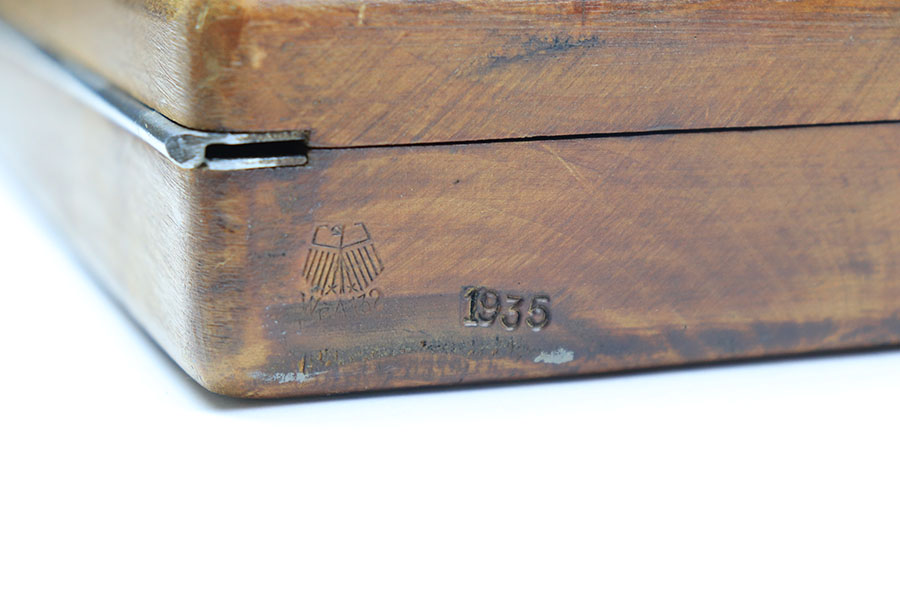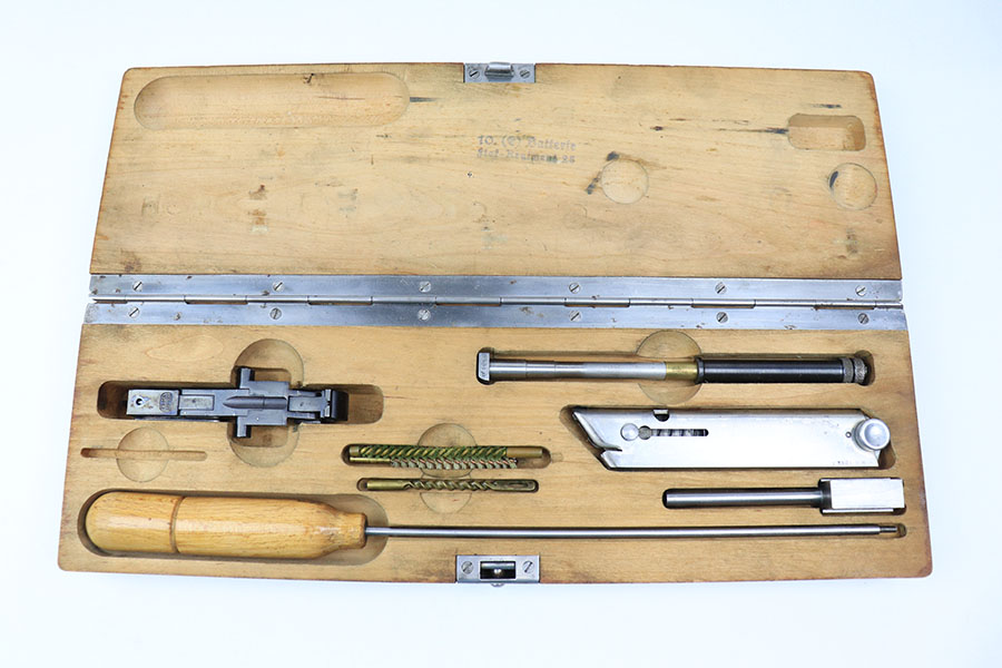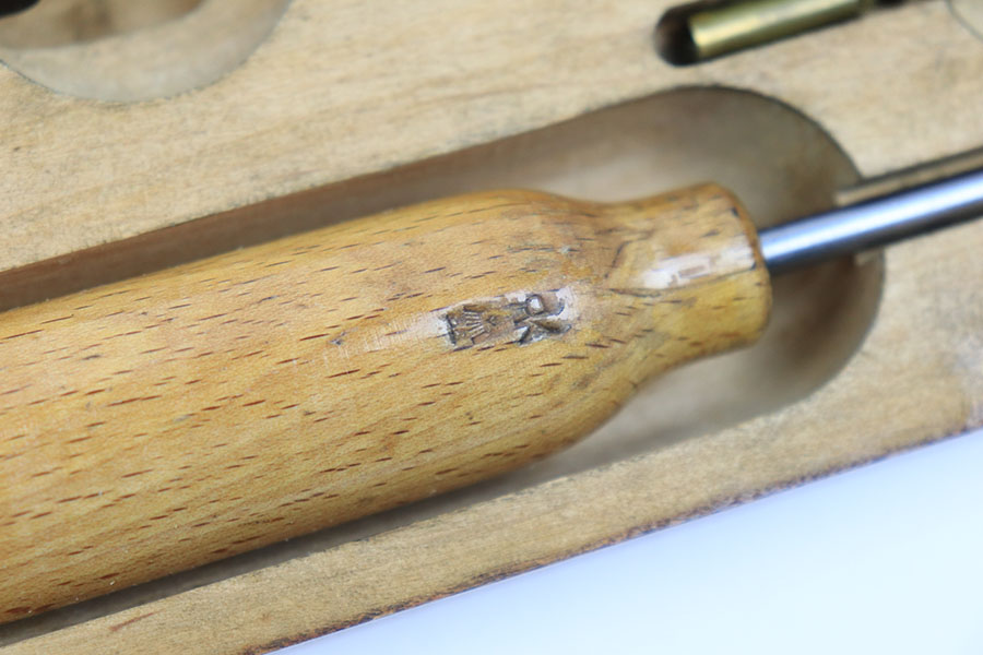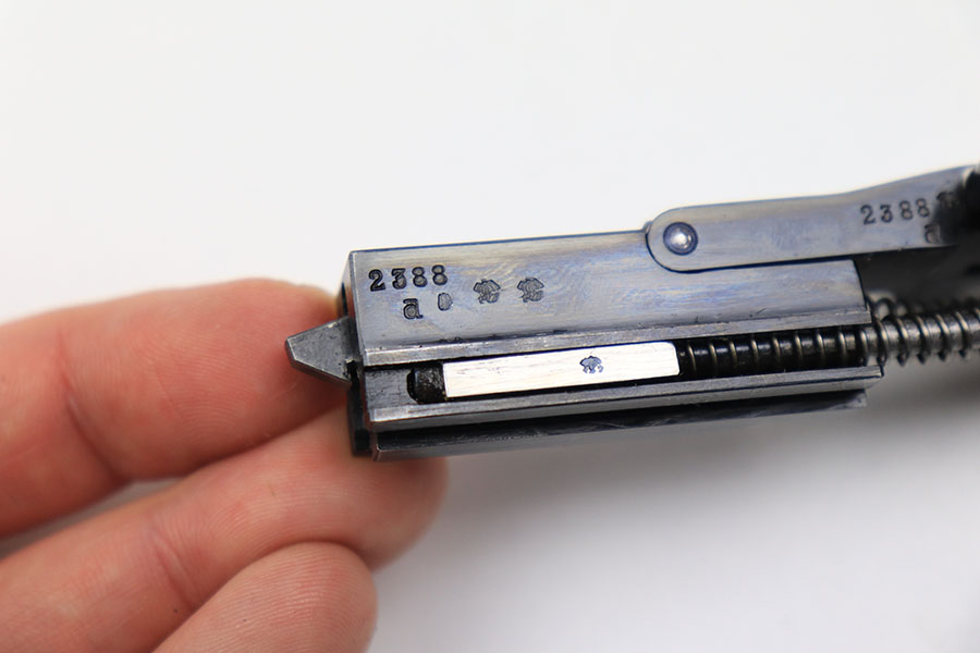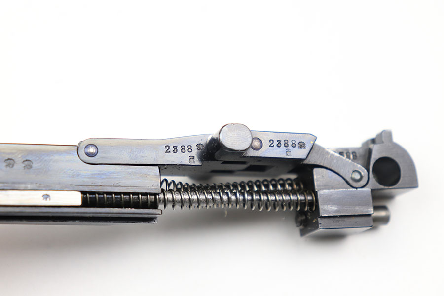 12/16/21 – This is an original, early WW2 production Erma / Erfurt .22 caliber Luger conversion kit. The kit is complete and matching. The wood box is waffen eagle stamped and 1935 dated on the exterior, and ink stamped on the interior (likely a unit stamp). The hinge functions without issue. The parts are all excellent. The magazine, toggle, and barrel are all matching serial numbered. The bore is about 7/10 with some mild surface wear and typical signs of aging but no excessive pitting or damage. The parts are all excellent, and functional as shown. These are very hard to find in this condition and fully complete / matching !