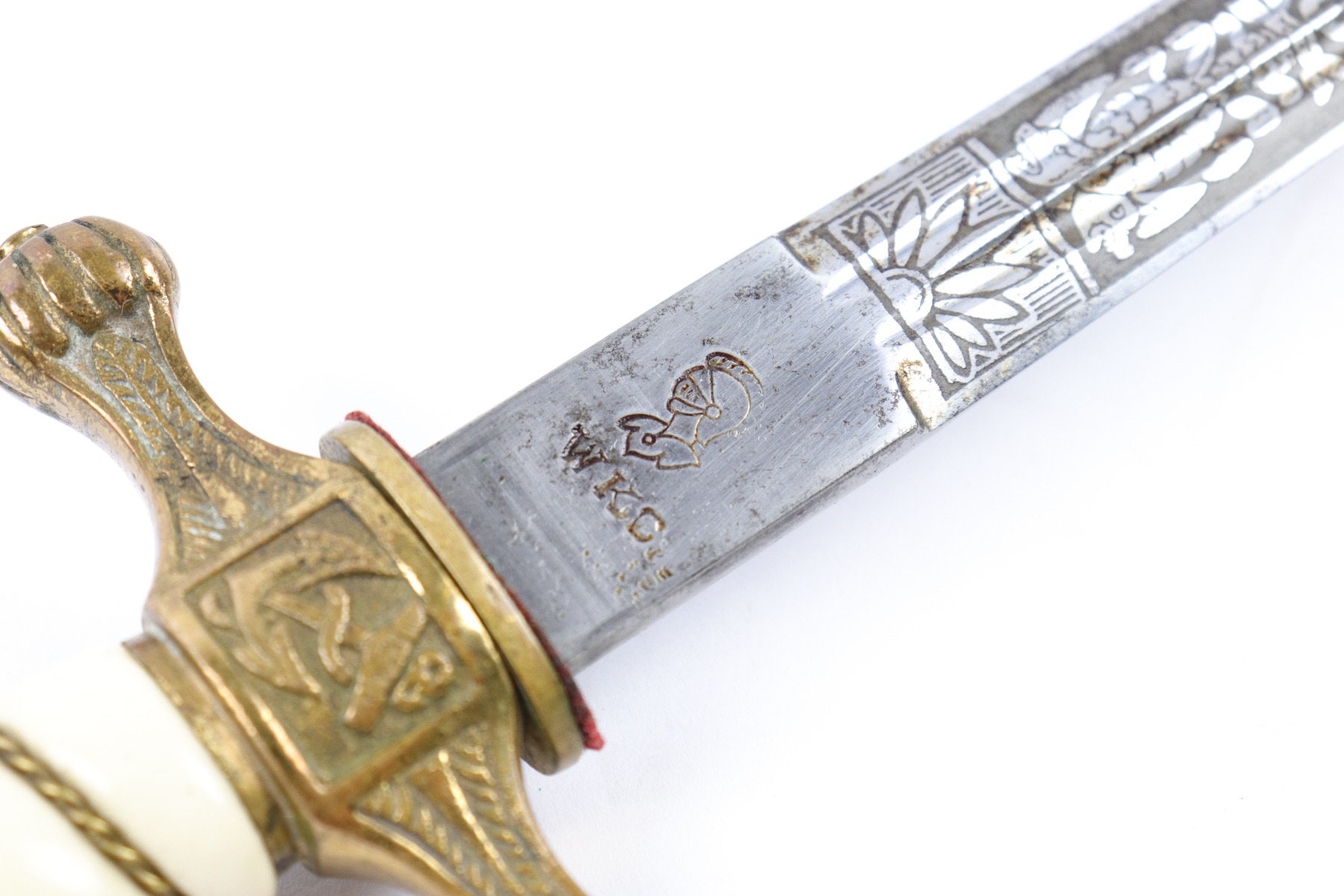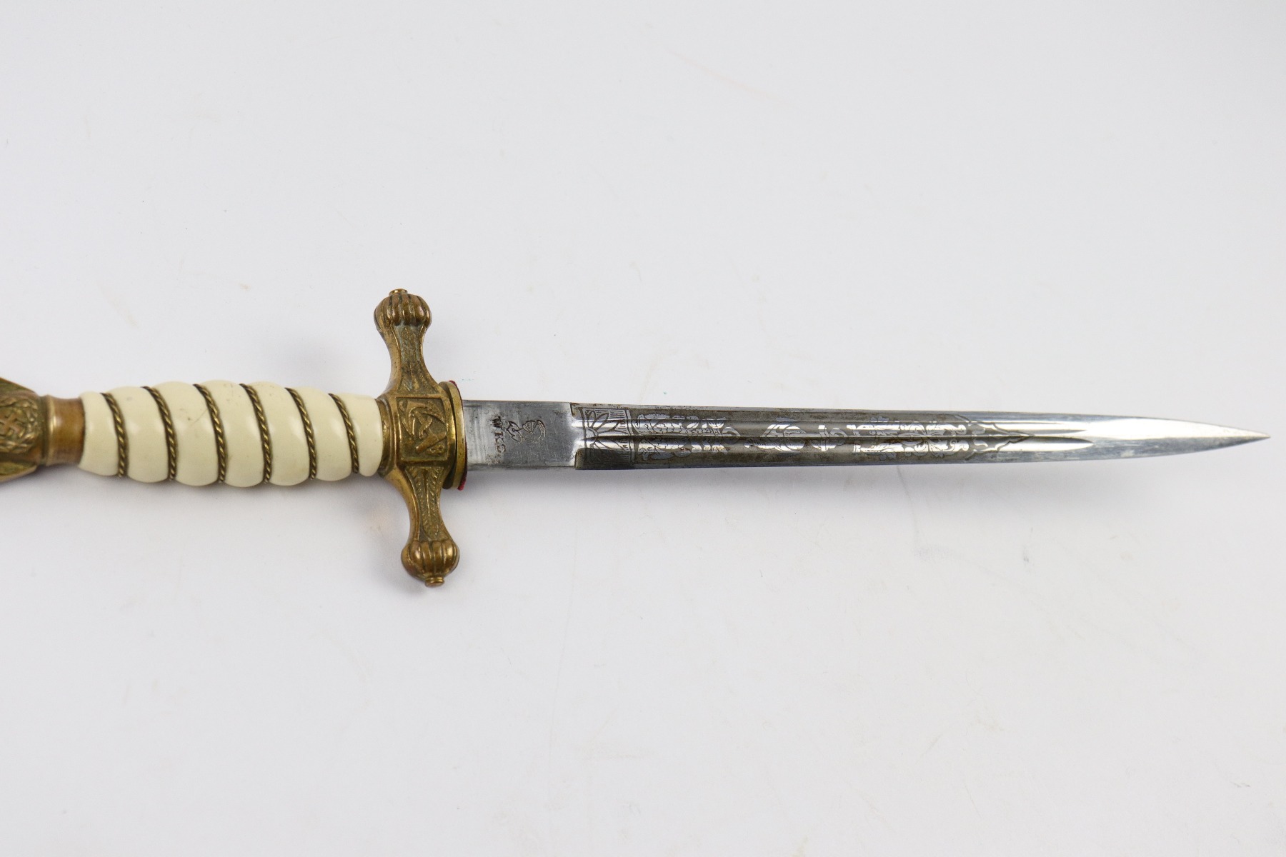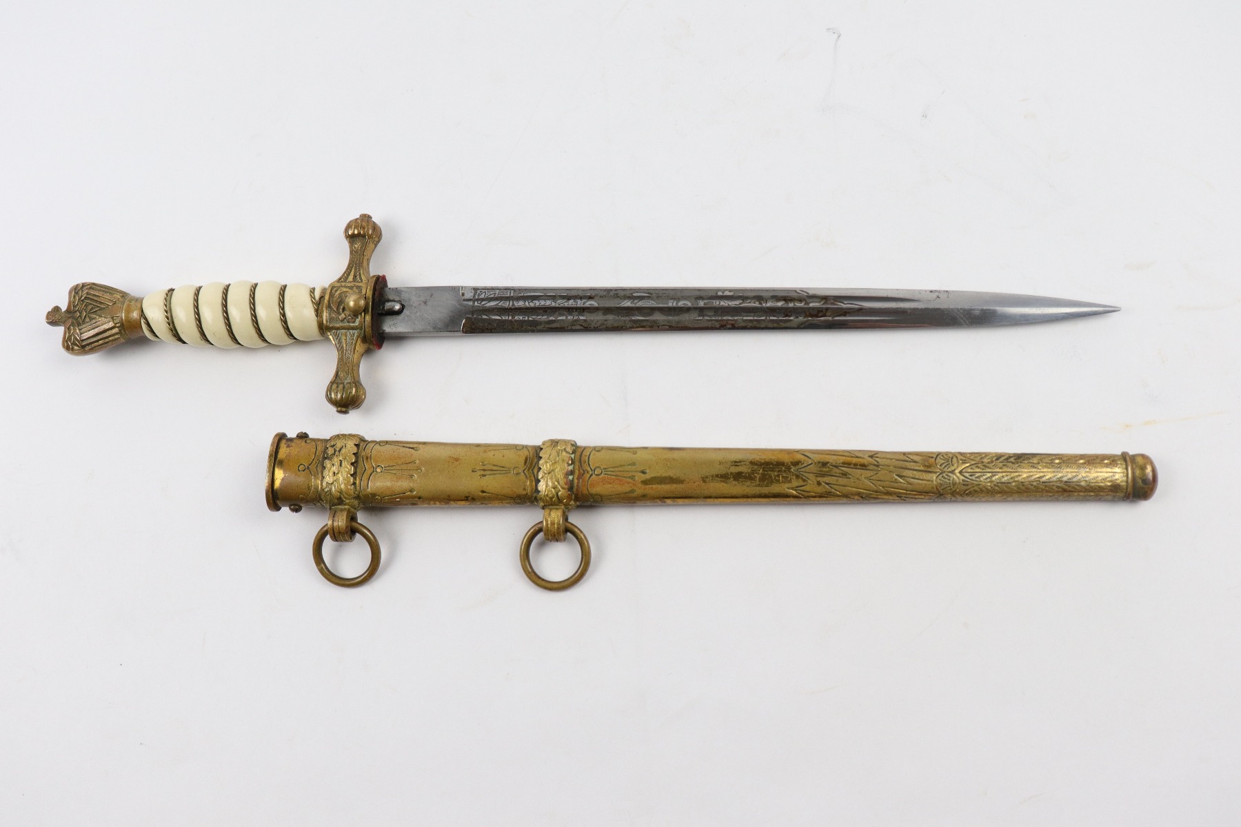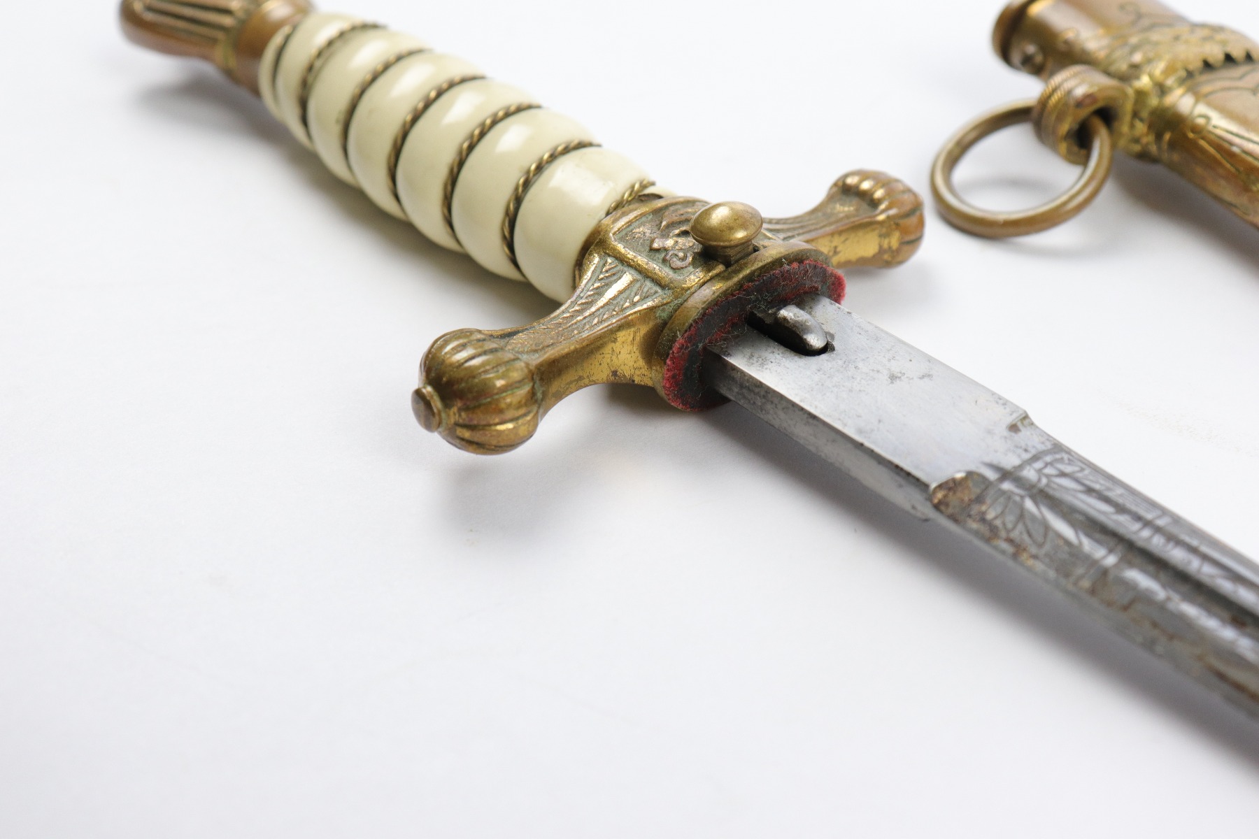 4/2/18 – This is an original, early/pre WW2 Kriegsmarine dagger. The blade is etched with a rope around an anchor and a floral pattern border. There is old oil caked into some of the etching, but this can be cleaned off with effort. Overall the blade is in excellent shape with light spotting in a few spots. The handle has no cracks or chips, but there is a light surface scratch or two – see photos (these are very small and minor). The scabbard has light aging wear but overall excellent. This early WKC made blade is pre WW2 production and in great shape overall – a nice collector’s piece.