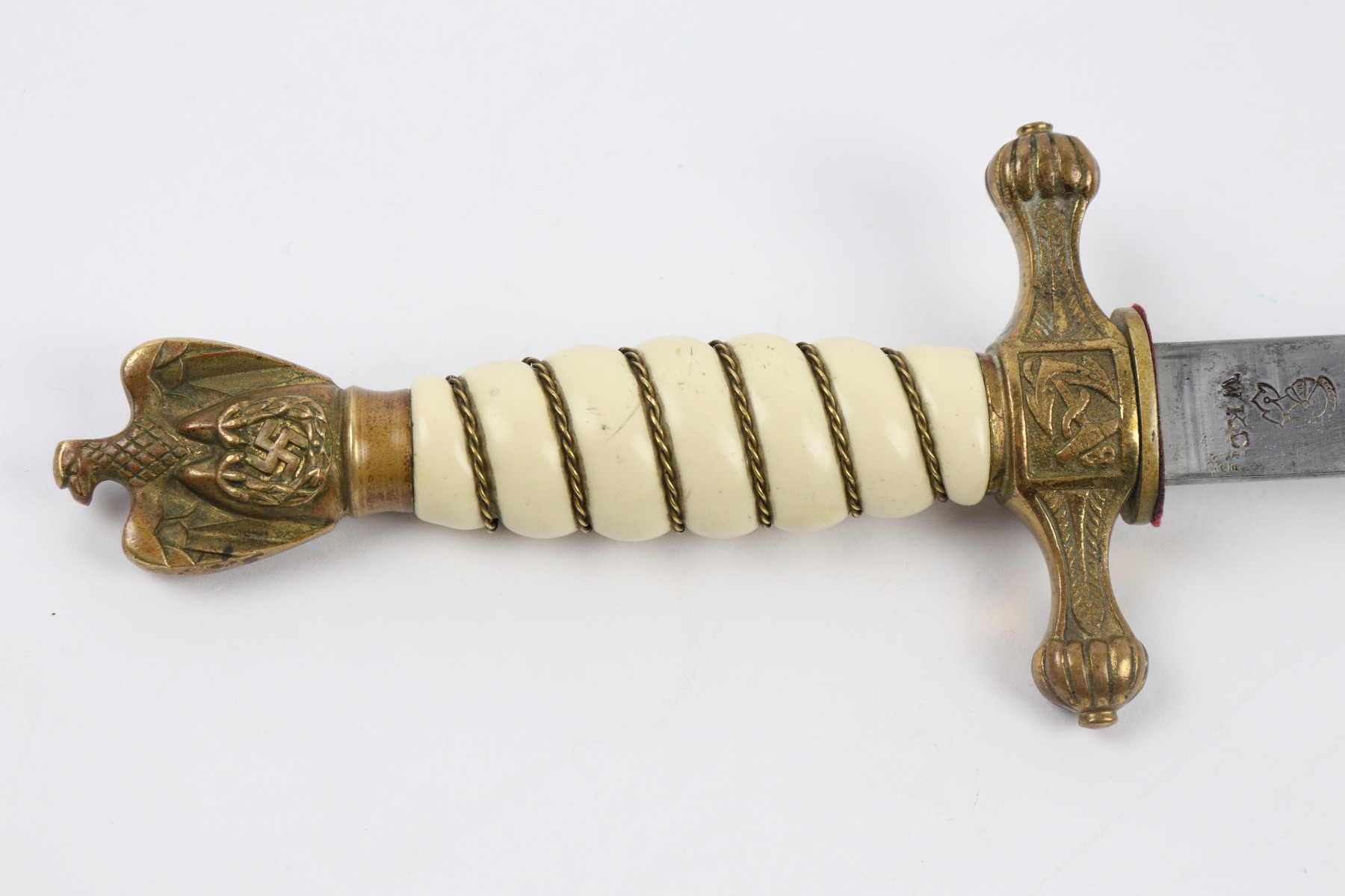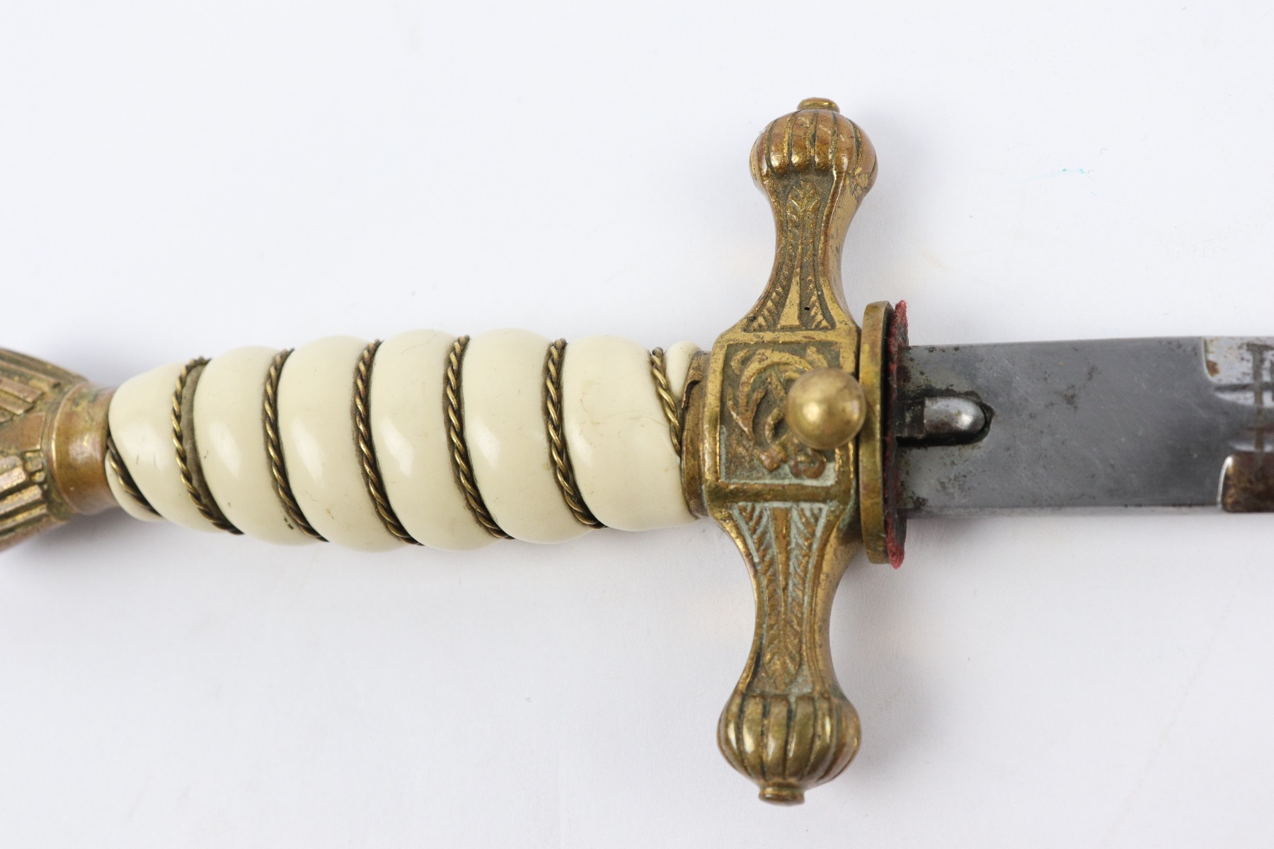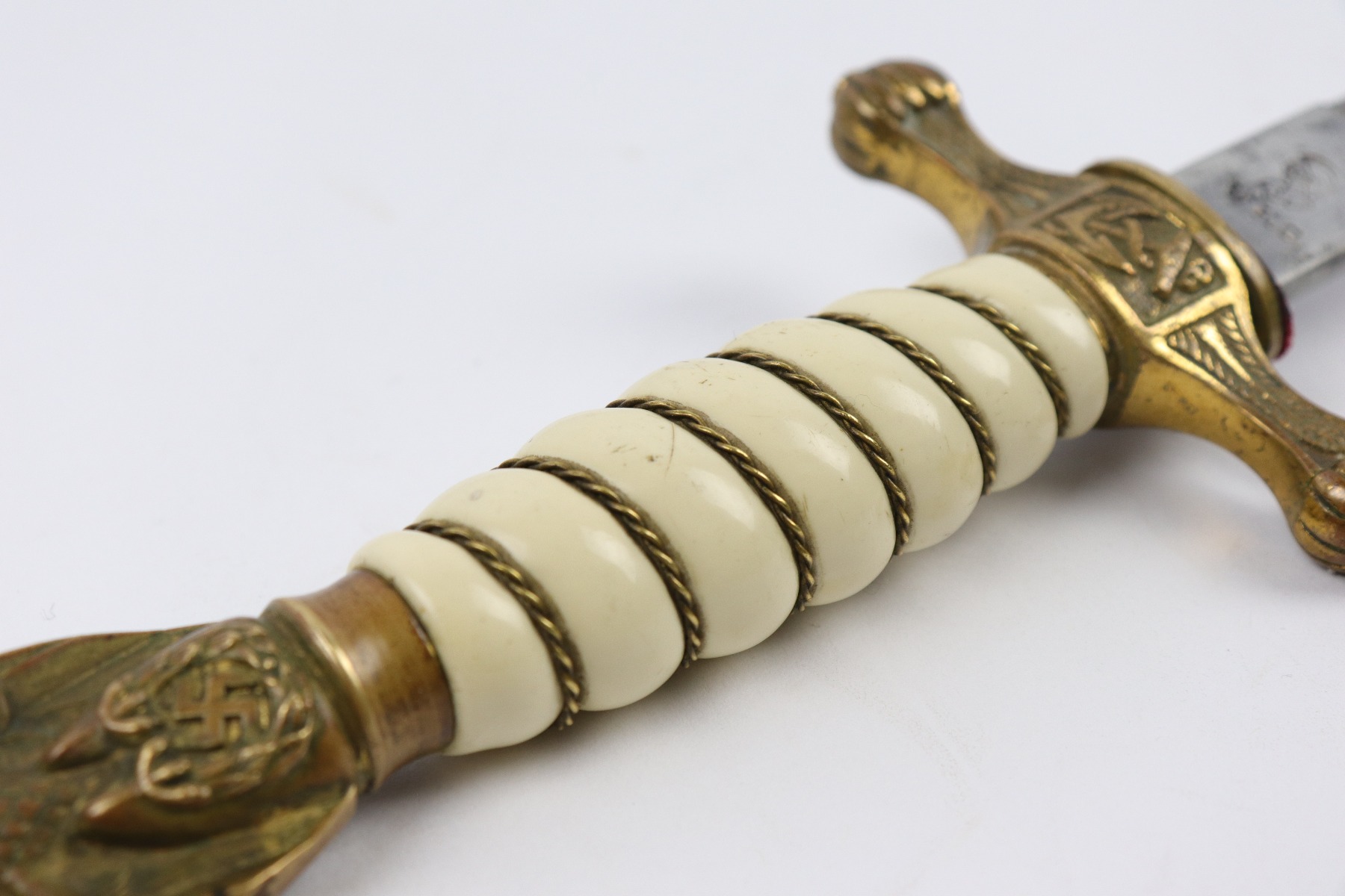 4/2/18 – This is an original, early/pre WW2 Kriegsmarine dagger. The blade is etched with a rope around an anchor and a floral pattern border. There is old oil caked into some of the etching, but this can be cleaned off with effort. Overall the blade is in excellent shape with light spotting in a few spots. The handle has no cracks or chips, but there is a light surface scratch or two – see photos (these are very small and minor). The scabbard has light aging wear but overall excellent. This early WKC made blade is pre WW2 production and in great shape overall – a nice collector’s piece.