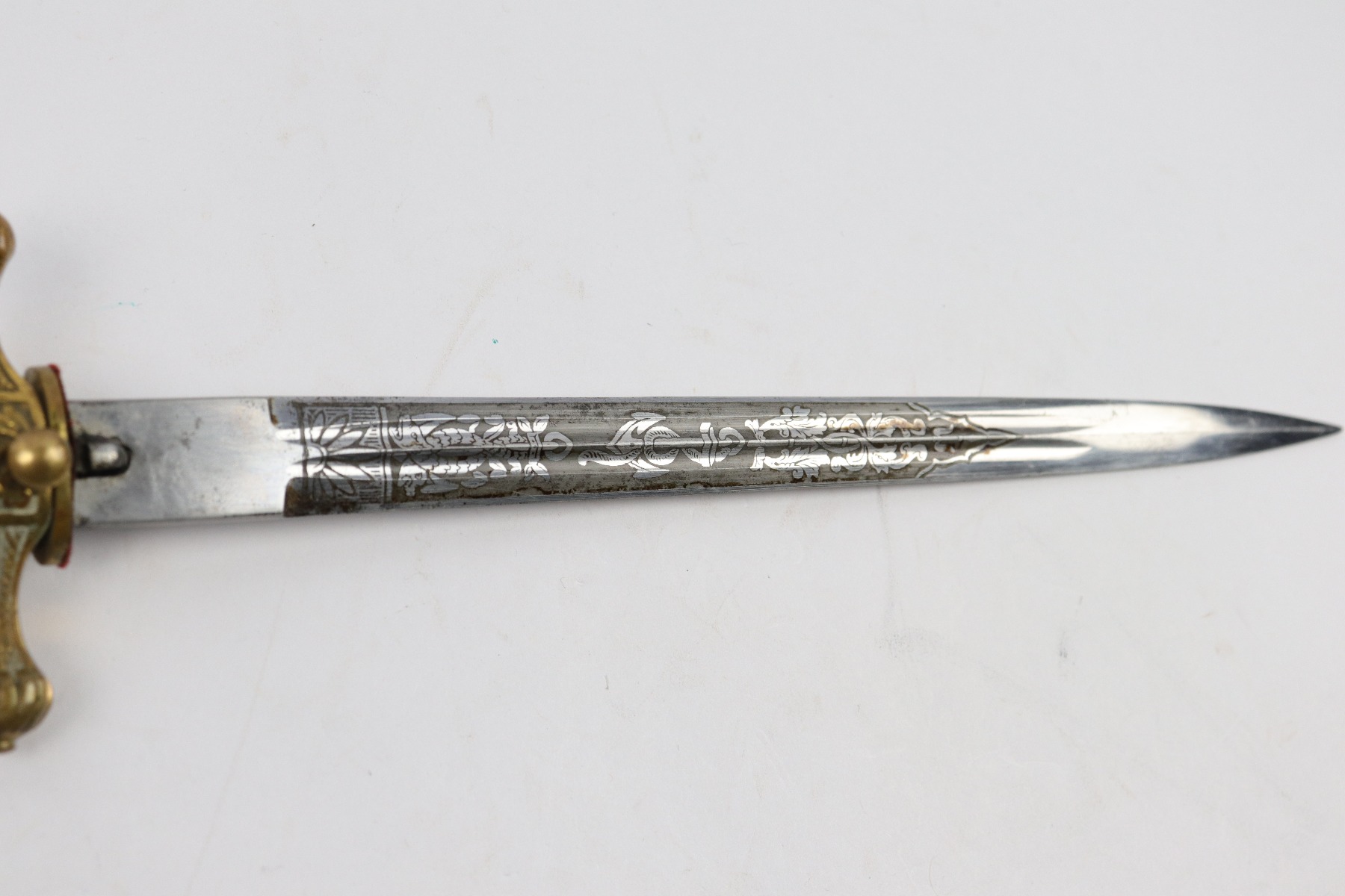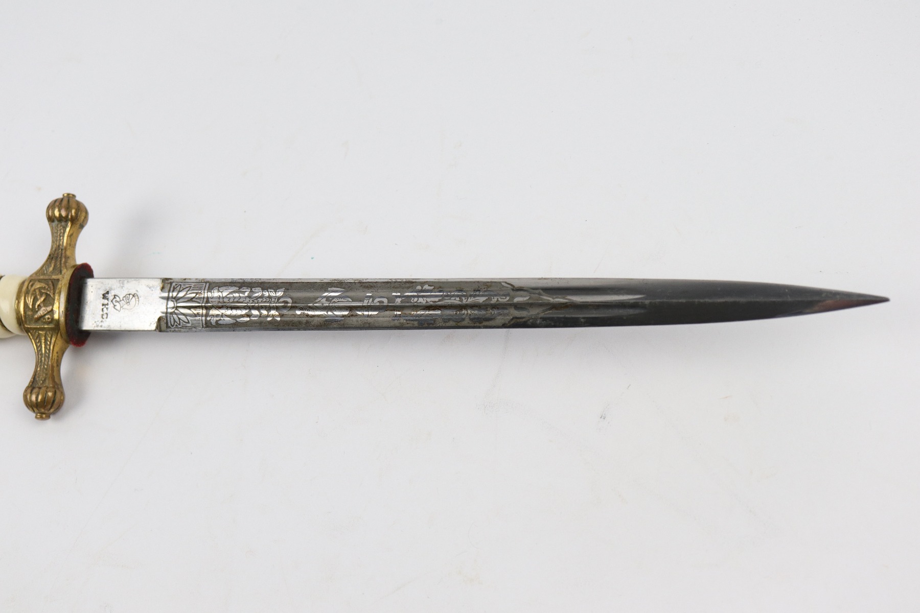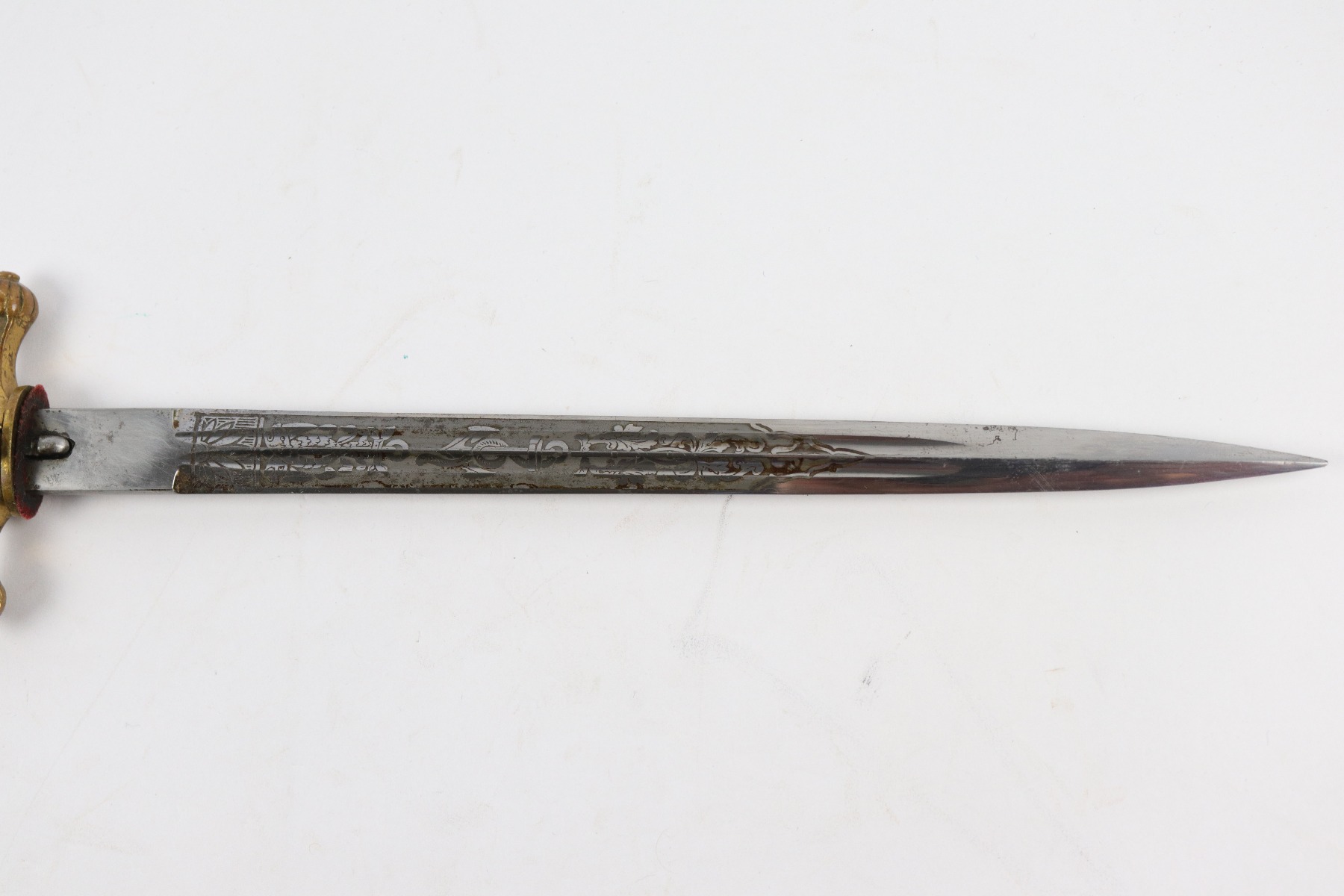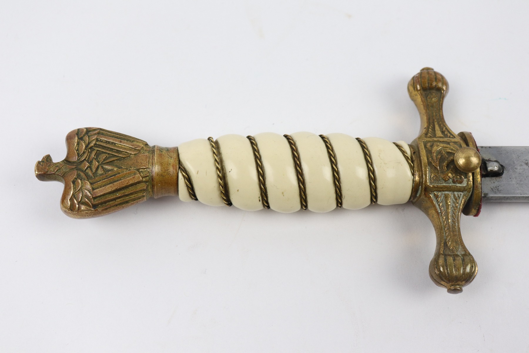 4/2/18 – This is an original, early/pre WW2 Kriegsmarine dagger. The blade is etched with a rope around an anchor and a floral pattern border. There is old oil caked into some of the etching, but this can be cleaned off with effort. Overall the blade is in excellent shape with light spotting in a few spots. The handle has no cracks or chips, but there is a light surface scratch or two – see photos (these are very small and minor). The scabbard has light aging wear but overall excellent. This early WKC made blade is pre WW2 production and in great shape overall – a nice collector’s piece.