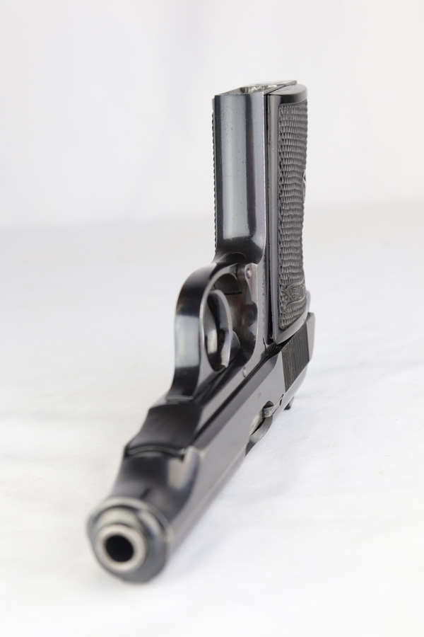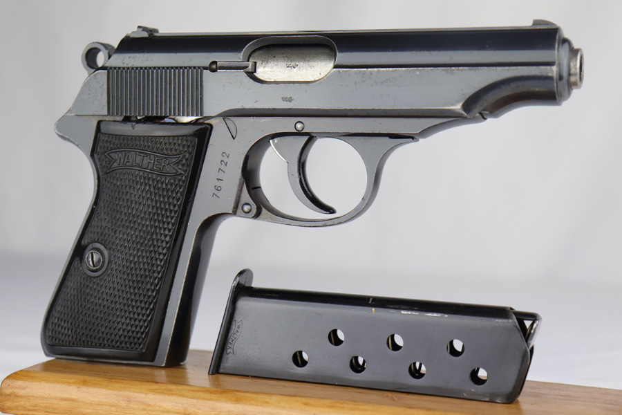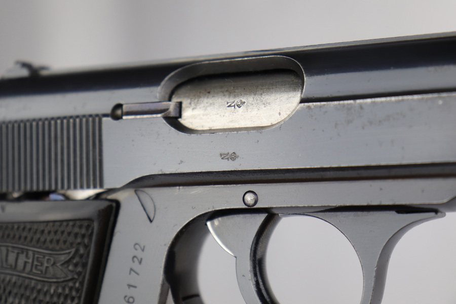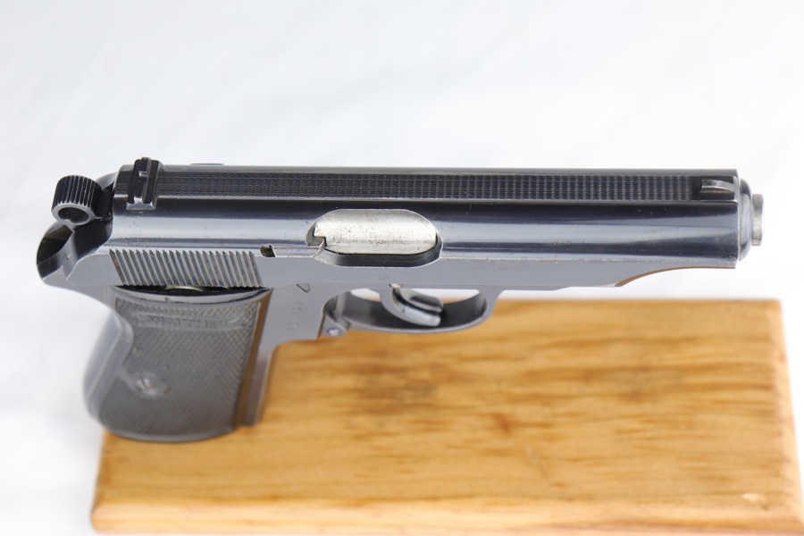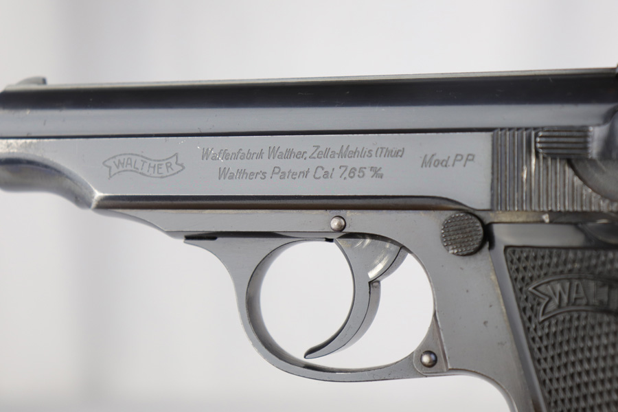 3/13/19 – This is an original pre WW2 commercial Walther PP pistol. The serial number puts the date of production around 1930 / 31 . The pistol has early features like a 90 degree safety, reversed serial numbering, covered firing pin, large ring hammer and early high polish finish. The grips are also the early weighted variation. The overall finish is about 96% with high edge wear and minor speckling on the right side of the slide. The straps are especially nice for the age of the gun. The bore rates about 8.5/10 with strong rifling and minor amounts of corrosion. Comes with an excellent banner only magazine. Original and fully functional, however the trigger pull is about as far back as it can go when the hammer is cocked. Excellent example of a very early Walther PP at a very reasonable price.