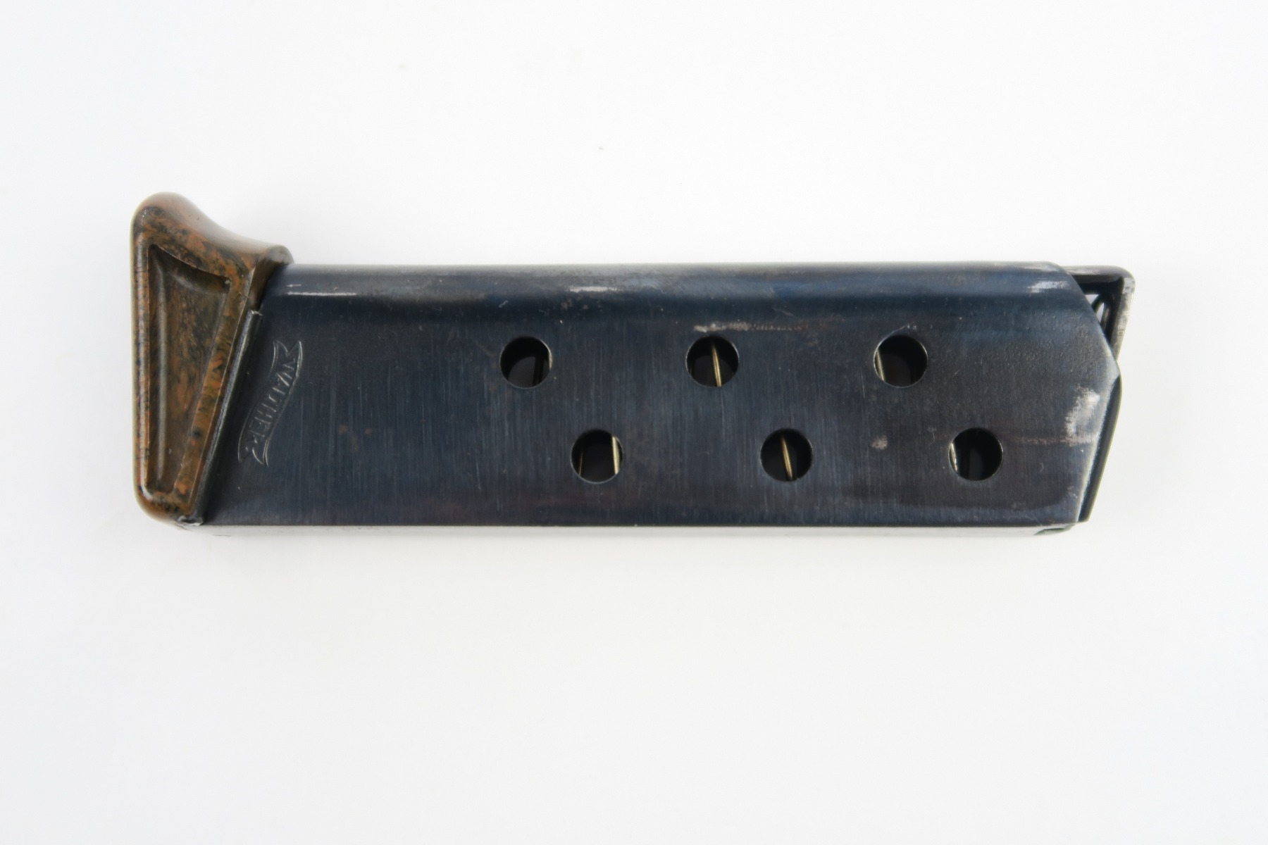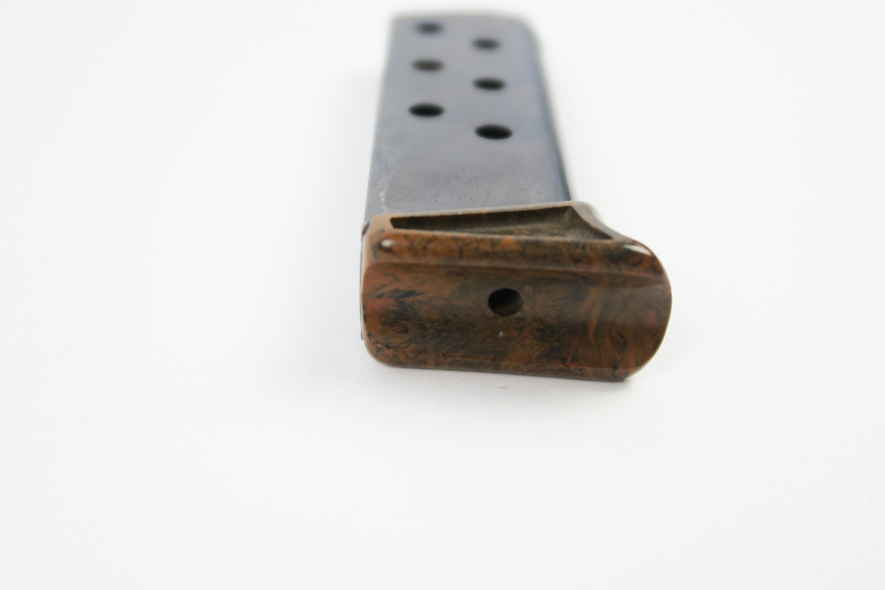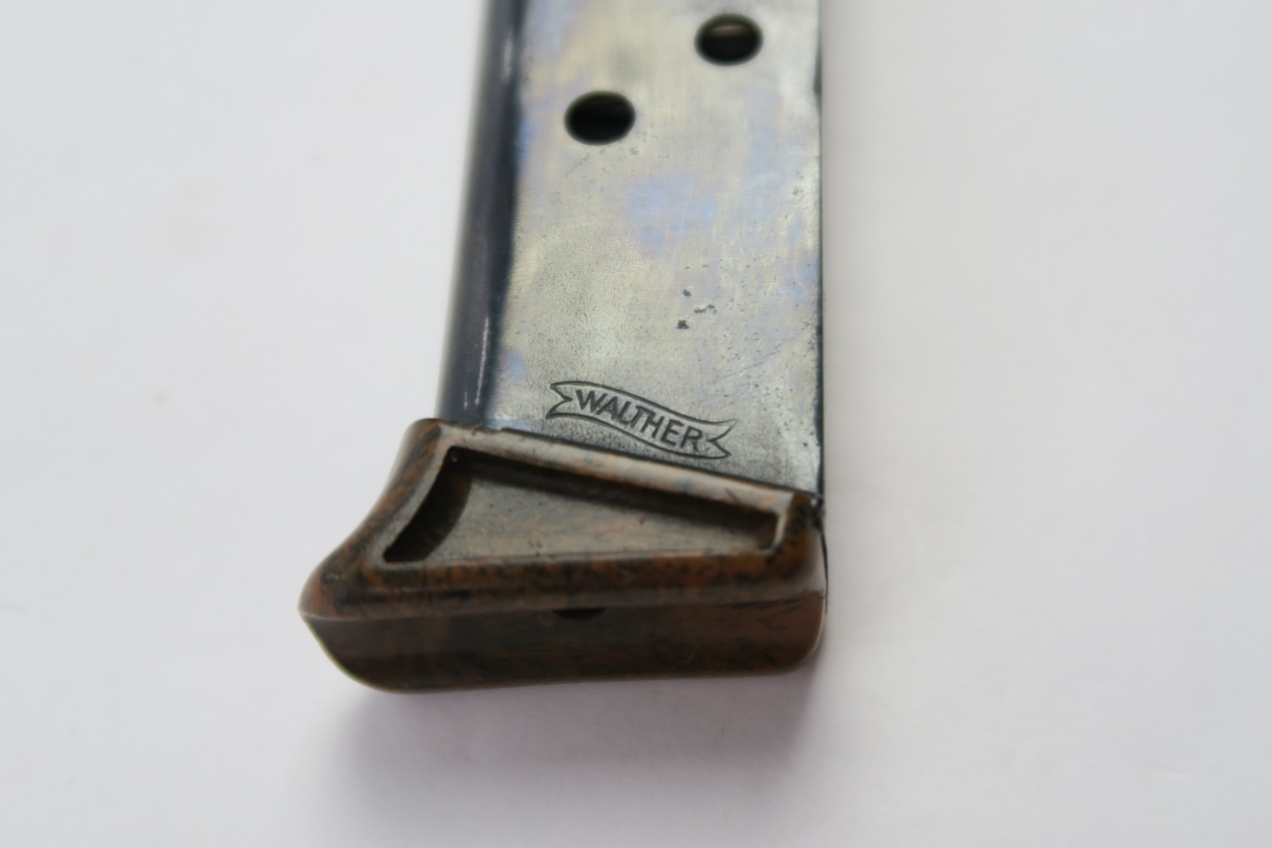 3/21/18 – This is an original Walther PPK finger extension magazine with early / pre WW2 features. The magazine base is a bakelite finger extension with a thin-lip. The magazine is also stamped with a Walther banner only. The magazine is in excellent condition and there are no cracks or chips in the bakelite finger extension. Guaranteed original and authentic.