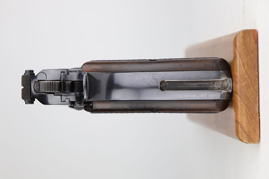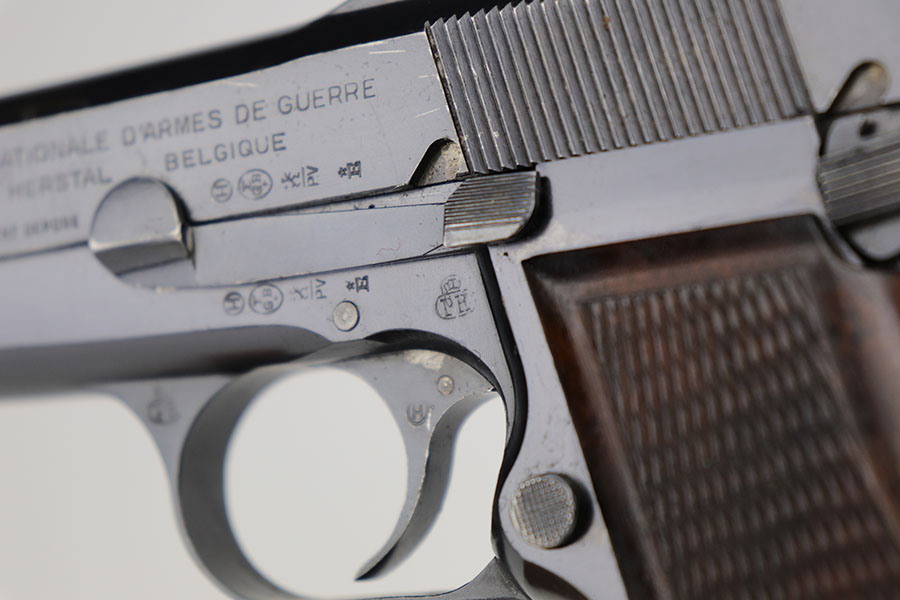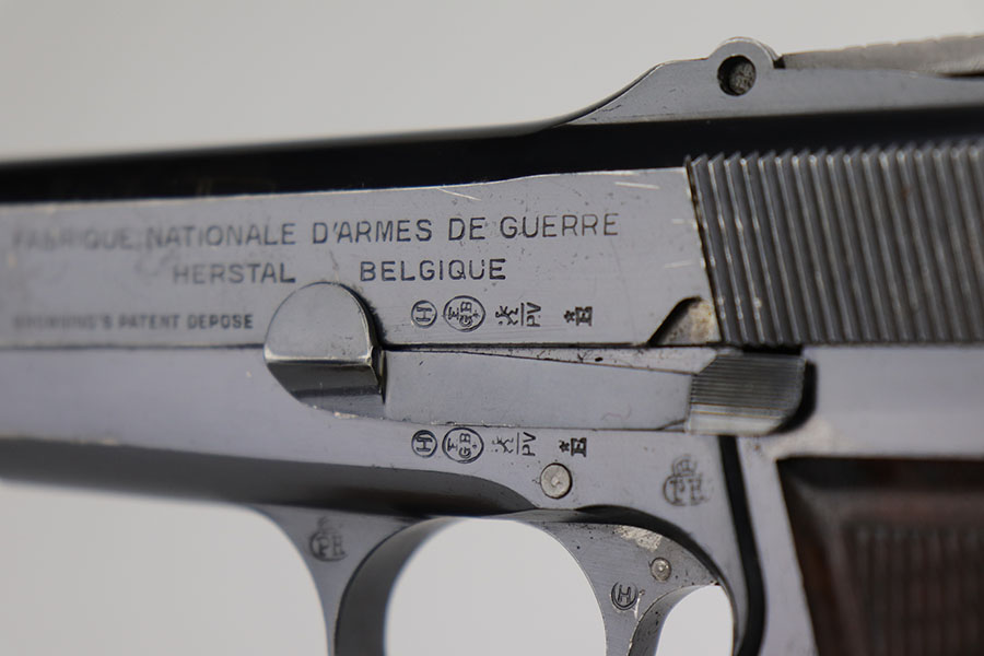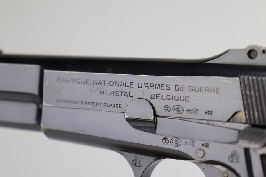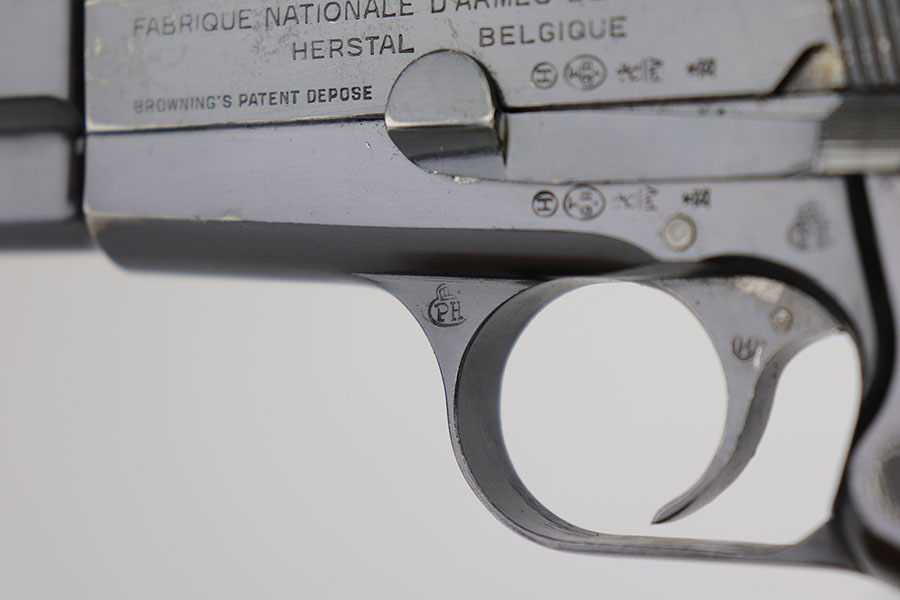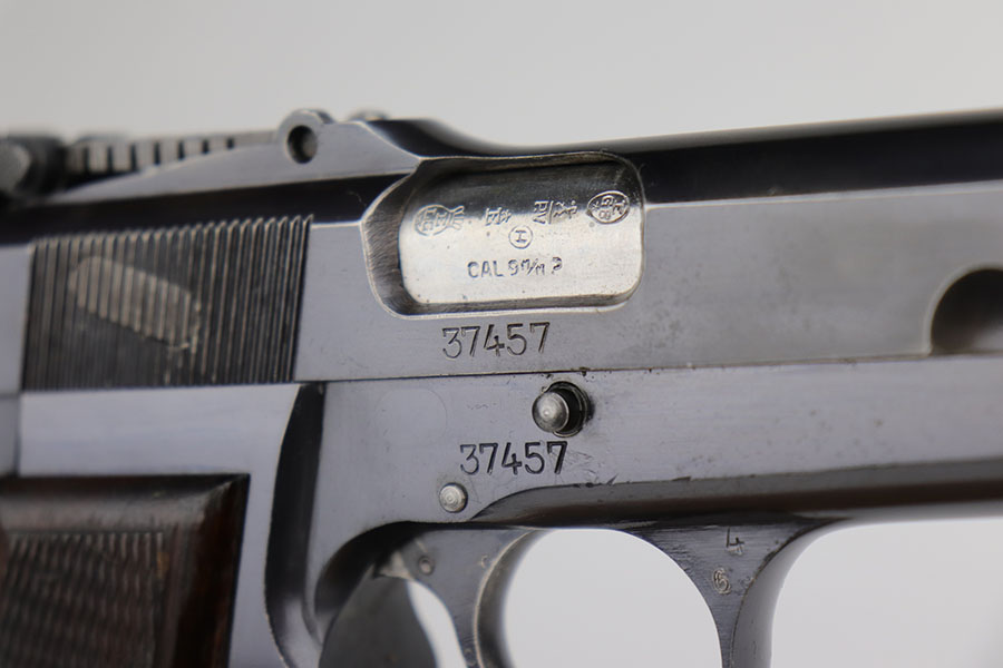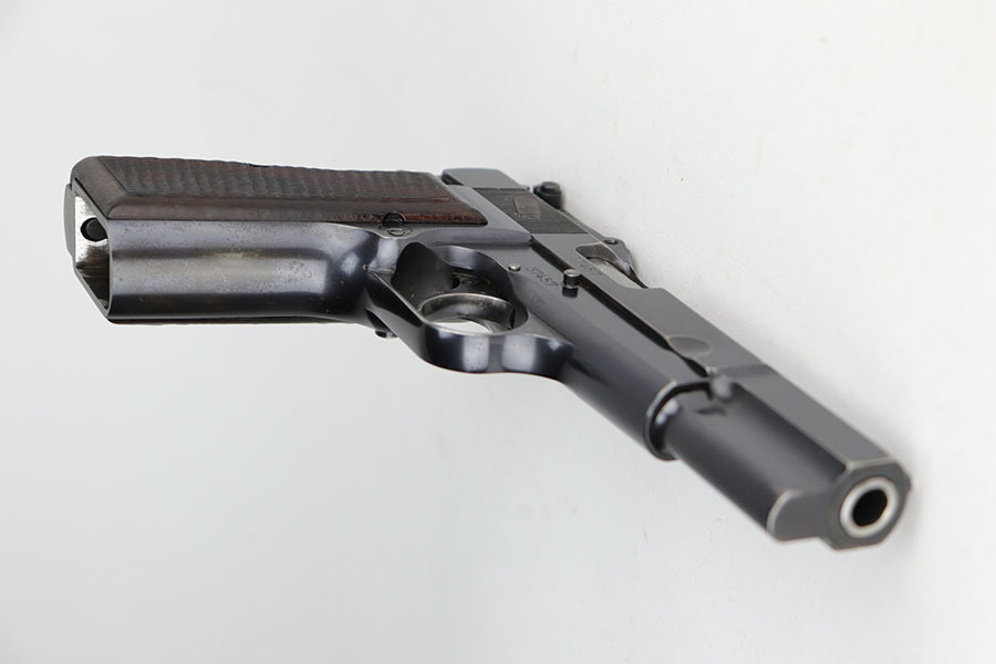 11/20/20 – This is a very nice and original example of a prewar FN Browning High Power issued to the Belgian military. The pistol is all matching with about 93-94% of the polished blue remaining. There’s minor high edge wear on either side but generally the profile looks great. Most of the bluing loss is on the front strap. The pistol correctly has the Circle H proofs on most of the parts, and also has the serial number on the frame under the grips, which is specific to this contract. Correct early grips with painted red backing, and they’re in minty condition. Bore has strong rifling but a bit of freckling in the grooves. Unmarked magazine. Tangent rear sight and stock slot in frame are also desirable features.