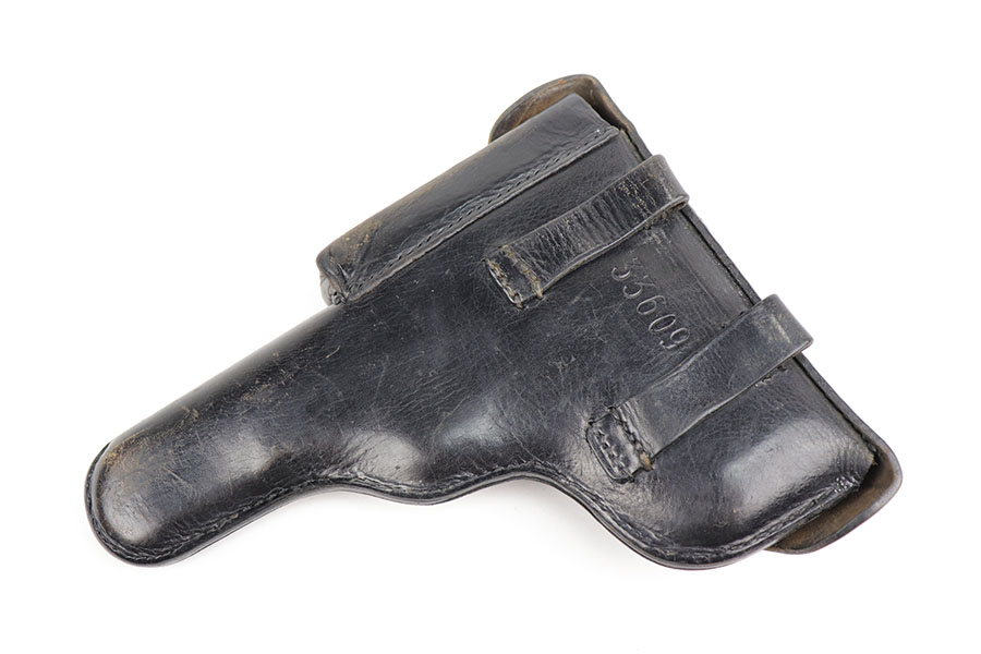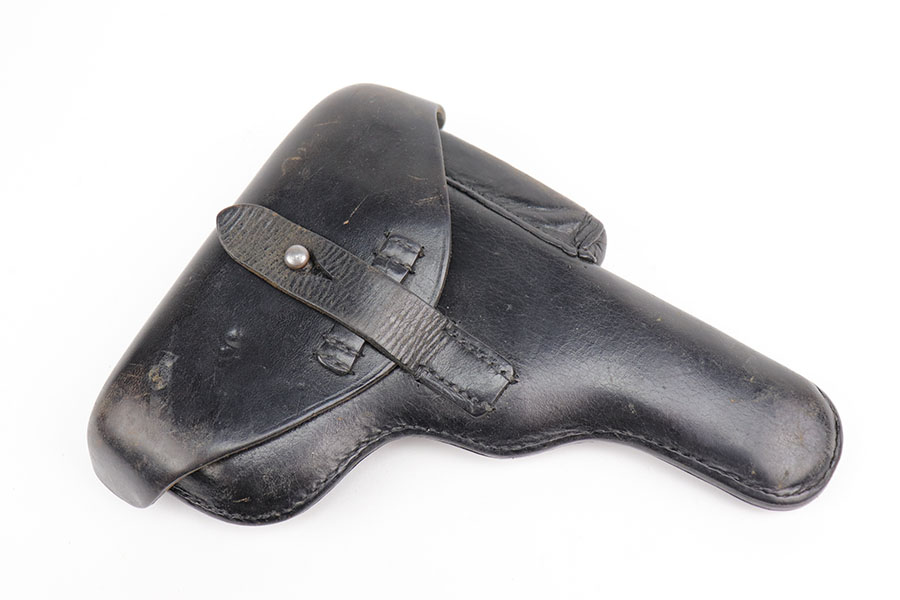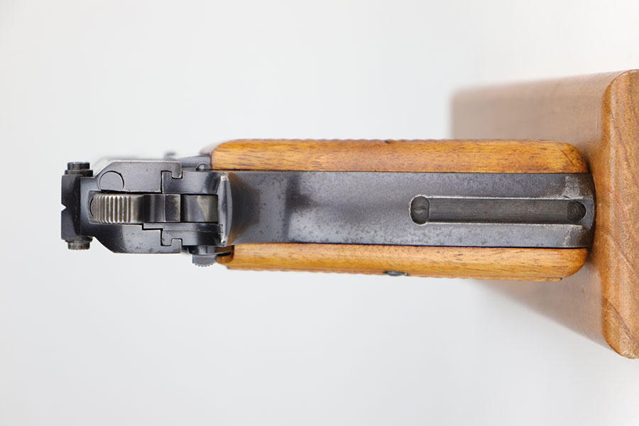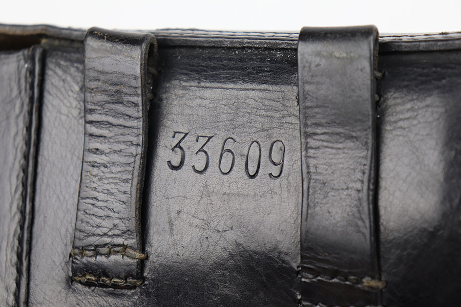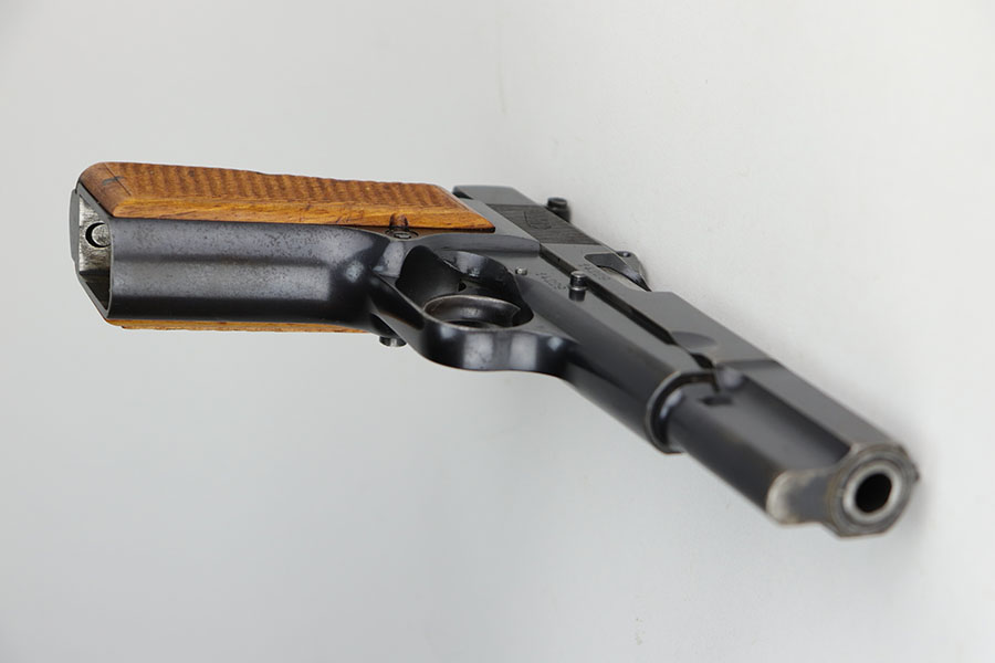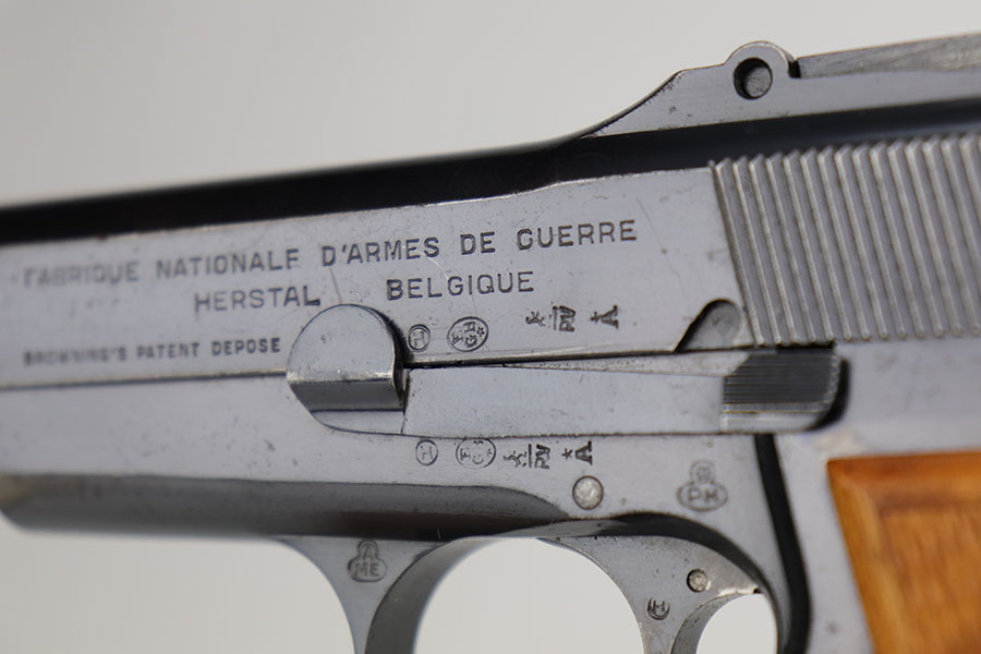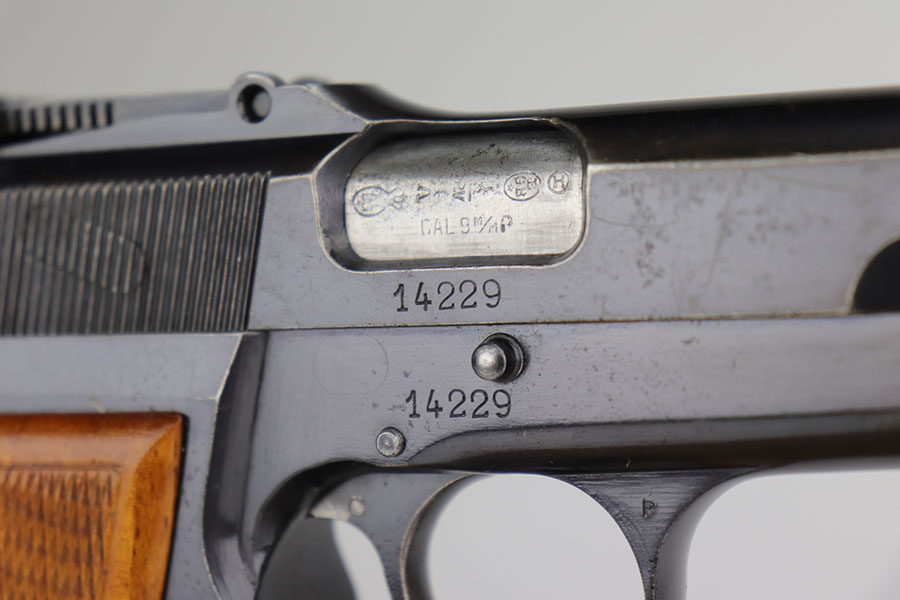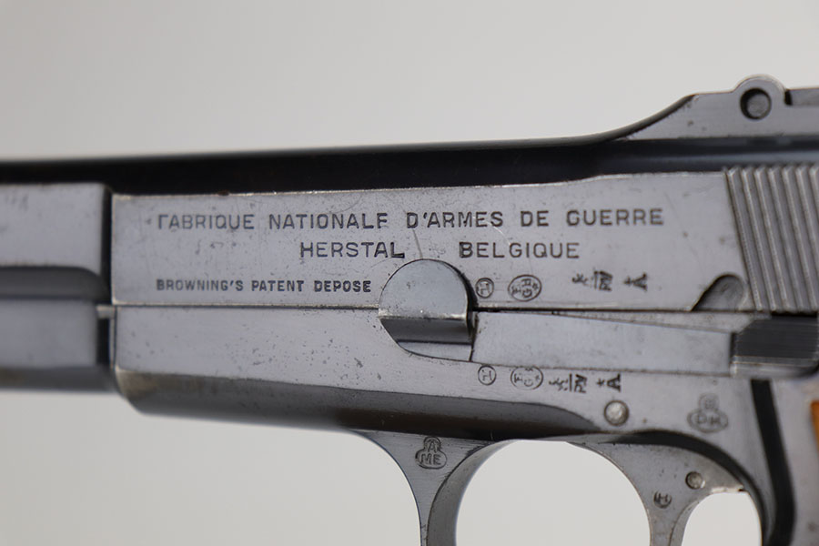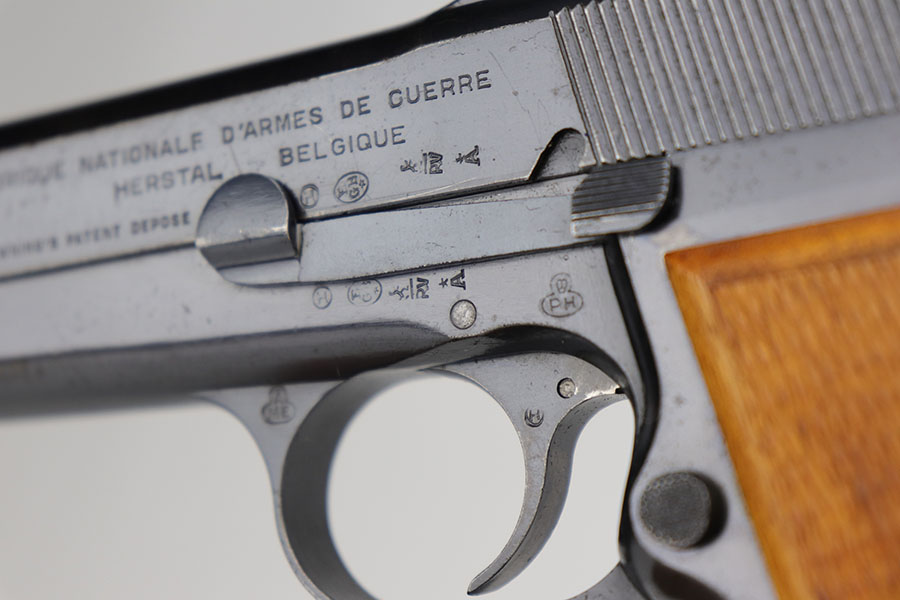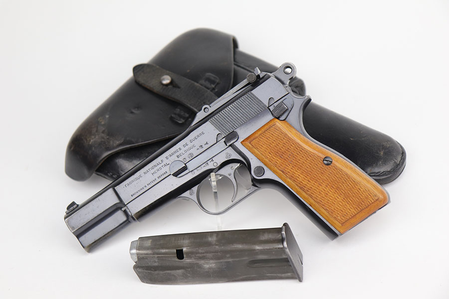 11/24/20 – This is a very nice and original example of a prewar FN Browning High Power issued to the Belgian military. The pistol is all matching with about 96-97% of the polished blue remaining. While there’s only a little bit of finish loss on the high edges and underside of the slide, there is oxidation in many areas, especially the right side of the slide. The pistol correctly has the Circle H proofs on most of the parts, and also has the serial number on the frame under the grips, which is specific to this contract. The magazine is also correct with the circle H proof. The grips are minty but later replacements. Bore has strong rifling with no pitting. Tangent rear sight and stock slot in frame are also desirable features. Comes with a holster that is serialized to a different gun.