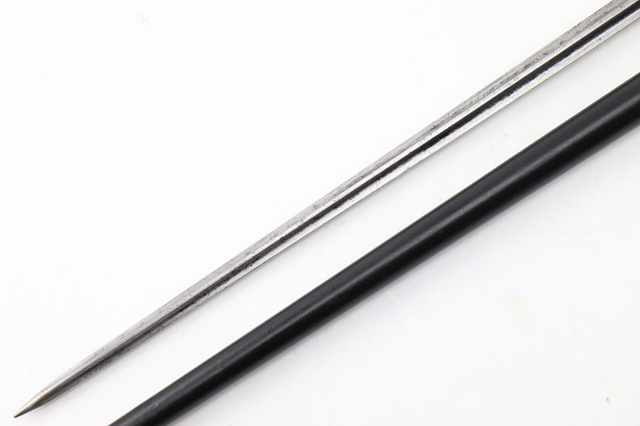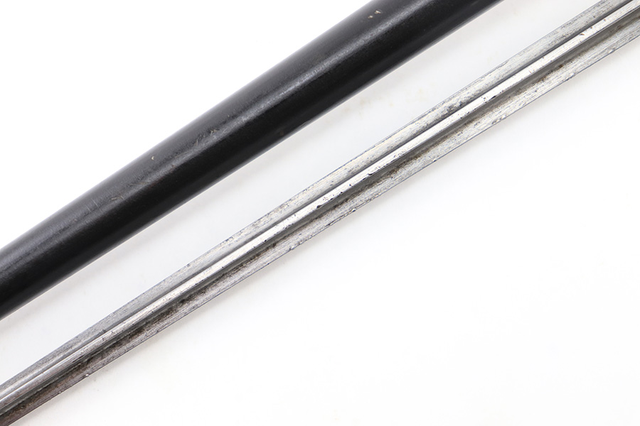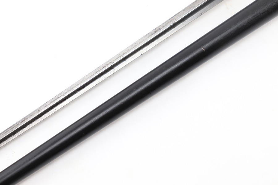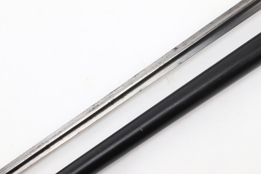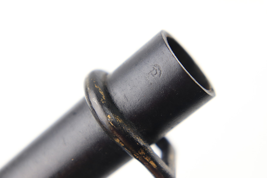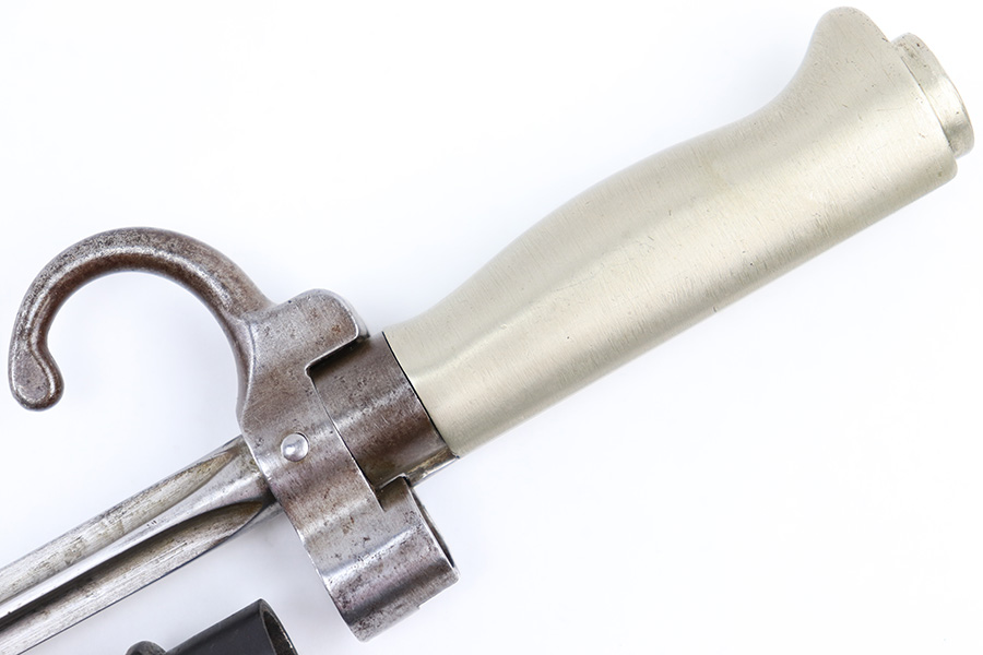 8/18/23 – This is an original, early WW1 era French Lebel M1886 spike bayonet. The bayonet features an early nickel silver handle and hooked quillion. The spiked blade measures 52cm long (about 20.5 inches) and is in excellent condition with some mild spotty oxidation but no rust or pitting. The quillion and socket area has dark surface patina and natural signs of aging. The hooked portion is serial numbered D31259. The handle is clean and excellent. Comes with a metal scabbard with most of the blued finish intact, and some mild browning patina throughout. An overall excellent, early example. Overall length is 64cm (without the scabbard).