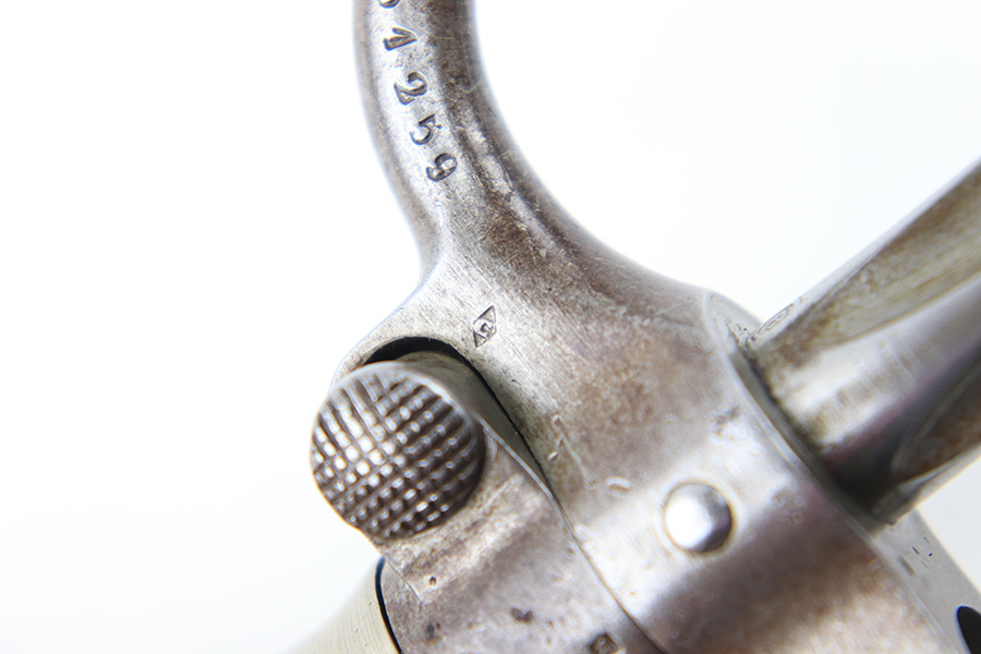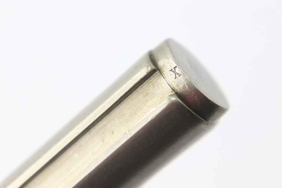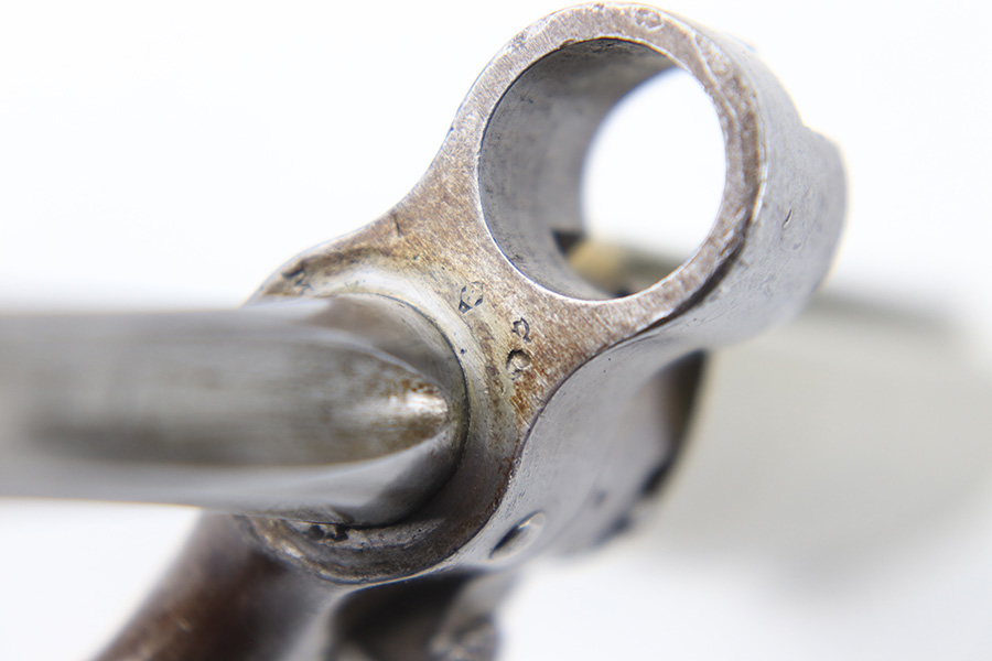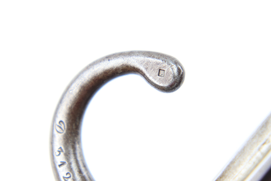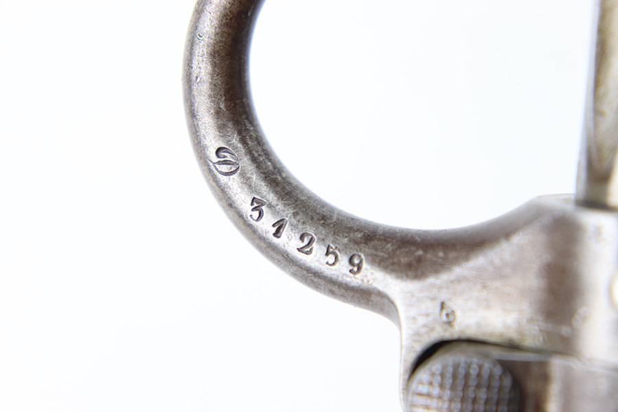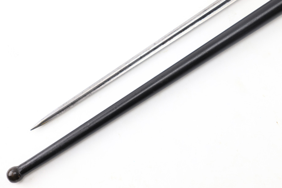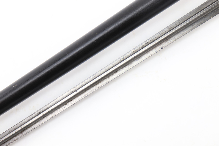 8/18/23 – This is an original, early WW1 era French Lebel M1886 spike bayonet. The bayonet features an early nickel silver handle and hooked quillion. The spiked blade measures 52cm long (about 20.5 inches) and is in excellent condition with some mild spotty oxidation but no rust or pitting. The quillion and socket area has dark surface patina and natural signs of aging. The hooked portion is serial numbered D31259. The handle is clean and excellent. Comes with a metal scabbard with most of the blued finish intact, and some mild browning patina throughout. An overall excellent, early example. Overall length is 64cm (without the scabbard).