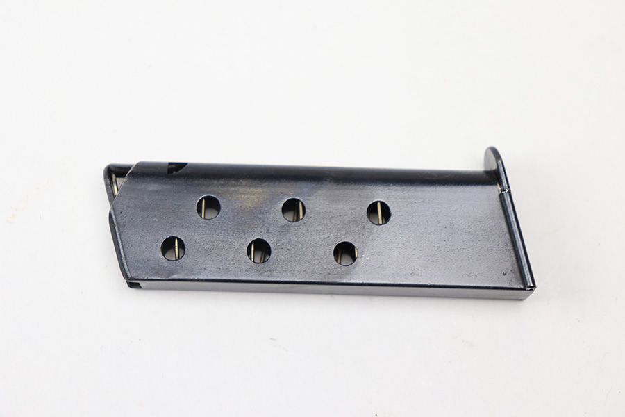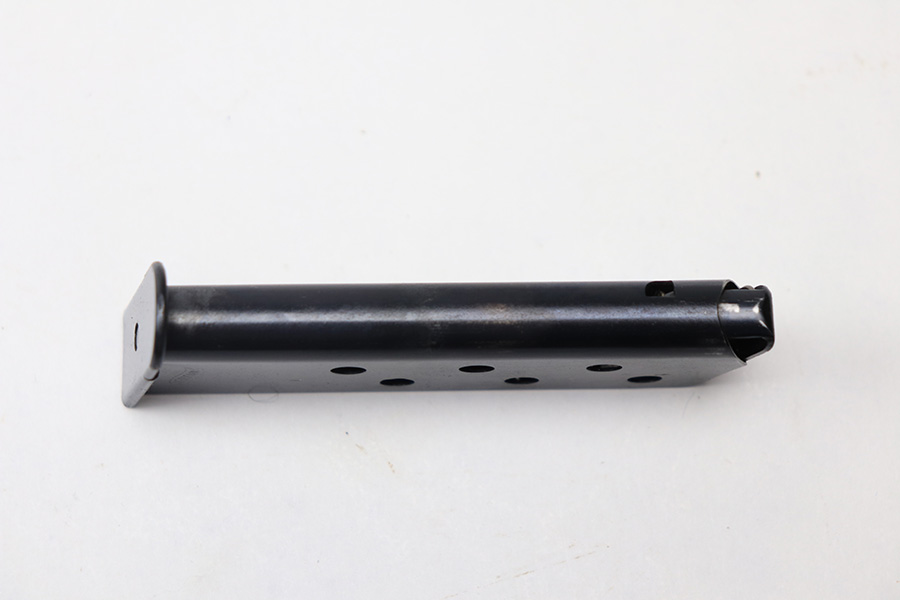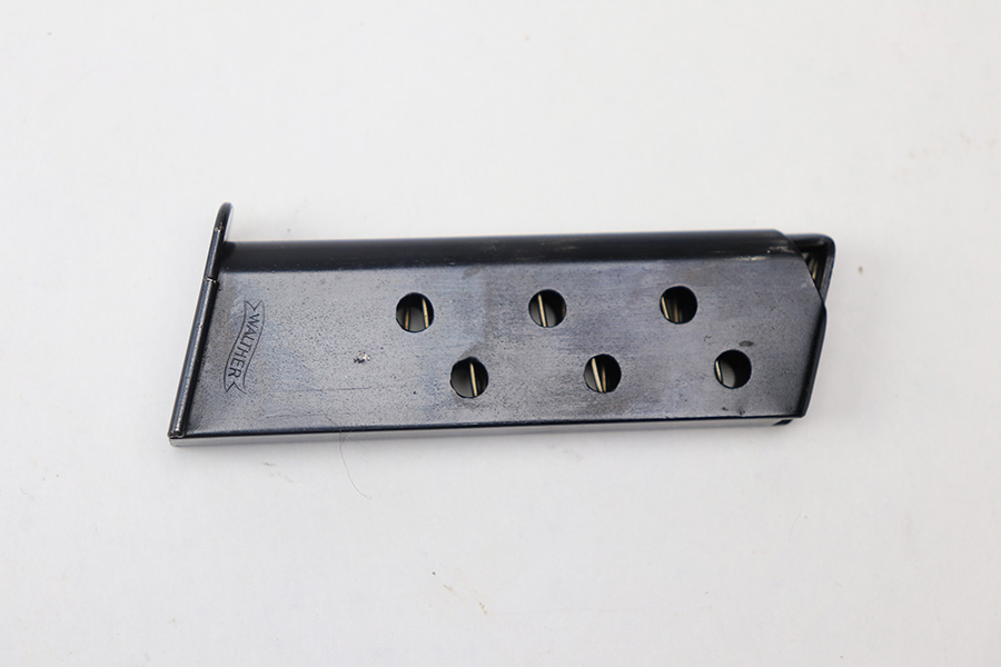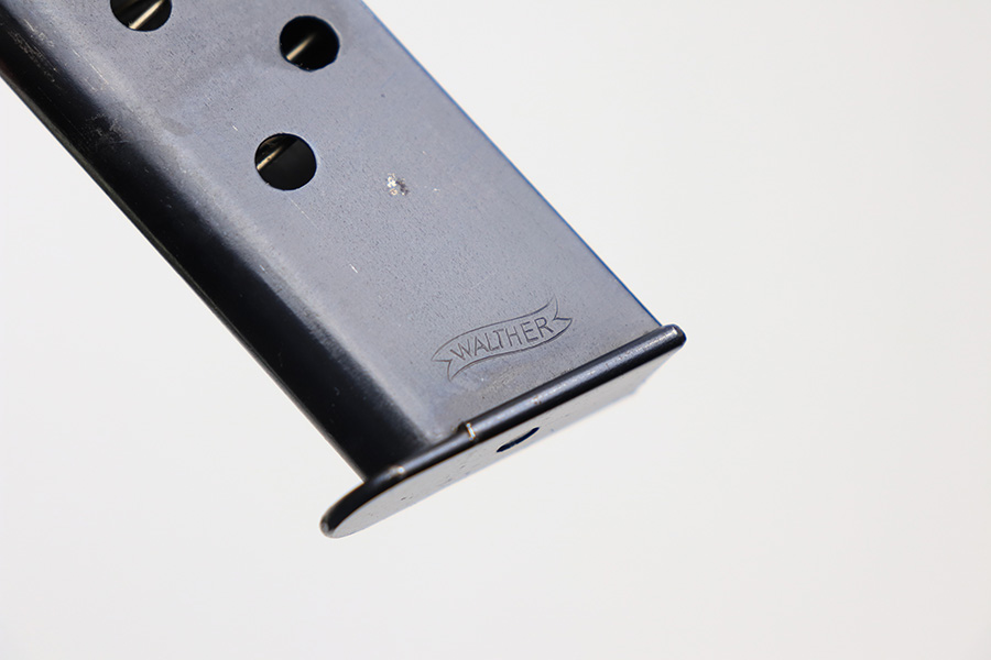 12/27/21 – This is an early example of a Walther PPK magazine featuring a flat bottom. The tube has retained a majority of its original high polish finish. The left side of the tube features a Walther banner only. The spring and follower are strong and functional.