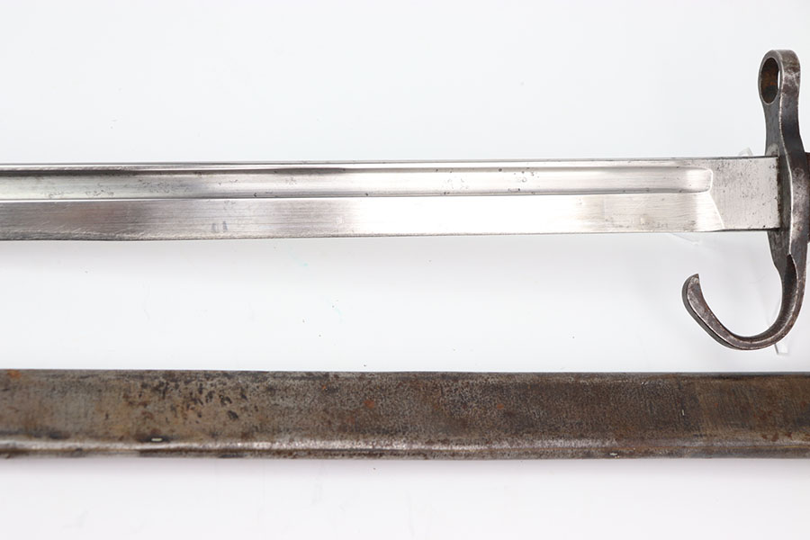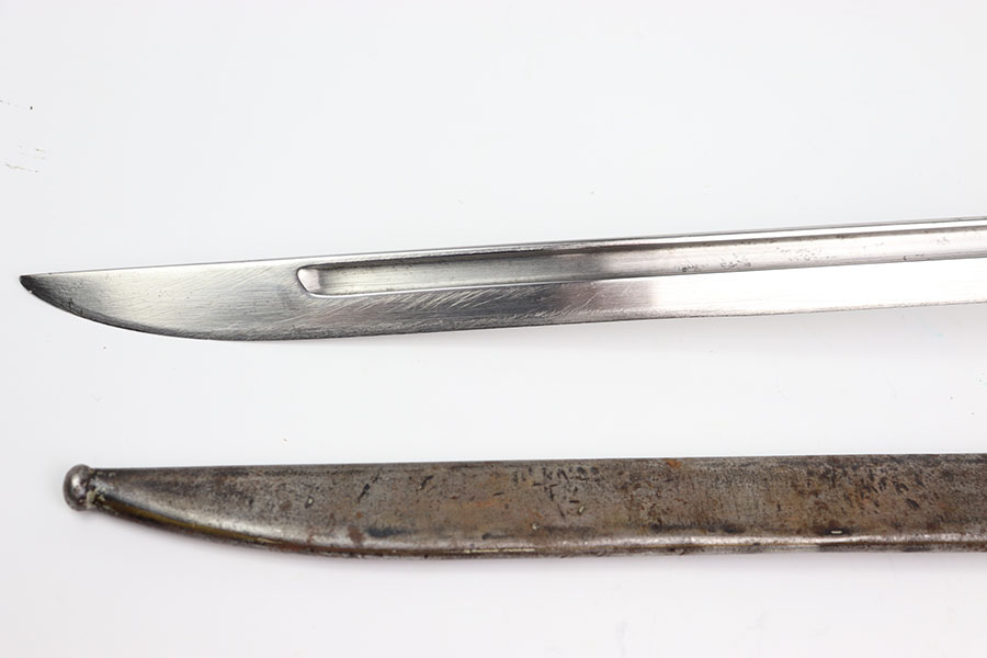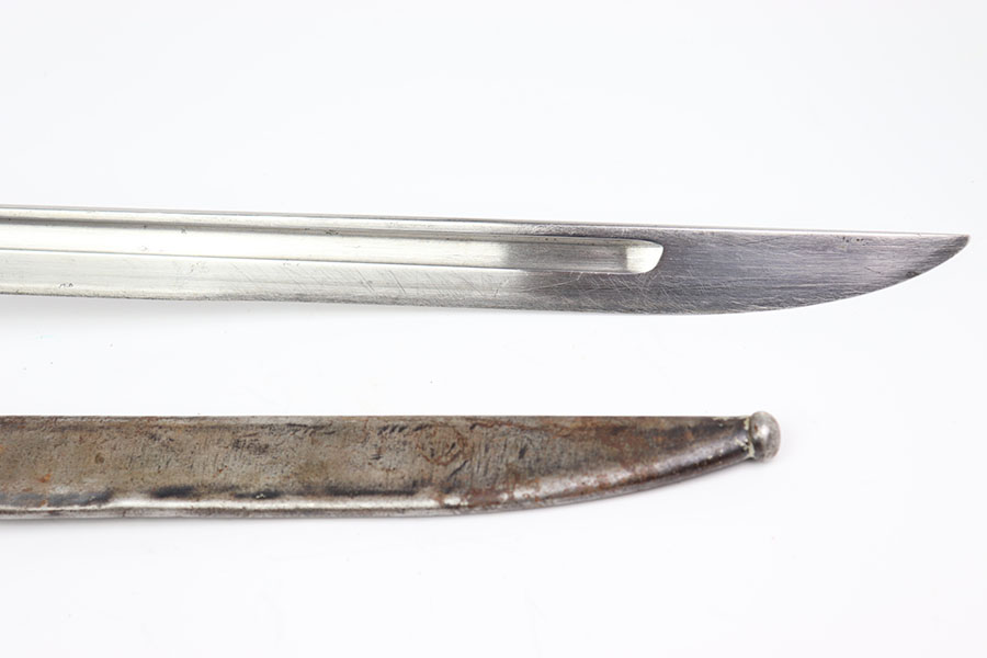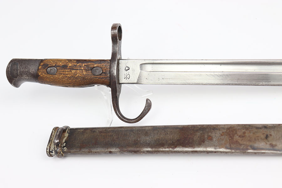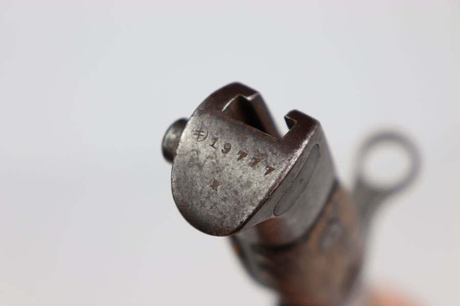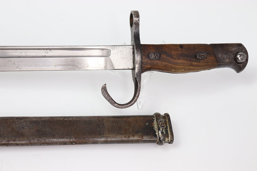 2/22/24 – This is an original WW2 era production Japanese Type 30 rifle bayonet. The bayonet is an early production example with early features, such as a bright, fullered blade, hooked cross guard, and bird’s head pommel. The blade is maker stamped by Hikari Seiki Arsenal on the ricasso, and the pommel of the handle is serial numbered. According to Labar’s book, this is a Variation A LB-93. Based on the serial number on the pommel, this is a 38th series. The blade is in great condition with some scratches throughout. The edge is sharpened. The blued cross guard and hilt are in good condition with average surface patina and wear. Excellent wood grips. Comes with a tubular tipped metal scabbard as shown. There’s mild surface patina and finish loss throughout. There is a dent midway up the left side of the scabbard and some minor dents along the front edge. None of which affect how the blades ability to be inserted and removed.