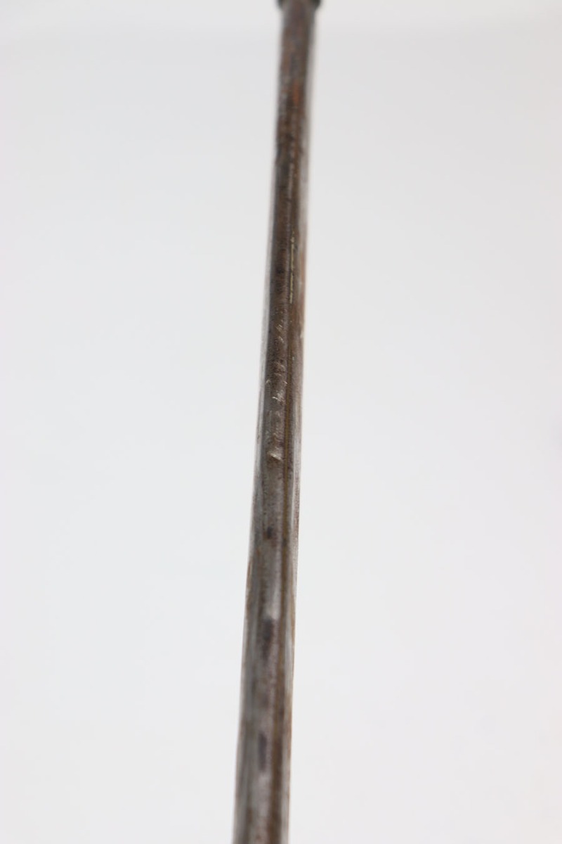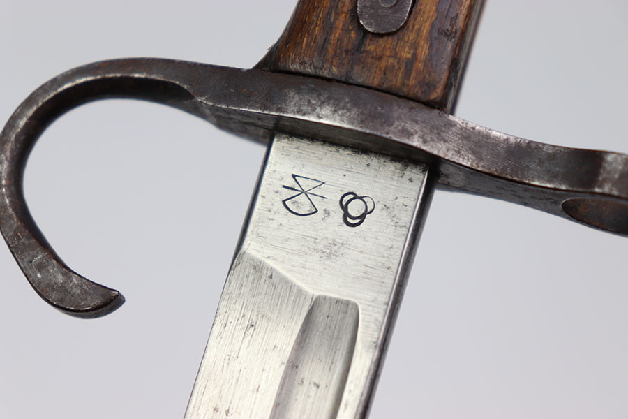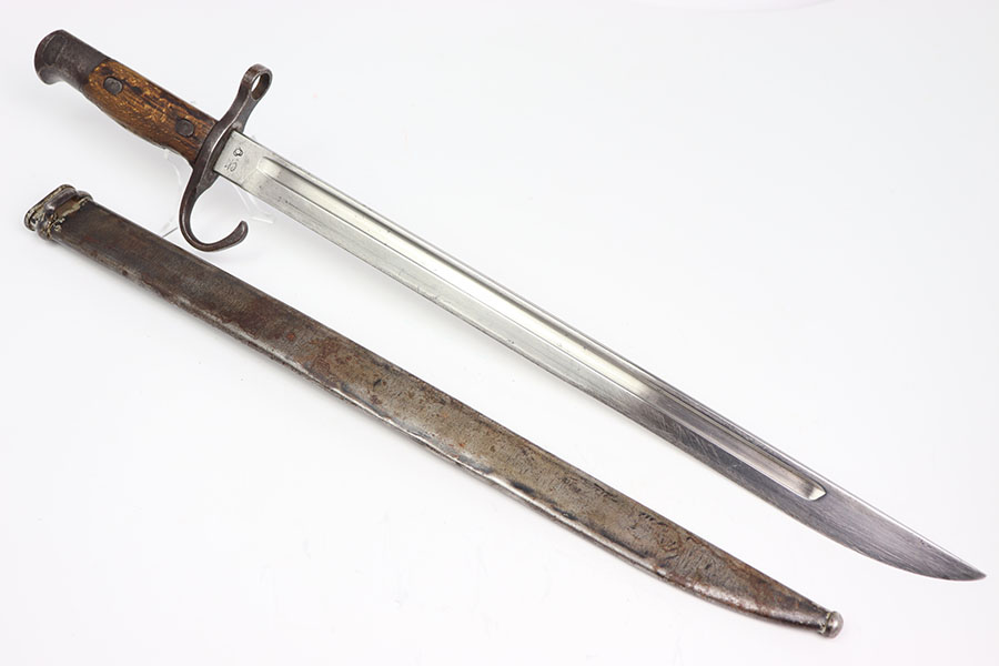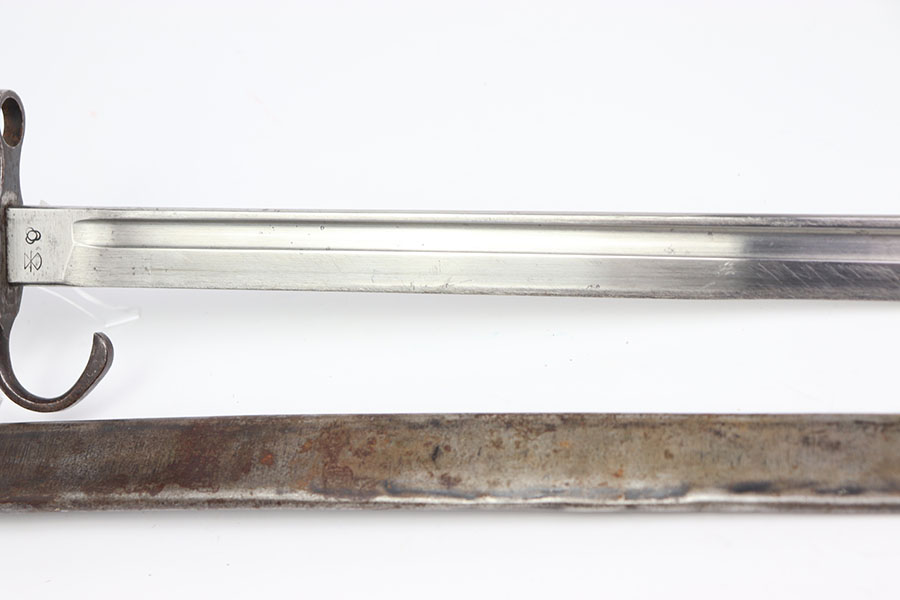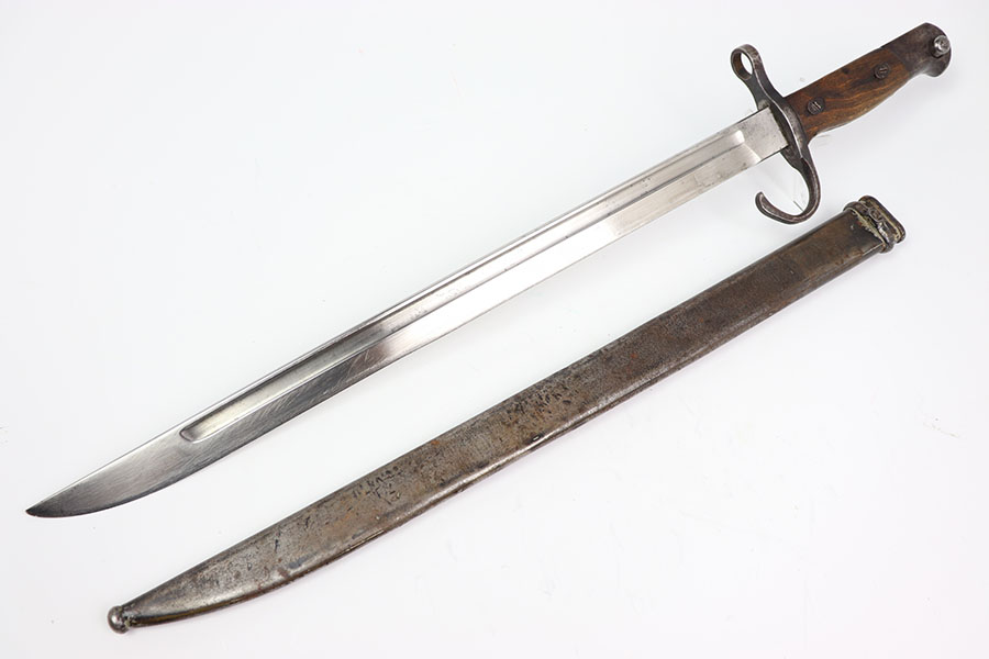 2/22/24 – This is an original WW2 era production Japanese Type 30 rifle bayonet. The bayonet is an early production example with early features, such as a bright, fullered blade, hooked cross guard, and bird’s head pommel. The blade is maker stamped by Hikari Seiki Arsenal on the ricasso, and the pommel of the handle is serial numbered. According to Labar’s book, this is a Variation A LB-93. Based on the serial number on the pommel, this is a 38th series. The blade is in great condition with some scratches throughout. The edge is sharpened. The blued cross guard and hilt are in good condition with average surface patina and wear. Excellent wood grips. Comes with a tubular tipped metal scabbard as shown. There’s mild surface patina and finish loss throughout. There is a dent midway up the left side of the scabbard and some minor dents along the front edge. None of which affect how the blades ability to be inserted and removed.