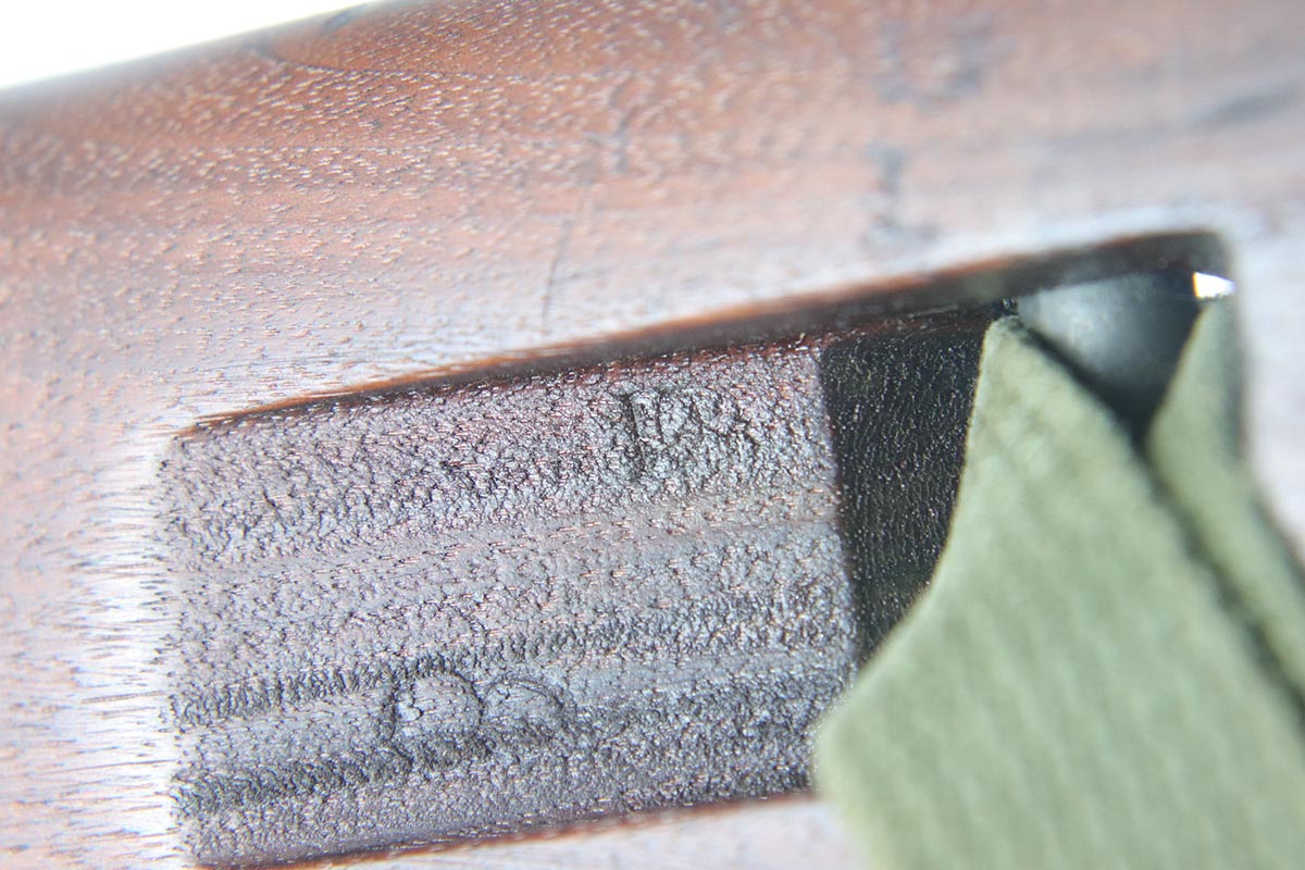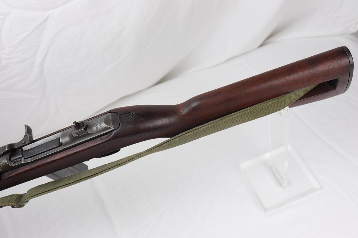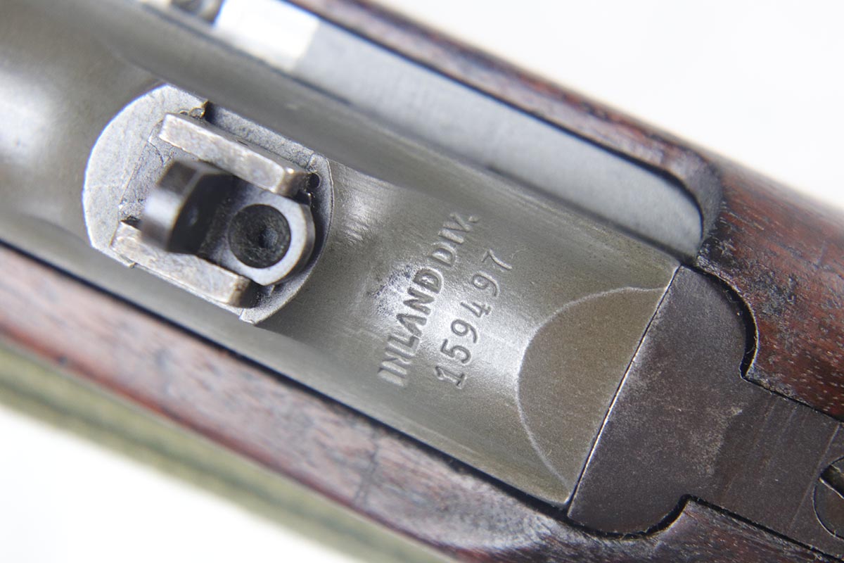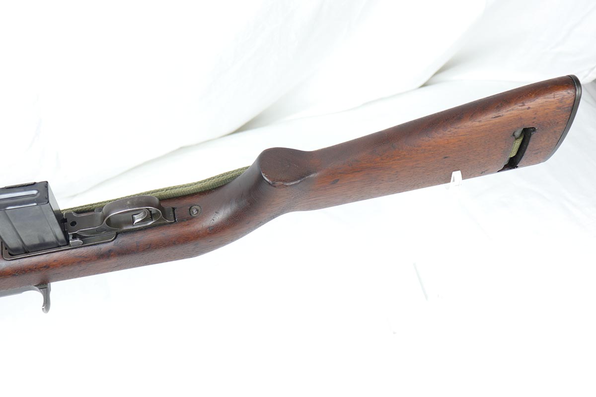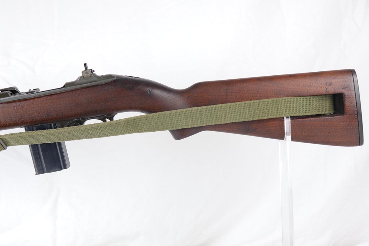 7/23/18 – This is an early (six-digit) and original M1 Carbine, made by Inland (General Motors) in January of 1943. It is all original configuration with no sign of bayo lug, early rear flip site with ‘S’ marking, and ‘S’ marked rear site. The rifle features a high wood stuck with “I” sling cut slot. The sling well is correctly IO marked with flaming bomb. The same markings are on the inside of the hand guard. Early type 1 front barrel bad. The magazine is IW marked. The finish rates at 90+% with only minor thinning overall, and some finish loss at the muzzle. Excellent bore and original sling.