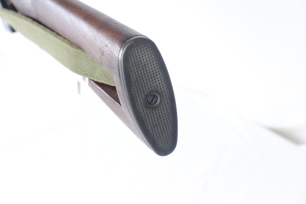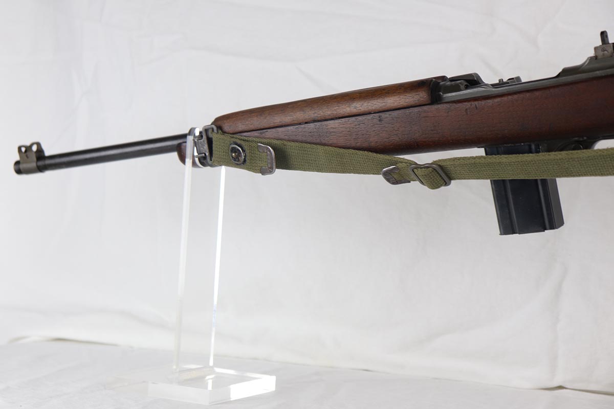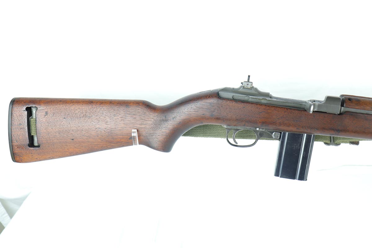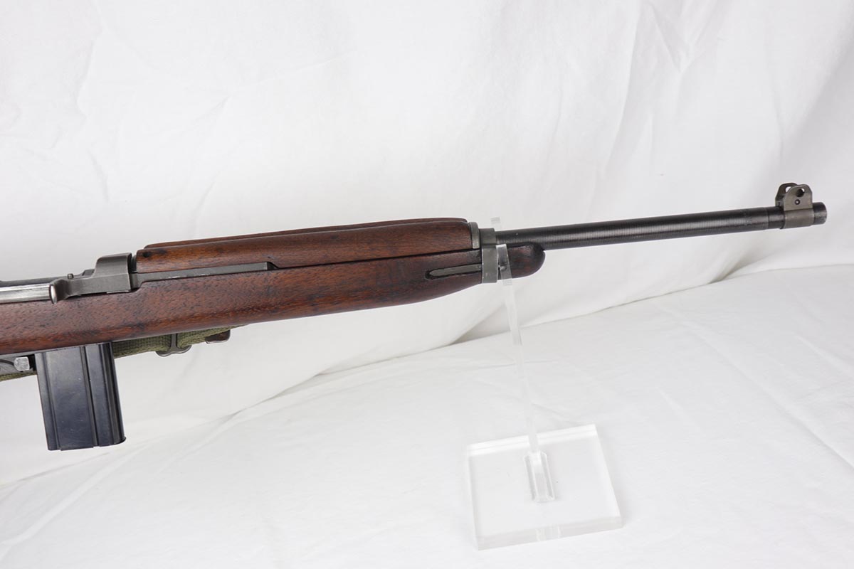 7/23/18 – This is an early (six-digit) and original M1 Carbine, made by Inland (General Motors) in January of 1943. It is all original configuration with no sign of bayo lug, early rear flip site with ‘S’ marking, and ‘S’ marked rear site. The rifle features a high wood stuck with “I” sling cut slot. The sling well is correctly IO marked with flaming bomb. The same markings are on the inside of the hand guard. Early type 1 front barrel bad. The magazine is IW marked. The finish rates at 90+% with only minor thinning overall, and some finish loss at the muzzle. Excellent bore and original sling.
