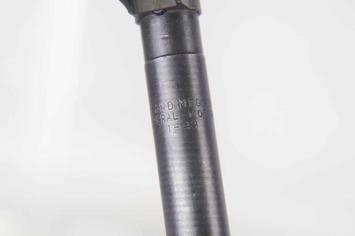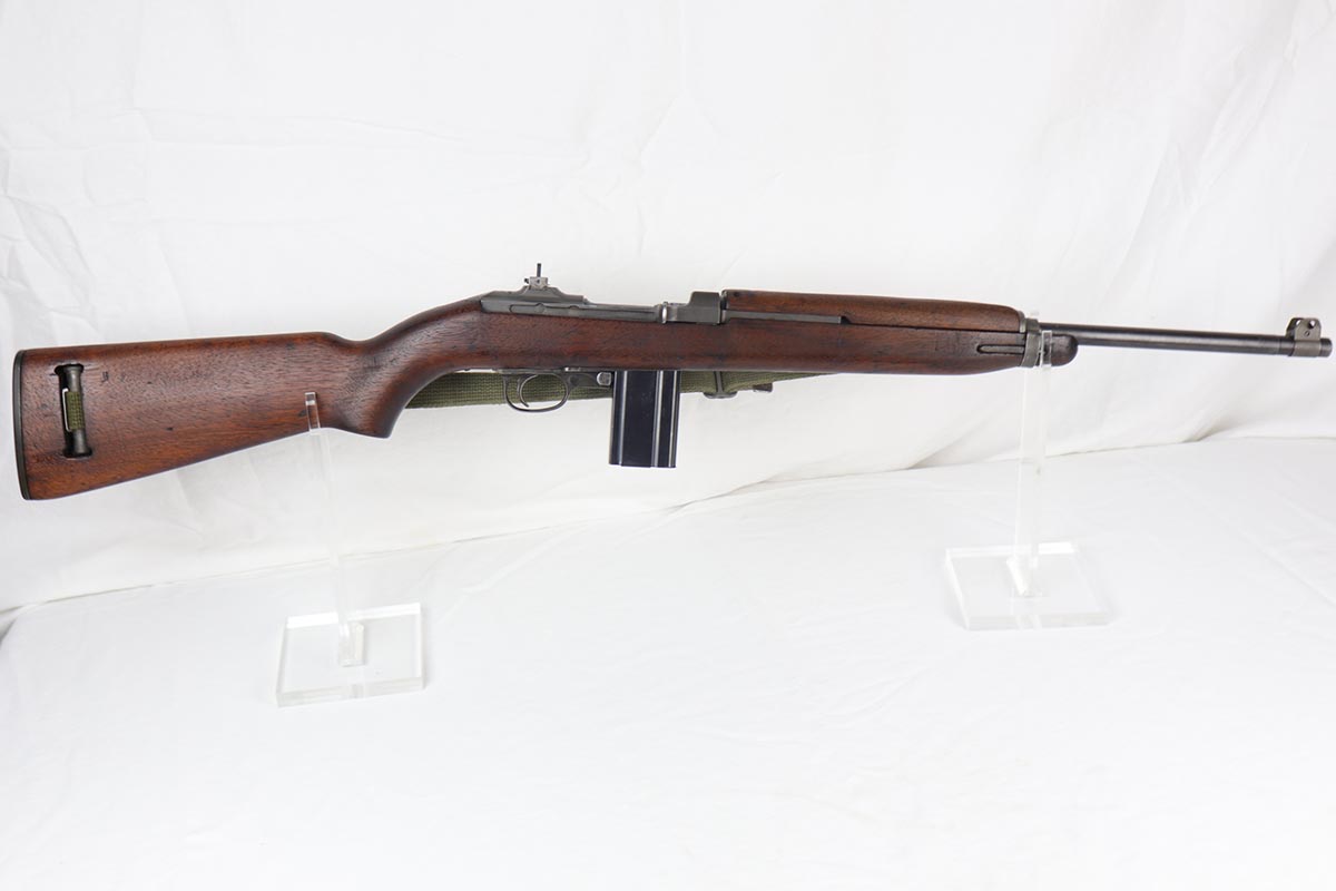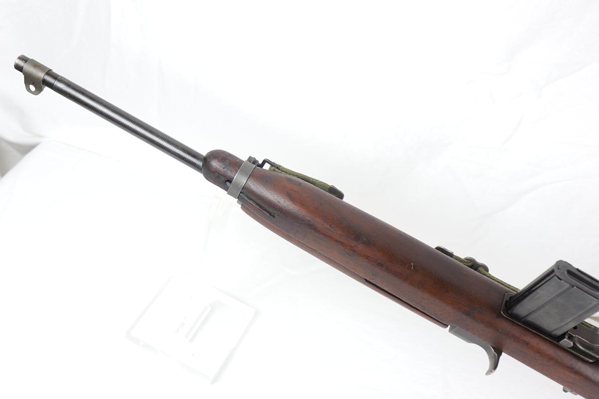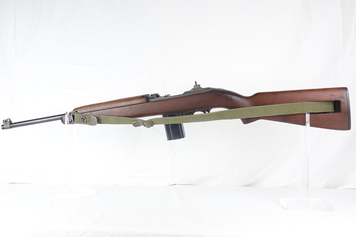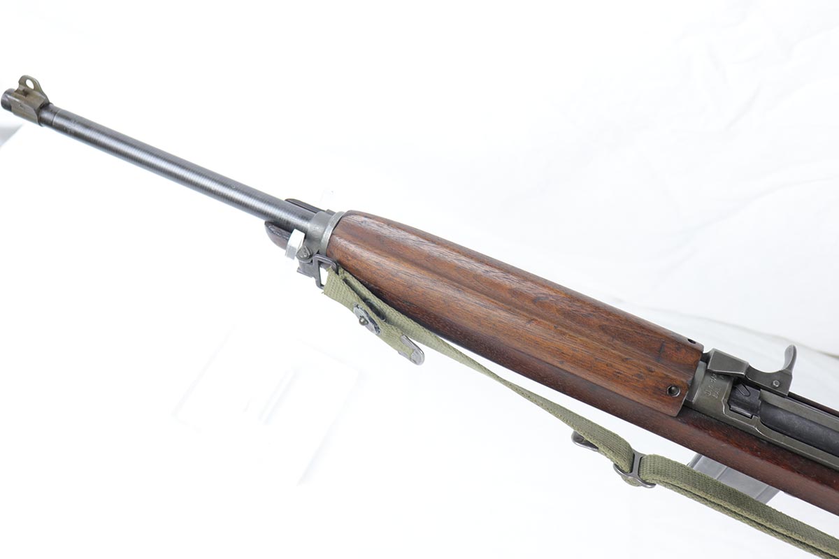 7/23/18 – This is an early (six-digit) and original M1 Carbine, made by Inland (General Motors) in January of 1943. It is all original configuration with no sign of bayo lug, early rear flip site with ‘S’ marking, and ‘S’ marked rear site. The rifle features a high wood stuck with “I” sling cut slot. The sling well is correctly IO marked with flaming bomb. The same markings are on the inside of the hand guard. Early type 1 front barrel bad. The magazine is IW marked. The finish rates at 90+% with only minor thinning overall, and some finish loss at the muzzle. Excellent bore and original sling.