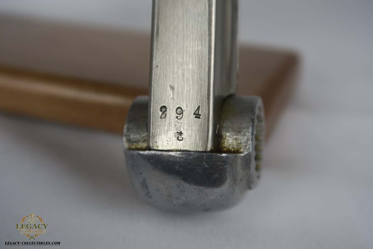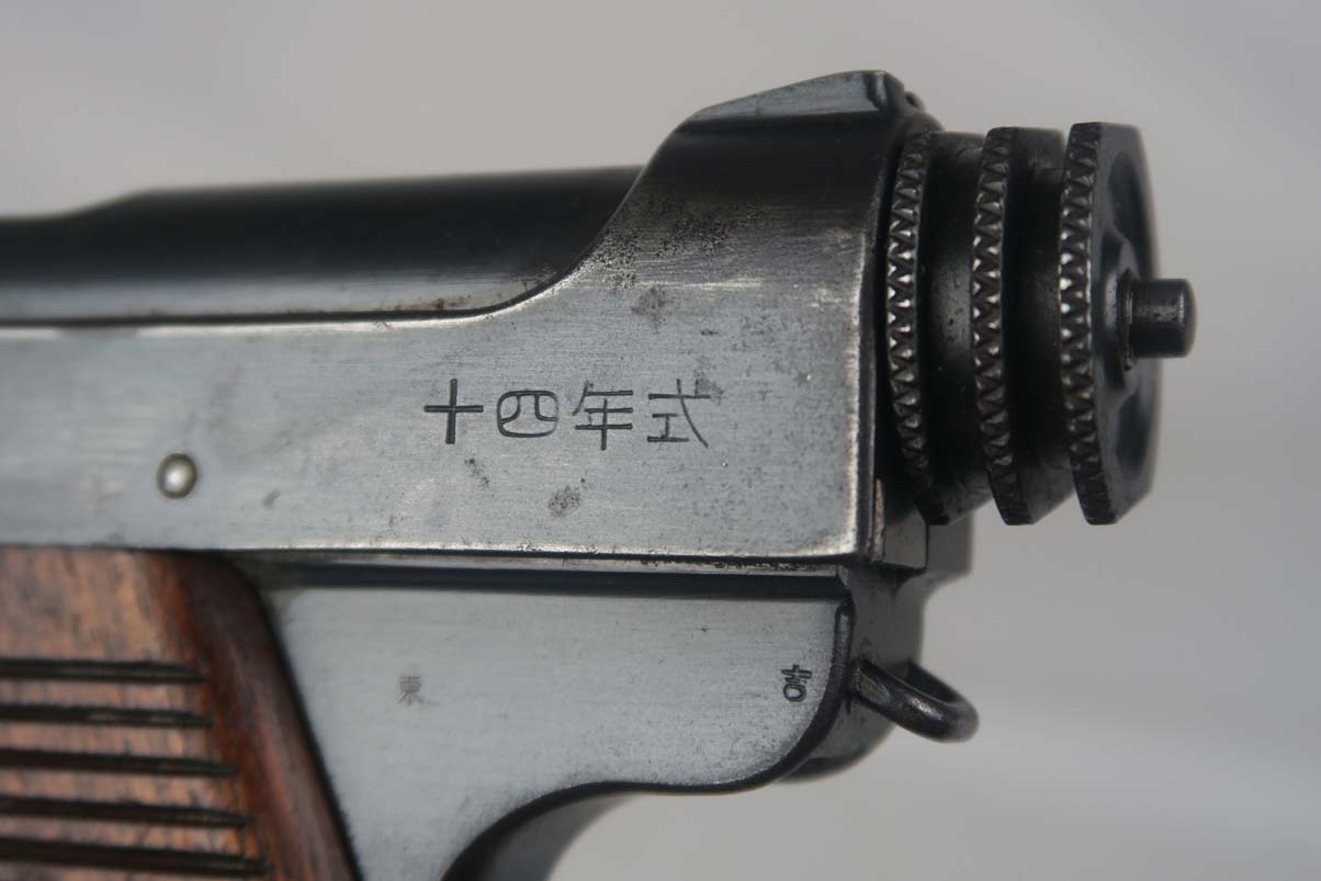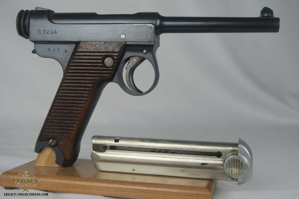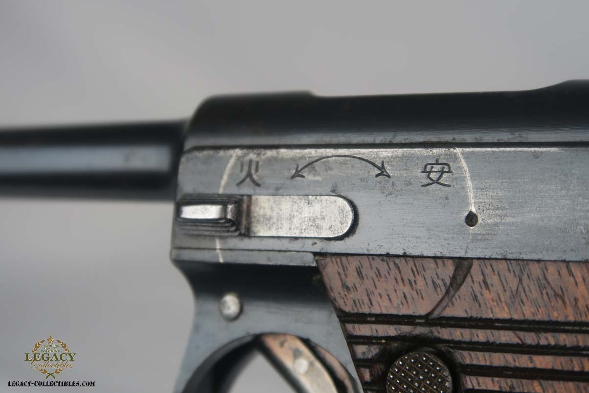 3/30/17 – This is a very early – one of the earliest we have ever offered – Japanese Nambu. It was made in October of 1929. This is a bit before Japan’s militaristic rise and therefore there were far smaller production numbers in these early years.  The serial puts this one as one of the last of the small trigger guard variations produced at Nagoya Army Arsenal. This one is in much better condition than most of the early guns.   Remember, they are an island nation and much of their military time was spent on the seas in transport.  The original finish on this gun is about 96%, with remarkably little corrosion or pitting.   Straps are nice with just some browning (patina) in the finish.  The grips are hand numbered to the gun – however, you would be hard pressed to read it.  All numbered parts are matching including the original magazine.  The bore is shiny and strong.  I would rate it an 8 out of 10. The gun has all the correct early features including the grips and the small trigger guard.
