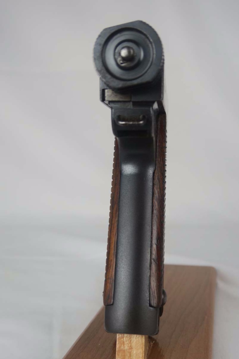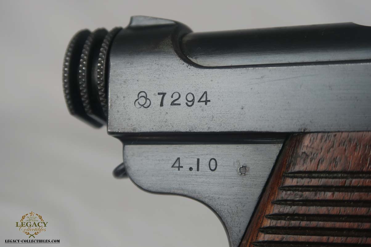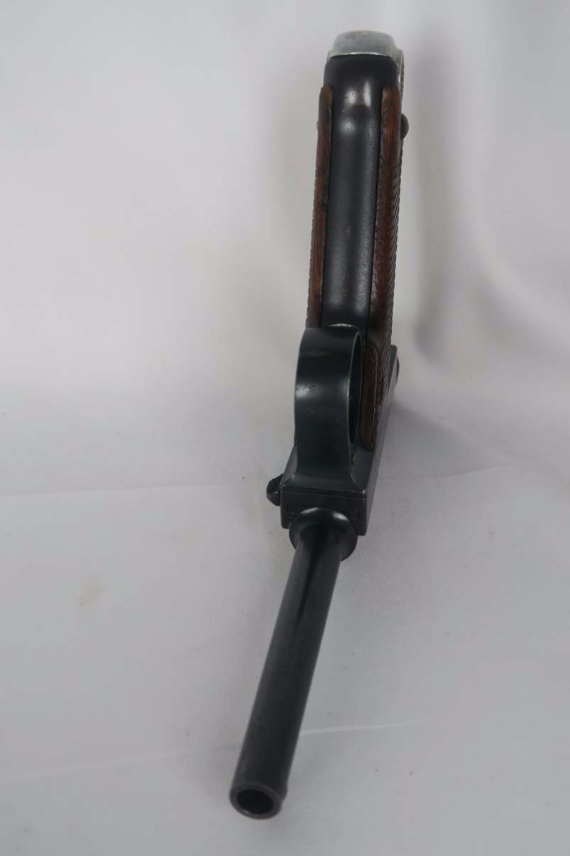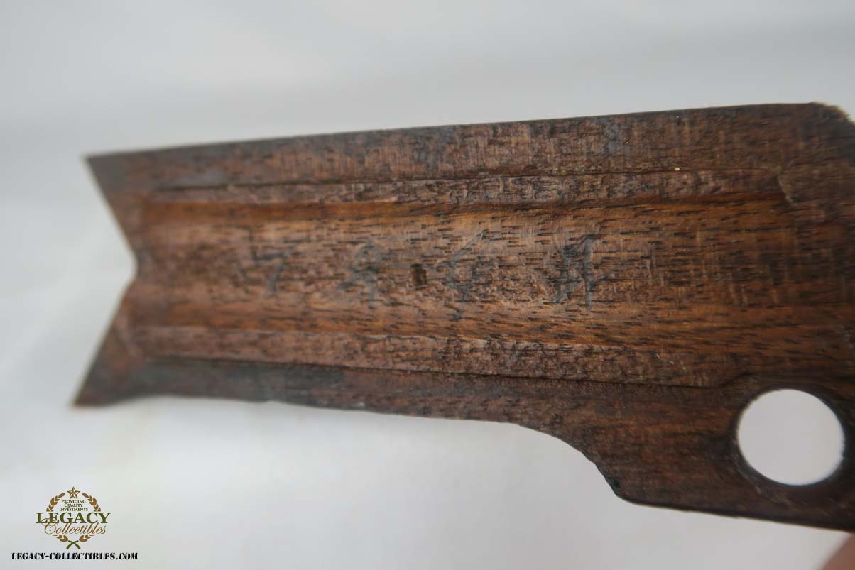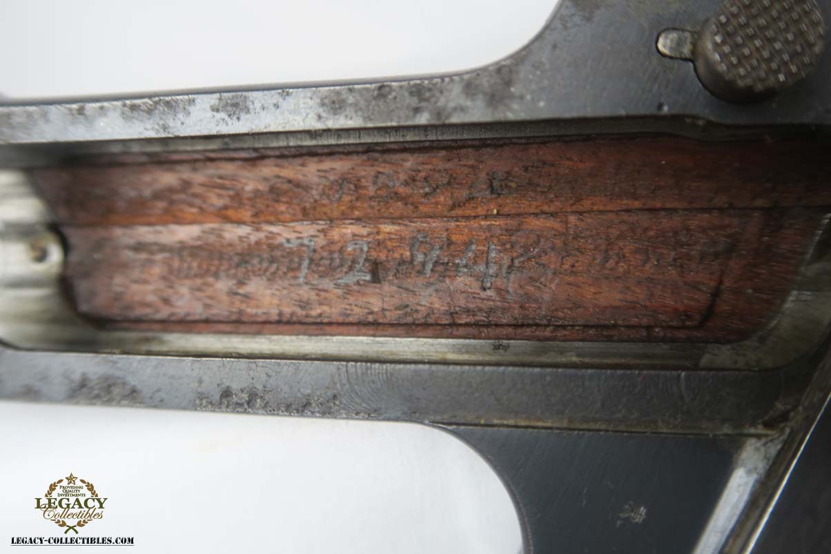 3/30/17 – This is a very early – one of the earliest we have ever offered – Japanese Nambu. It was made in October of 1929. This is a bit before Japan’s militaristic rise and therefore there were far smaller production numbers in these early years.  The serial puts this one as one of the last of the small trigger guard variations produced at Nagoya Army Arsenal. This one is in much better condition than most of the early guns.   Remember, they are an island nation and much of their military time was spent on the seas in transport.  The original finish on this gun is about 96%, with remarkably little corrosion or pitting.   Straps are nice with just some browning (patina) in the finish.  The grips are hand numbered to the gun – however, you would be hard pressed to read it.  All numbered parts are matching including the original magazine.  The bore is shiny and strong.  I would rate it an 8 out of 10. The gun has all the correct early features including the grips and the small trigger guard.