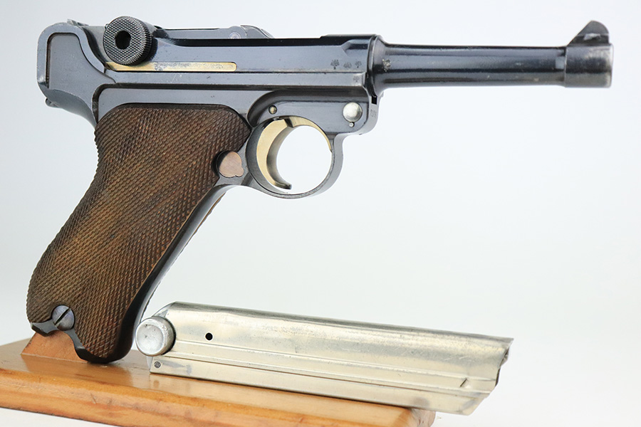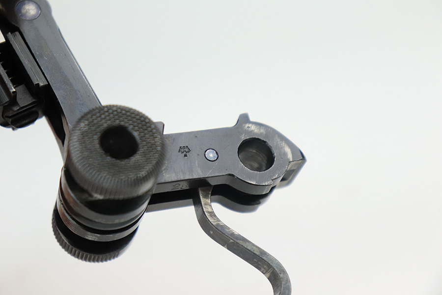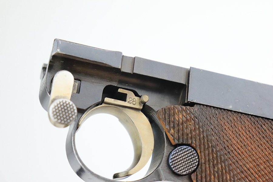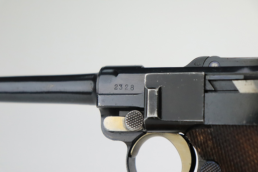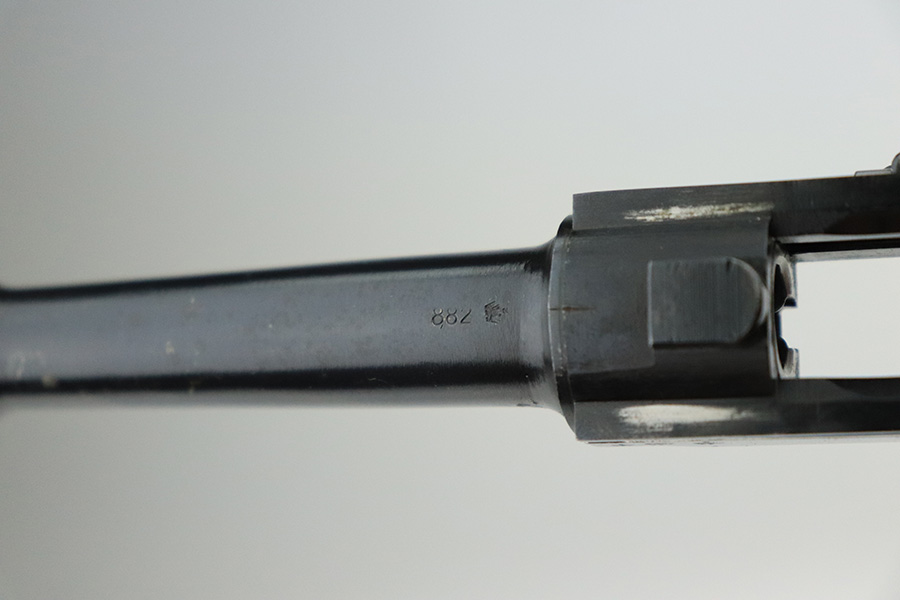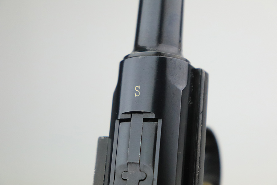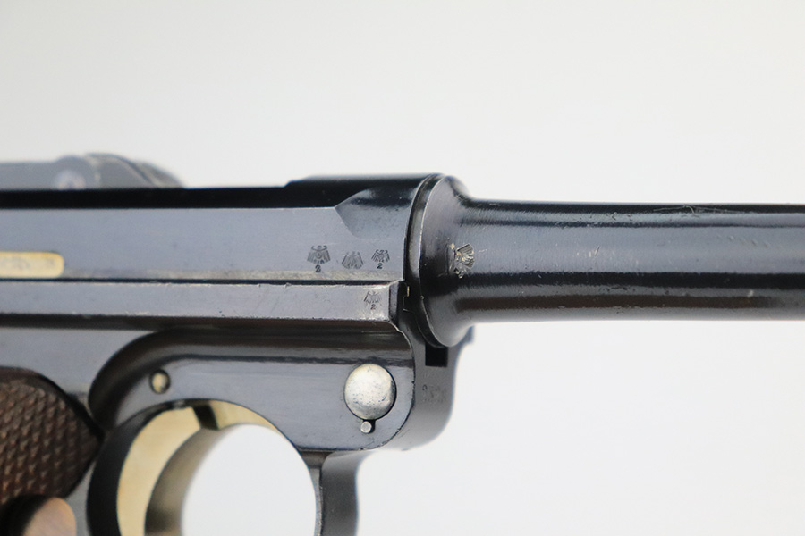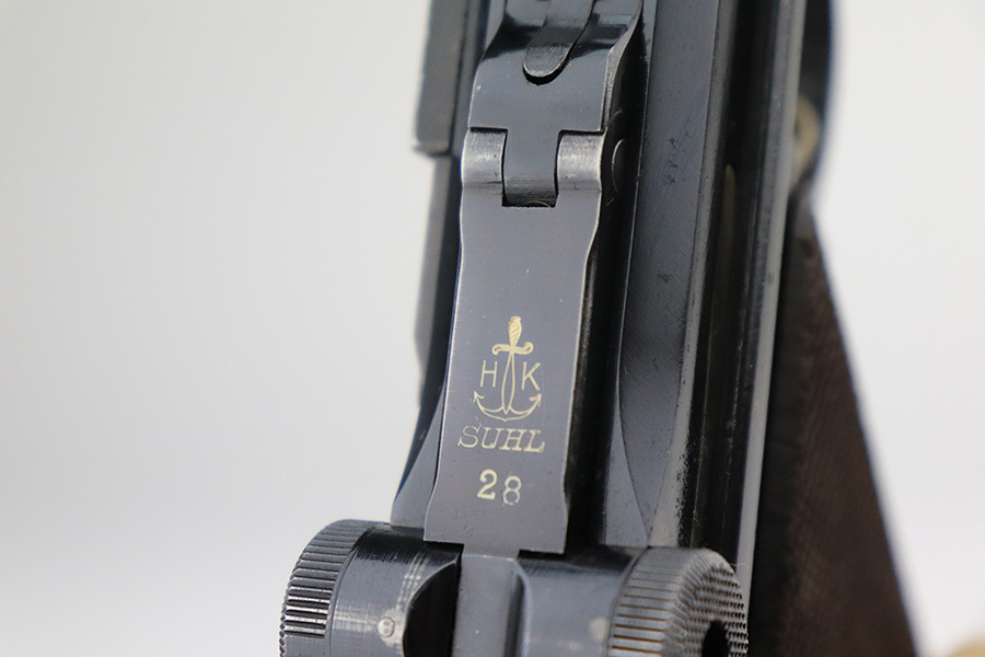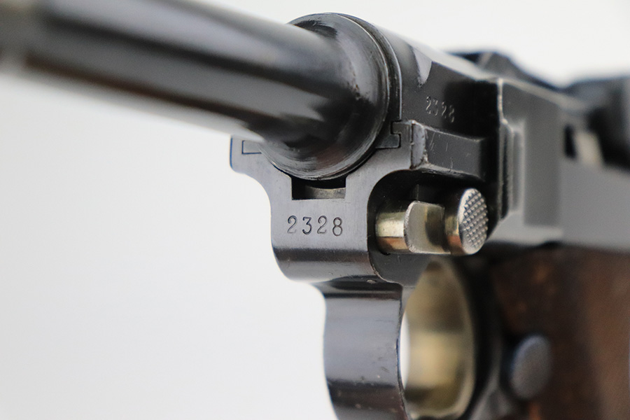 6/28/22 – From 1936, here we have a Krieghoff Luger that is mostly correct, but with a few issues ; and therefore priced accordingly. We have taken this all apart and here is what we found. The frame is Krieghoff made (HK) and correctly serial numbered 2328. It comes with wooden grips, however these are not HK grips even though they are numbered “28” and have spurious HK proofs on them. They are not original to the gun. The take down lever and trigger are correctly numbered 28. The safety lever is not numbered (incorrect). The hold open is not numbered (correct) but also not HK proofed (incorrect). The middle toggle link has the early HK, Suhl logo with #28 on it, which is correct. The rear toggle pin is not numbered (correct). The barrel is not numbered but it is HK proofed (correct). The firing pin and firing pin retailer is not numbered and not HK proofed (incorrect). It is fluted however. Each toggle link is correctly proofed and numbered 28 (correct). The side plate is internally numbered 28 and HK proofed which is most likely correct. However, the trigger bar is blued and it should be white metal. It is also HK proofed which is correct. Finally the magazine is numbered to the gun but the HK proof is too small and therefore I would assume the matching numbers on the magazine were “forced matched”. Very good bore rates about 8 out of 10. While not for the most discerning collector this HK luger might make a nice “place-holder” for someone. The sum of the parts would easily cover the price of the gun.