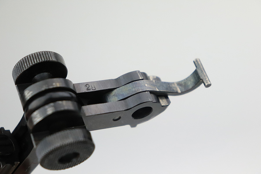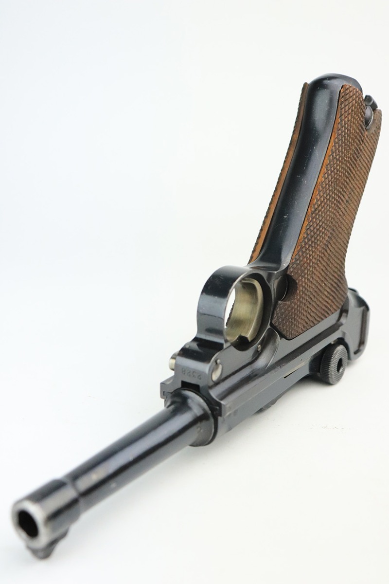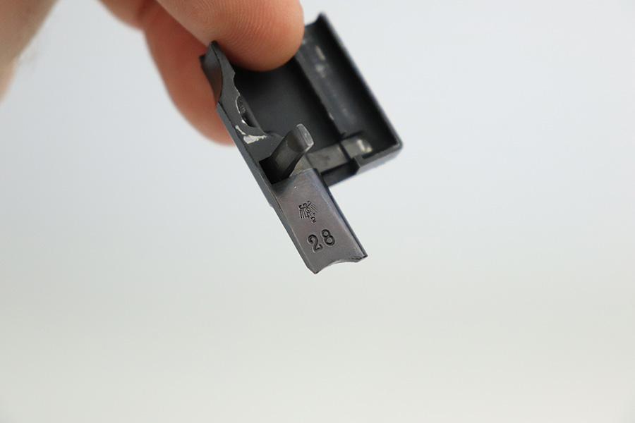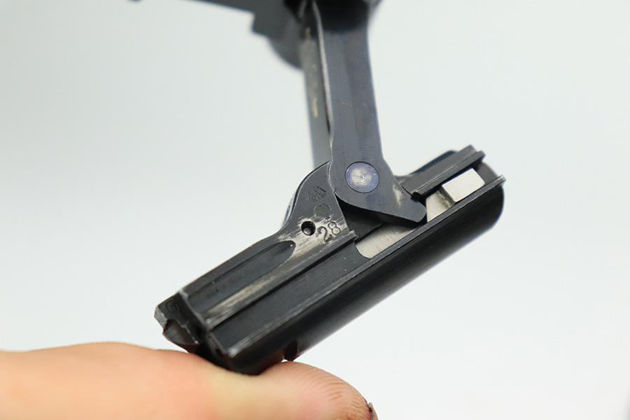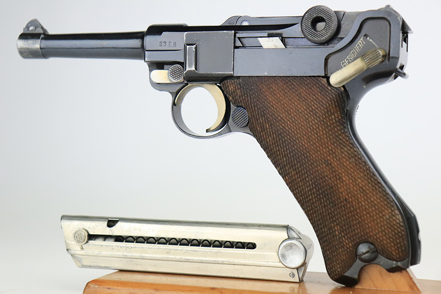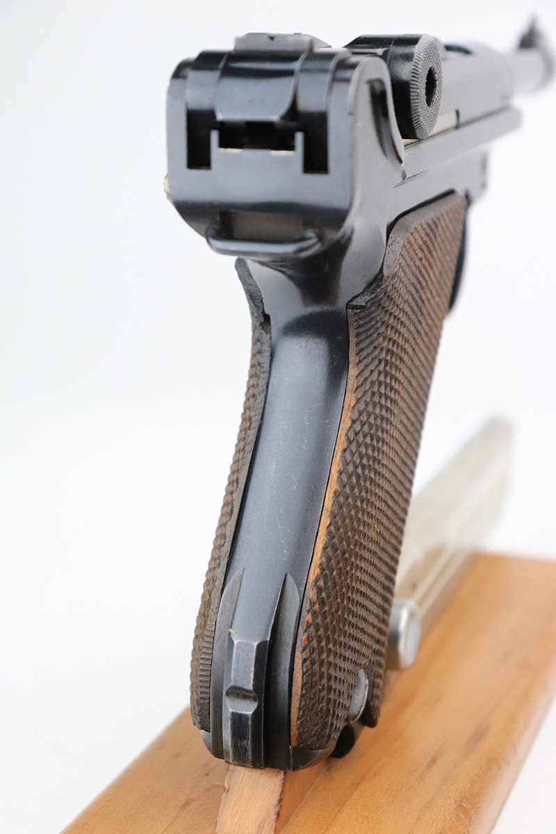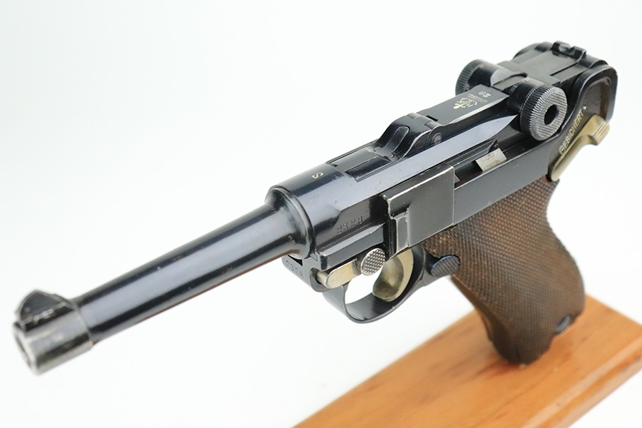 6/28/22 – From 1936, here we have a Krieghoff Luger that is mostly correct, but with a few issues ; and therefore priced accordingly. We have taken this all apart and here is what we found. The frame is Krieghoff made (HK) and correctly serial numbered 2328. It comes with wooden grips, however these are not HK grips even though they are numbered “28” and have spurious HK proofs on them. They are not original to the gun. The take down lever and trigger are correctly numbered 28. The safety lever is not numbered (incorrect). The hold open is not numbered (correct) but also not HK proofed (incorrect). The middle toggle link has the early HK, Suhl logo with #28 on it, which is correct. The rear toggle pin is not numbered (correct). The barrel is not numbered but it is HK proofed (correct). The firing pin and firing pin retailer is not numbered and not HK proofed (incorrect). It is fluted however. Each toggle link is correctly proofed and numbered 28 (correct). The side plate is internally numbered 28 and HK proofed which is most likely correct. However, the trigger bar is blued and it should be white metal. It is also HK proofed which is correct. Finally the magazine is numbered to the gun but the HK proof is too small and therefore I would assume the matching numbers on the magazine were “forced matched”. Very good bore rates about 8 out of 10. While not for the most discerning collector this HK luger might make a nice “place-holder” for someone. The sum of the parts would easily cover the price of the gun.