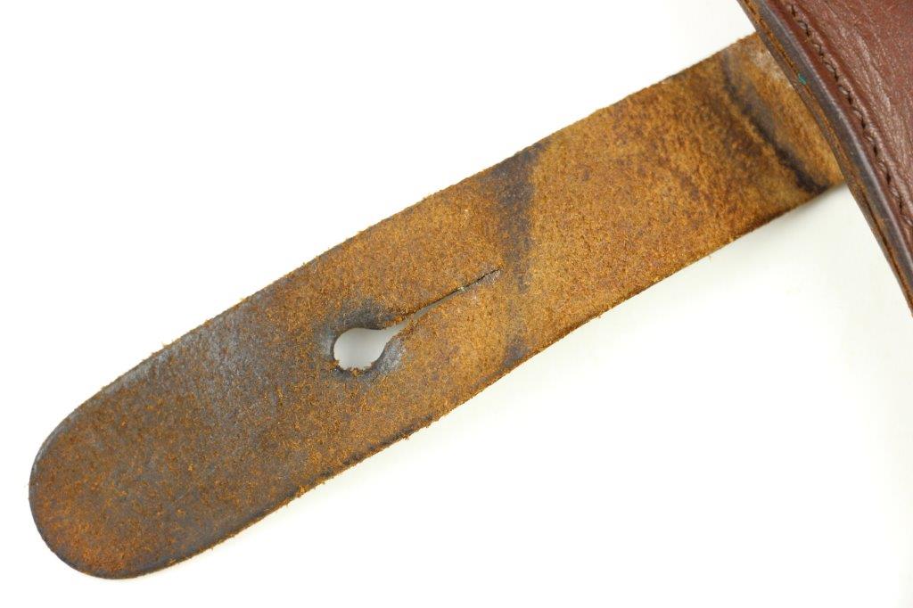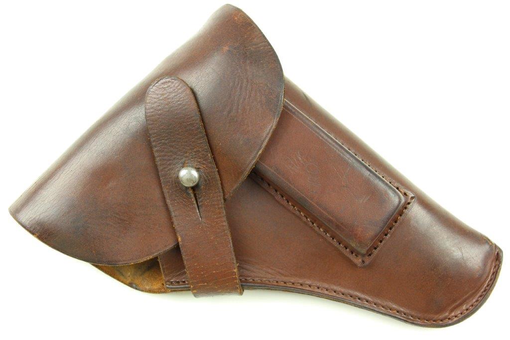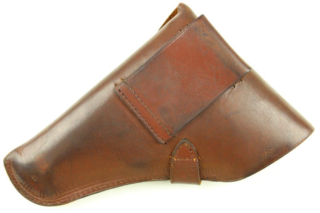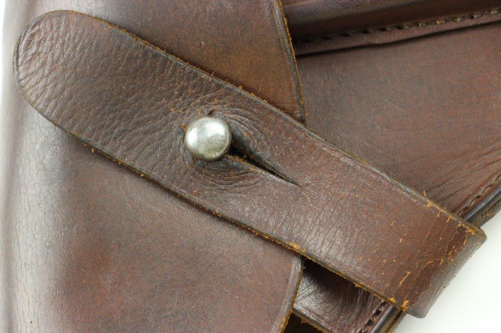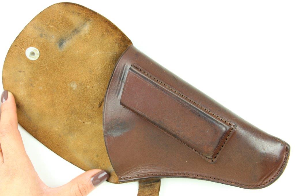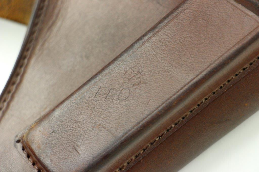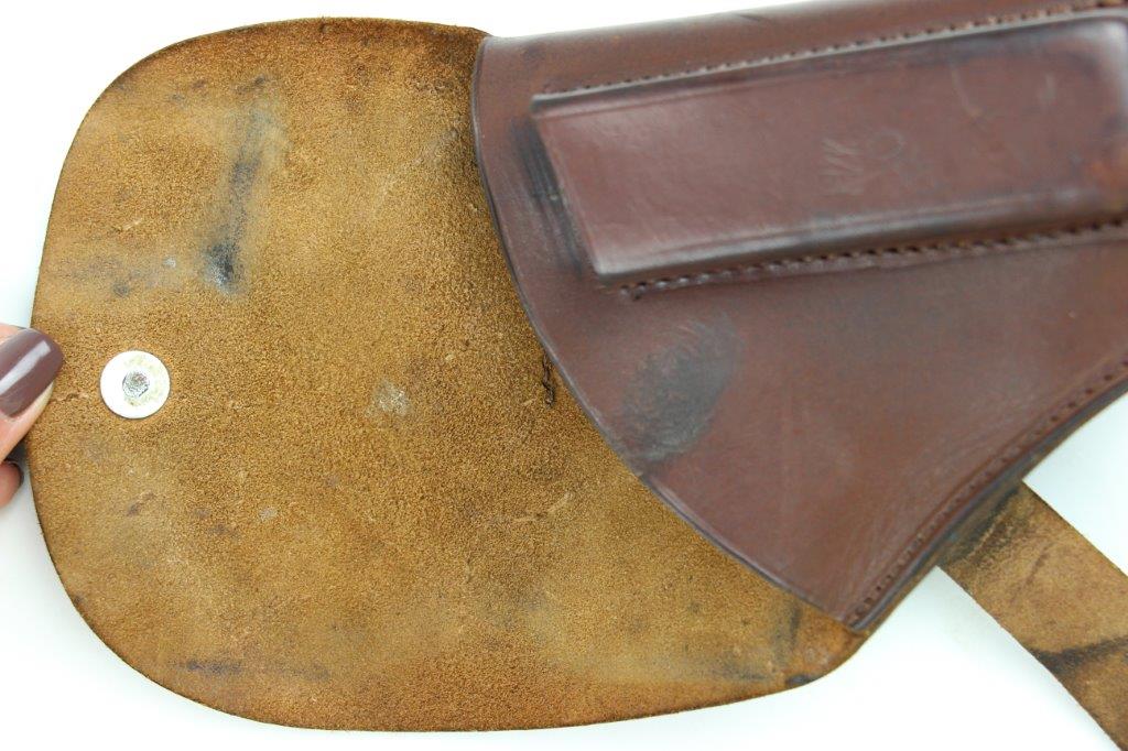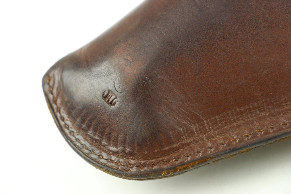2/28/24 – This is a rare variation Kriegsmarine proofed Mauser holster from WW2. The holster comes from the John James Collection, a well known and once-avid collector of WW2 holsters and memorabilia. This holster is desirable due to the early style Gothic “M” found on the Kriegsmarine Eagle/M proof stamp on the back leather. The eagle is faded and faint, yet still visible with the “m” being more visible. This is likely due to the position of the stamp on the back toe of the holster. The holster is in great overall condition with soft, pliable leather that shows normal wear and use. Fairly clean interior leather as well. The stitching is all original and in great shape, despite a few missing stitches on the bottom left corner of the belt loop. This doesn’t affect function and the belt loop is still very secure.