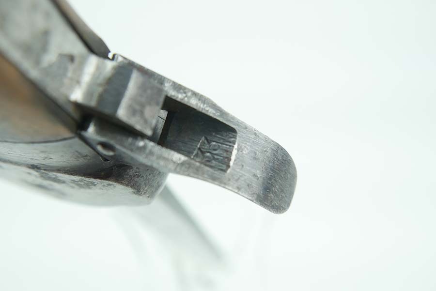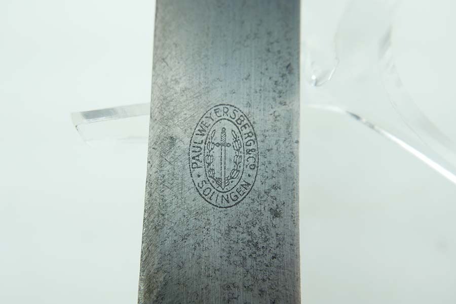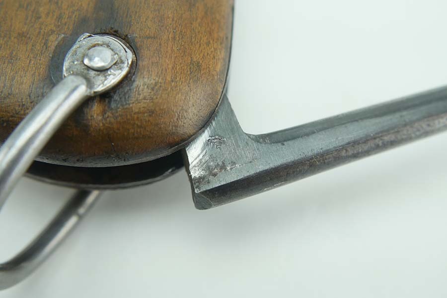 11/8/24 – This is an original Takedown style Luftwaffe Gravity Knife. The takedown style knives are the earlier wartime variation of Gravity knife and feature a square button for easily disassembly and repair. The knife is fully functional with properly locking pick and blade. The blade shows signs of use and sharpening along the edge. There’s surface oxidation and aging patina throughout the blade and pommel. The blade is maker stamped by Paul Weyersberg. The pommel still shows some traces of original finish, and more of the blued finish is found on the sides and on the release lever. The side pick is Waffen stamped, as shown. The wood is in great condition with some mild surface wear. The internal parts are matching numbered “33”.