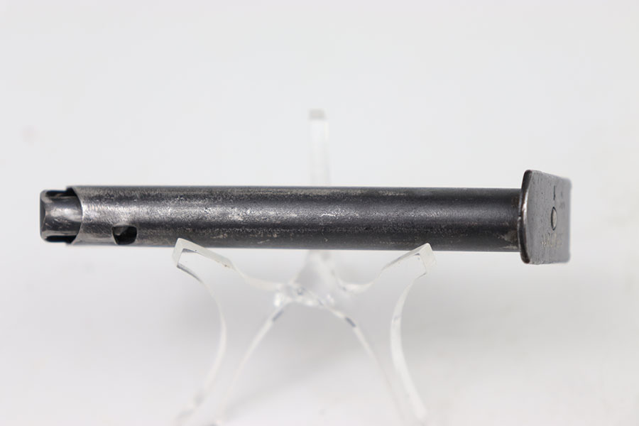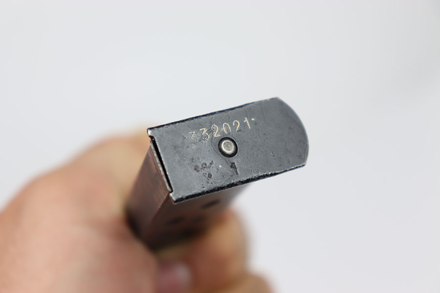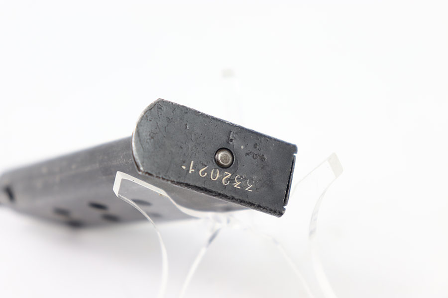 7/23/24 – This is an original numbered Walther PPK magazine. The magazine is a wartime production with serial number 332021 stamped on the base. The base is also marked with a 1 indicating it is the main magazine for this serial numbered ppk. This number is in the known range of Luftwaffe PPK pistols. The finish is good+ throughout this example with the majority of its finish loss on the left side of the magazine. Strong, functional spring.