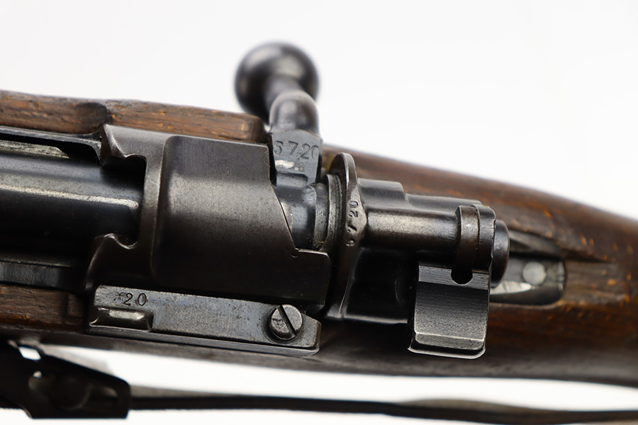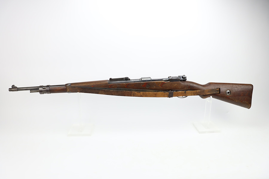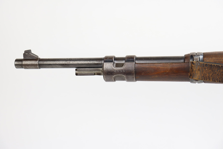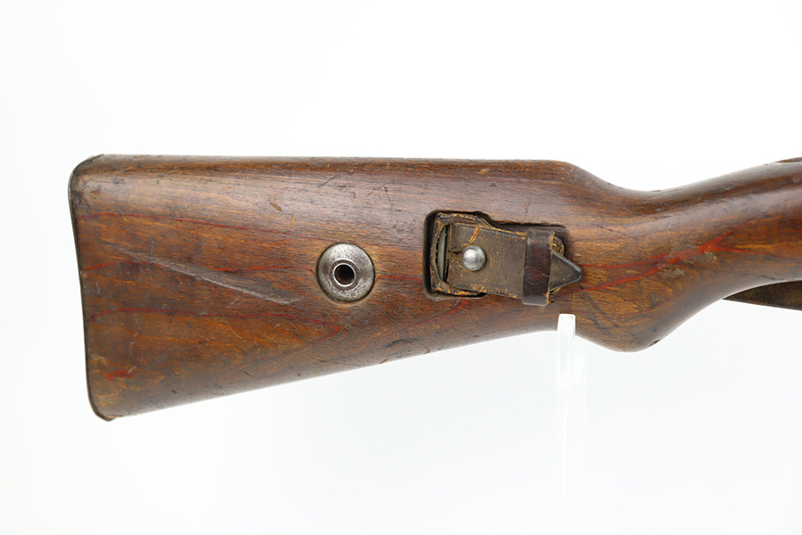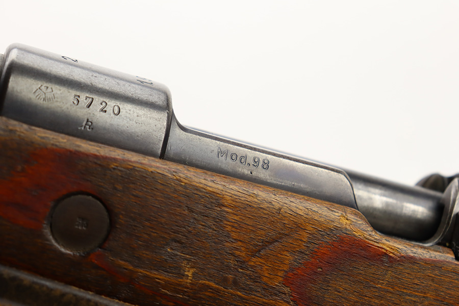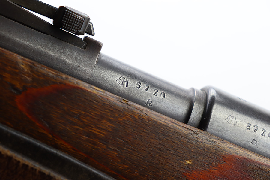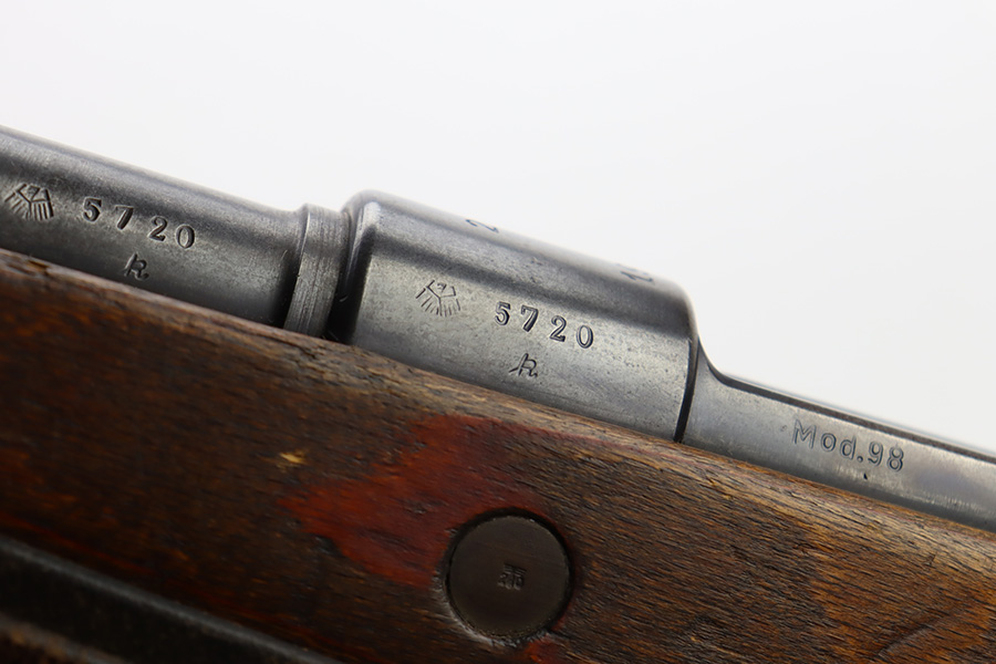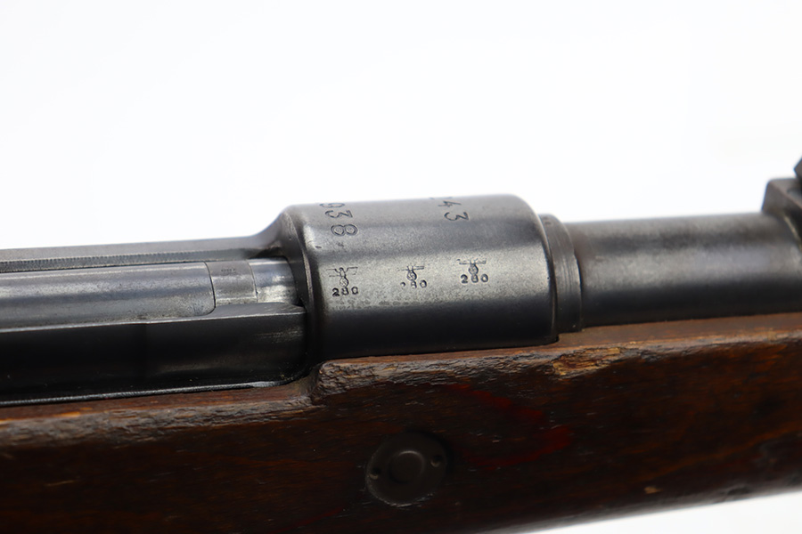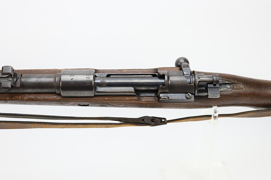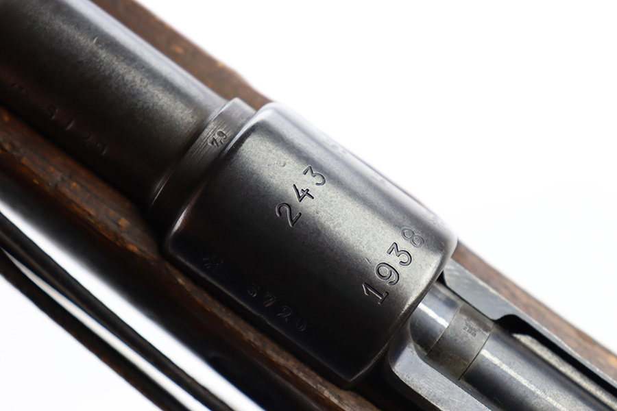 12/1/23 – This is a matching and original K98 that was made in 1938 for the German Army at the Mauser AG Borsigwalde factory. All numbered parts on the rifle match, including the receiver, barrel, bands, rear sight assembly, trigger assembly, floorplate, buttplate, stock, bolt, etc. The safety is unnumbered and was likely replaced/repaired at some point. The bluing on the rifle is original but shows some thinning and patina throughout, most pronounced on the trigger group and the barrel. Bore has good rifling but minor frost and freckling in the grooves. The stock shows handling wear and age with a thin gouge on the right face, but no structural issues. Comes with a worn but original leather sling.