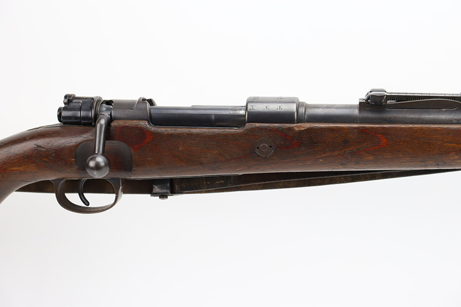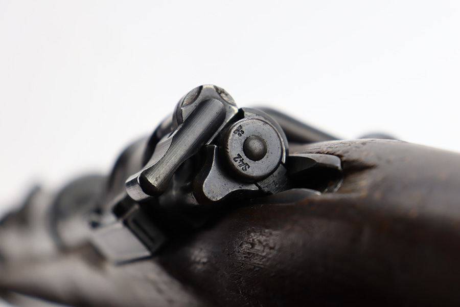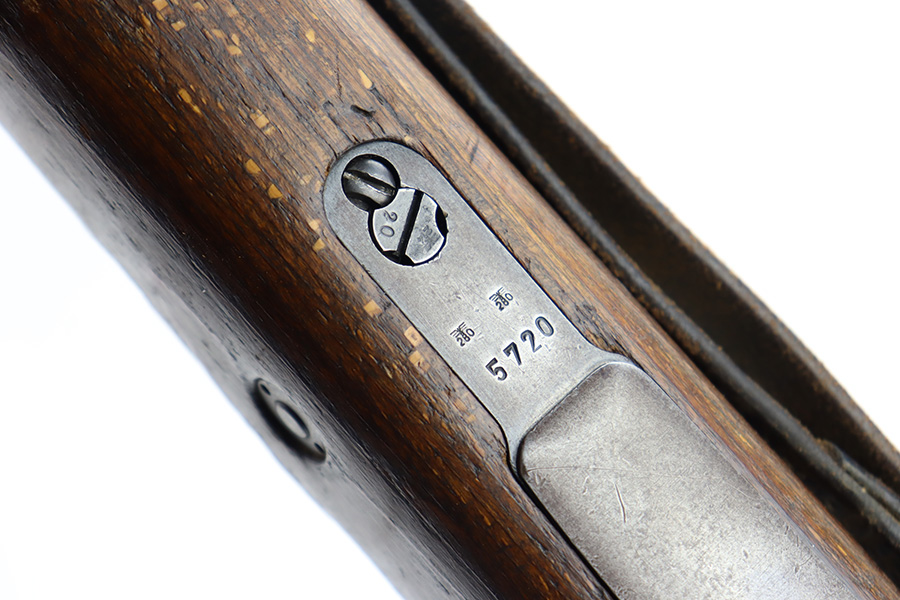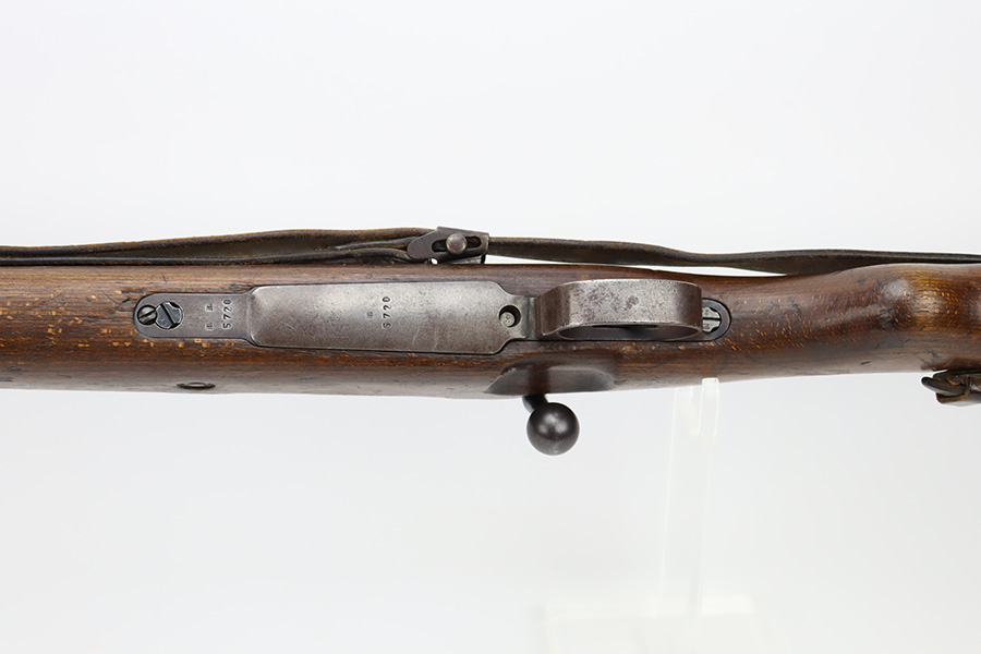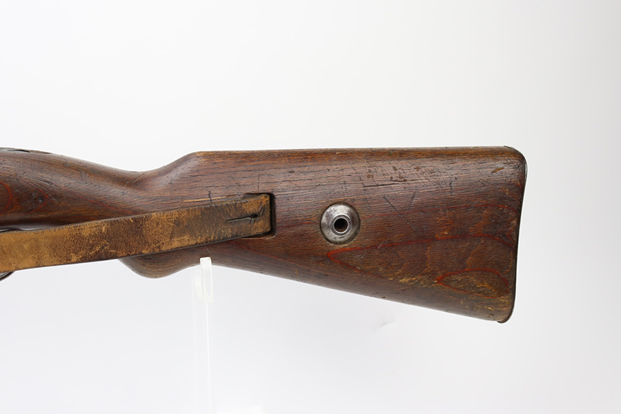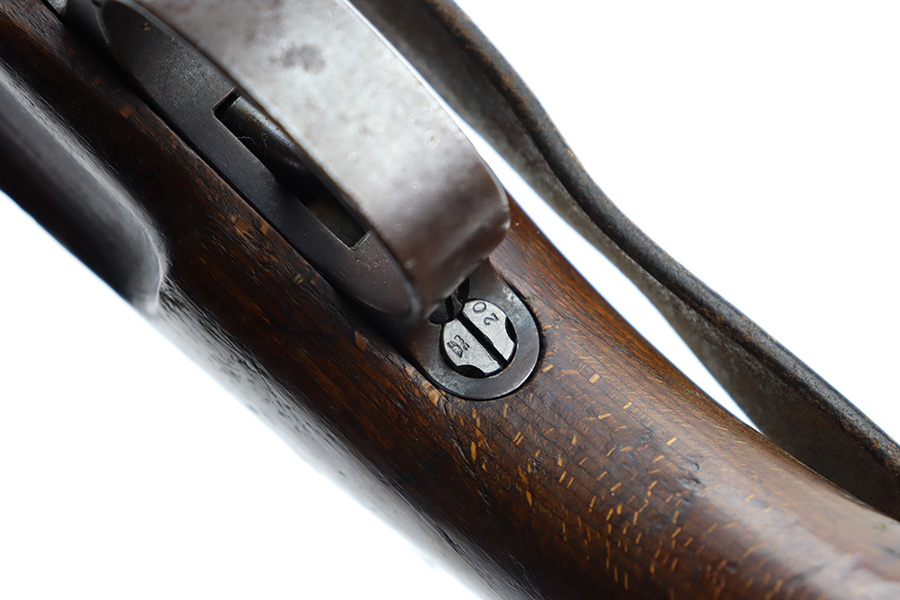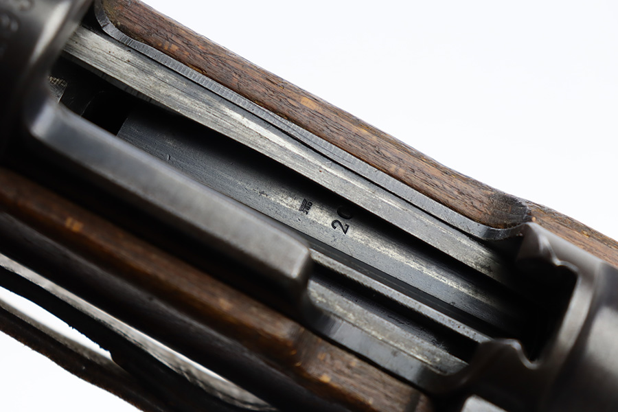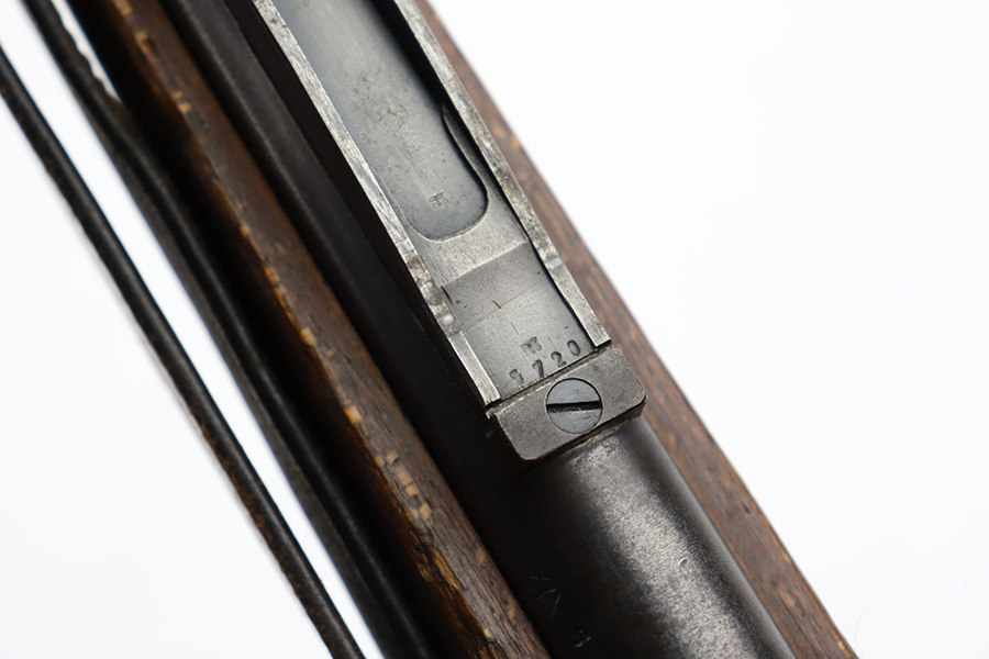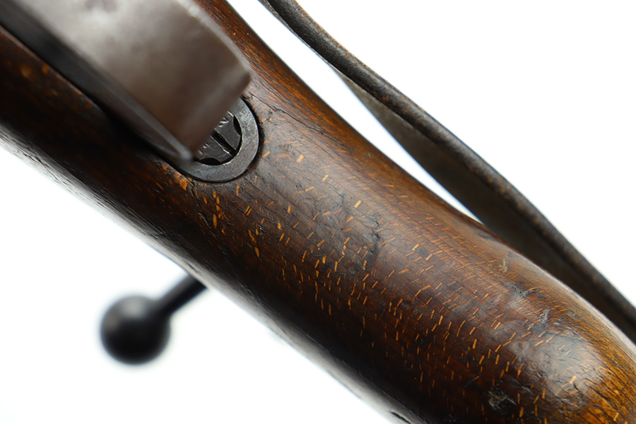 12/1/23 – This is a matching and original K98 that was made in 1938 for the German Army at the Mauser AG Borsigwalde factory. All numbered parts on the rifle match, including the receiver, barrel, bands, rear sight assembly, trigger assembly, floorplate, buttplate, stock, bolt, etc. The safety is unnumbered and was likely replaced/repaired at some point. The bluing on the rifle is original but shows some thinning and patina throughout, most pronounced on the trigger group and the barrel. Bore has good rifling but minor frost and freckling in the grooves. The stock shows handling wear and age with a thin gouge on the right face, but no structural issues. Comes with a worn but original leather sling.