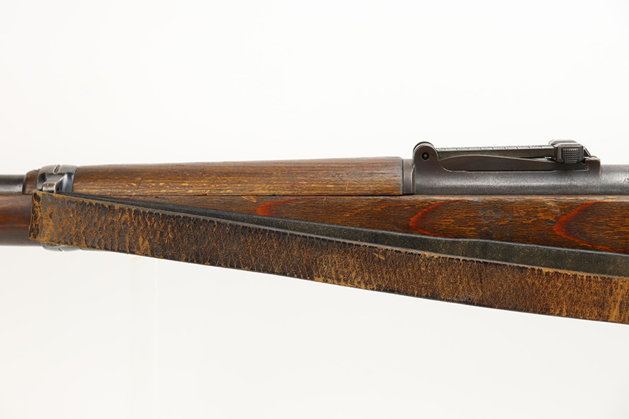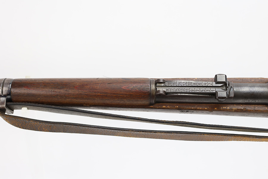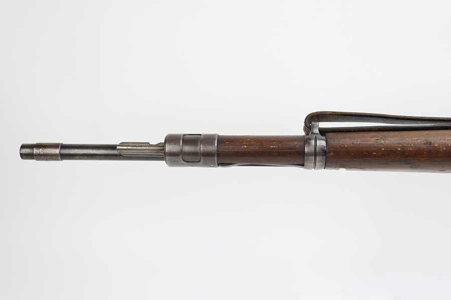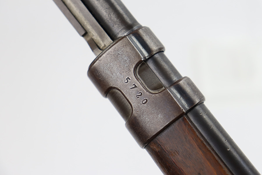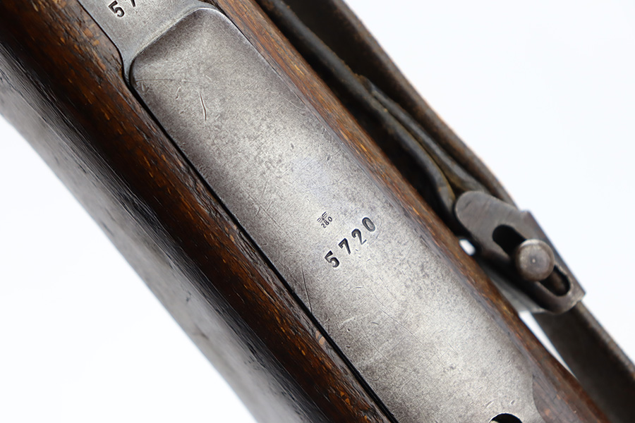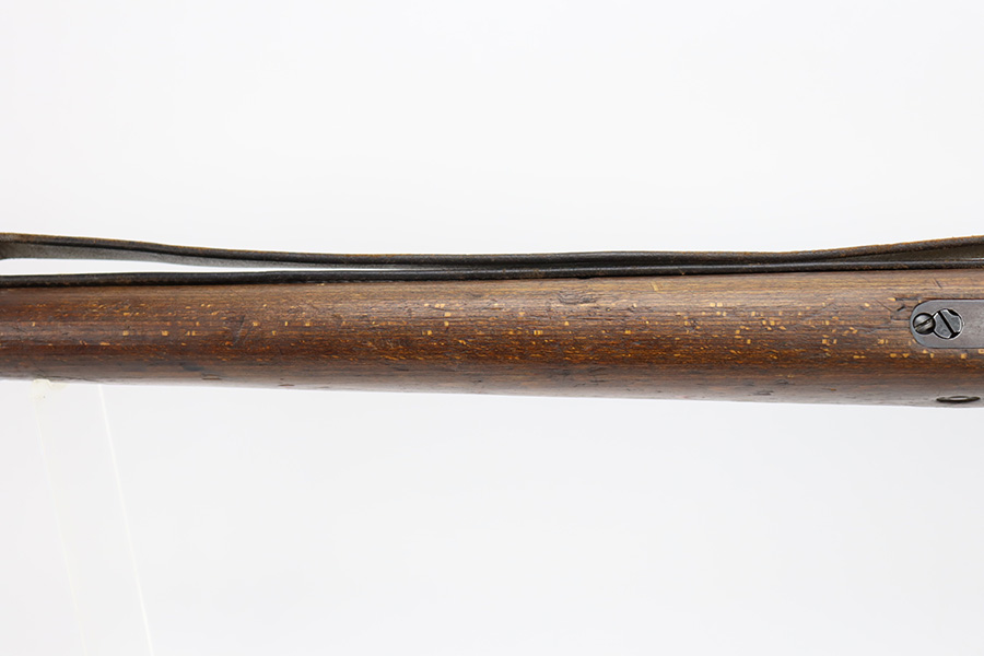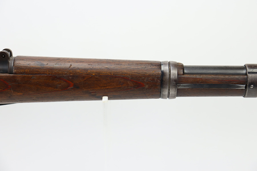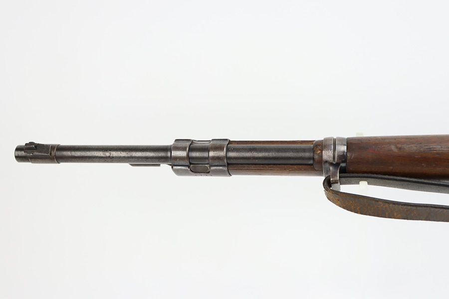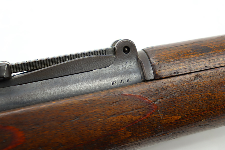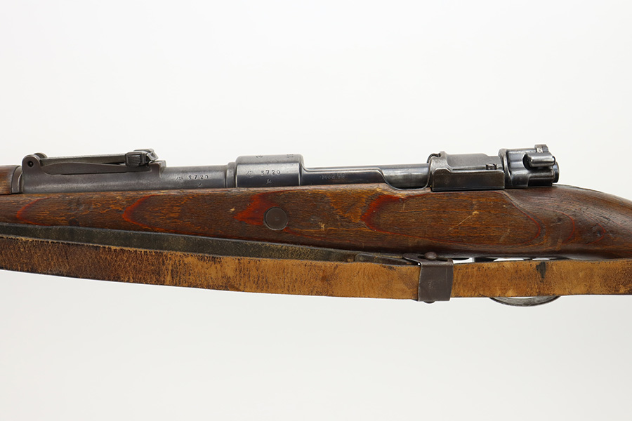 12/1/23 – This is a matching and original K98 that was made in 1938 for the German Army at the Mauser AG Borsigwalde factory. All numbered parts on the rifle match, including the receiver, barrel, bands, rear sight assembly, trigger assembly, floorplate, buttplate, stock, bolt, etc. The safety is unnumbered and was likely replaced/repaired at some point. The bluing on the rifle is original but shows some thinning and patina throughout, most pronounced on the trigger group and the barrel. Bore has good rifling but minor frost and freckling in the grooves. The stock shows handling wear and age with a thin gouge on the right face, but no structural issues. Comes with a worn but original leather sling.
