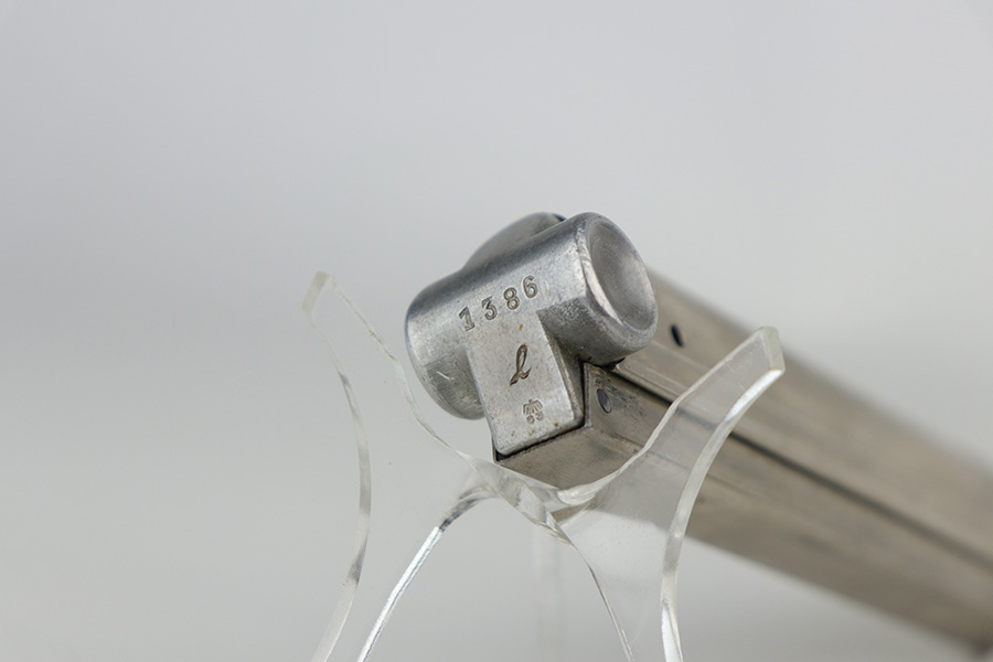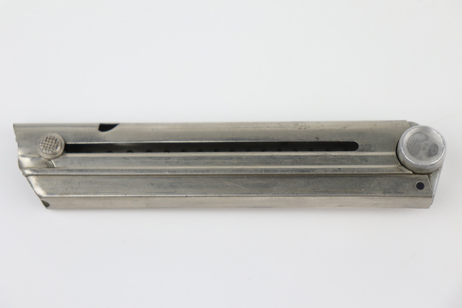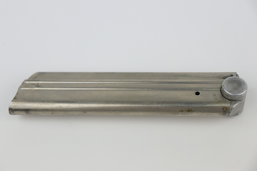 10/01/21 – This is a P.08 Luger magazine manufactured by Mauser during the WW2 era. The nickle tube is in great condition showing only minor areas of oxidation or patina and minor wear. The aluminum bottom of the magazine bears serial number “1386l” and an “eagle 63” acceptance stamp. The spring and follower are strong and functional.