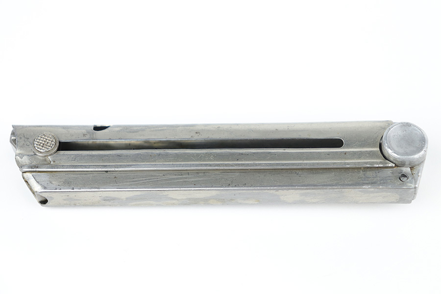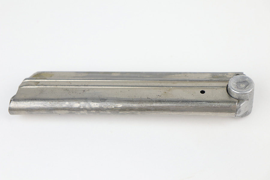 10/1/21 – This a P.08 Luger magazine manufactured by Mauser during the WW2 era. The nickel tube shows minor wear and patina throughout. The aluminum bottom shows serial number “7180n”, a “+” symbol, and an “eagle 63” acceptance stamp.