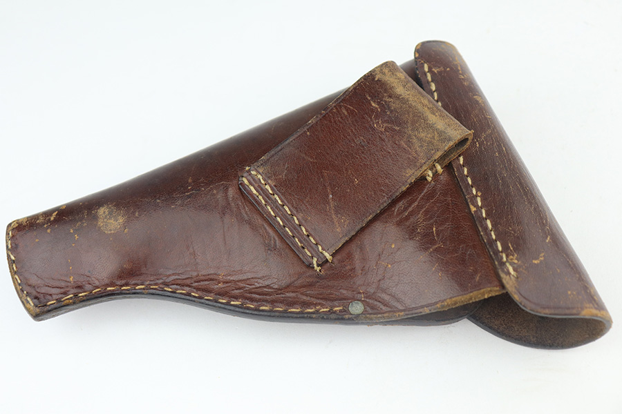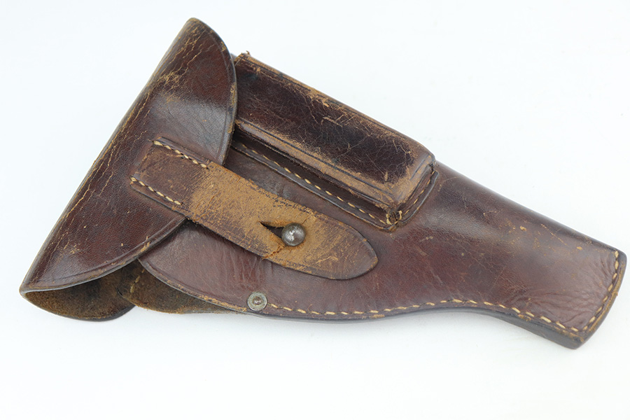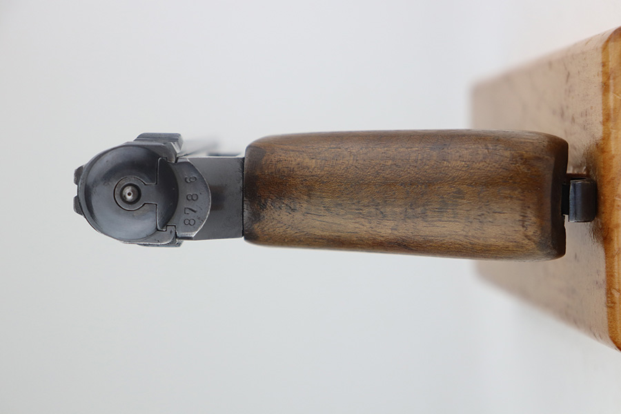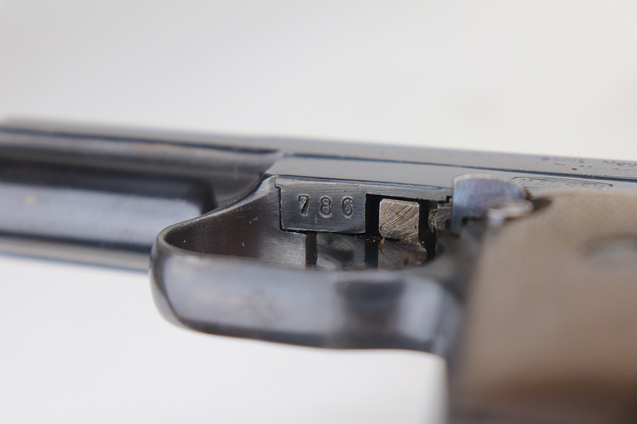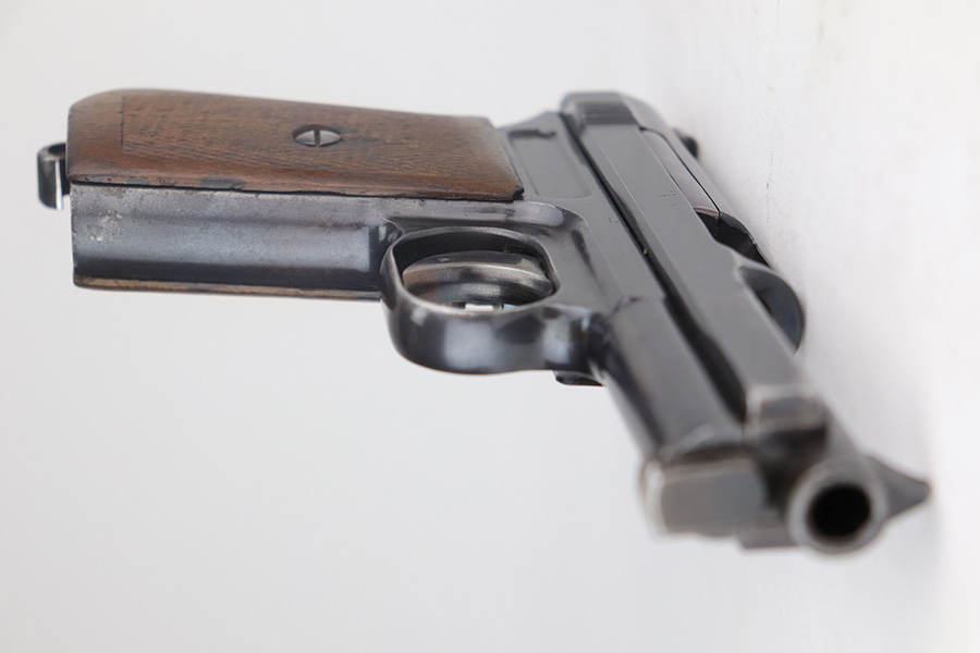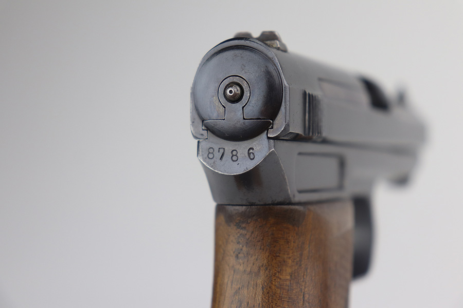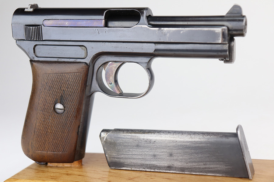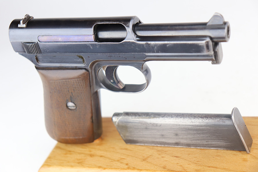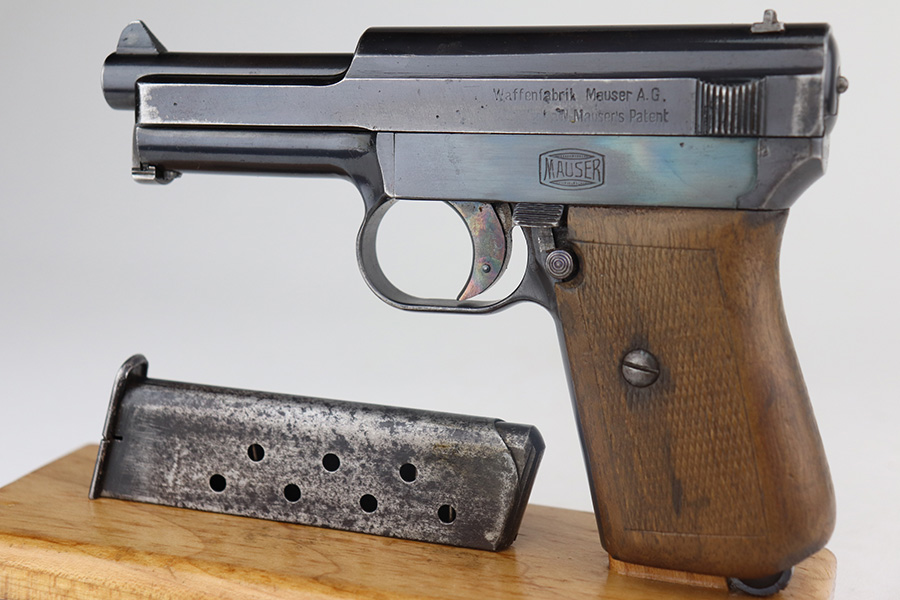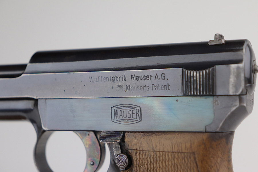 5/19/21 – This is a nice example of an early-production Mauser Model 1914. The gun comes with a proper holster and magazine. The left side of the gun has somewhat of a strange appearance. First, the serial number on the left side of the slide is missing, as is part of the slide legend – we’re not sure why. But the rest of the gun is matching. Second, the left side of the frame has a multicolored tint to it but shows no signs of being refinished. Third, there is a hard-edged bevel in the left side of the slide where the flat surface meets the curved surface. The gun has retained about 90% of its finish. There are some marks and spotty oxidation on the front strap. Minor wear around the muzzle and high edges of the slide. A couple of very small areas of minor pitting on the right side of the slide. Minor wear at the back left side of the slide. Comes with a nice wood grip with minor wear along the bottom edge. Excellent bore with strong rifling.