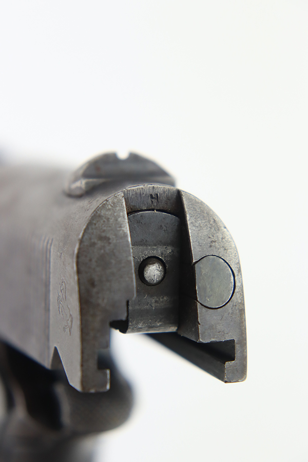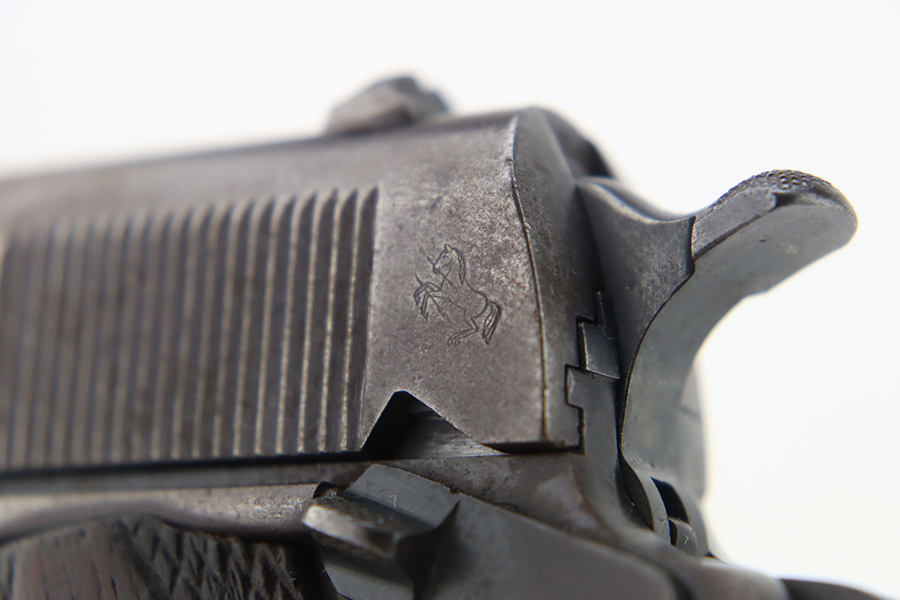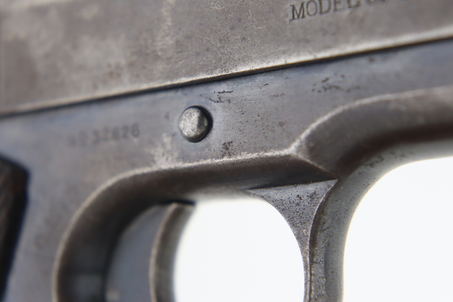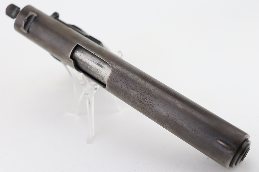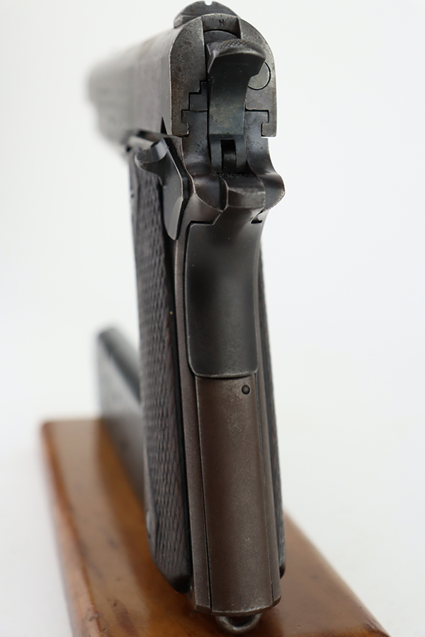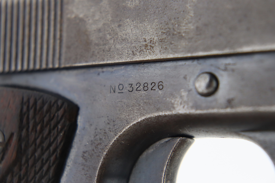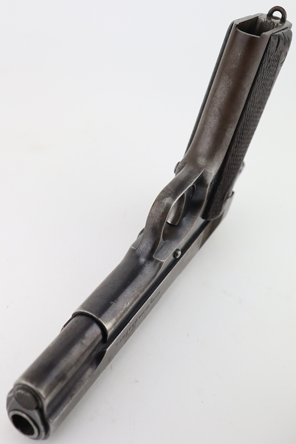1/16/24 – This is a scarce example of an early Colt Model 1911 that was one of 700 shipped to Benicia Arsenal on May 28, 1913. The pistol is original throughout with proper early barrel showing disconnected ‘P’ and ‘H’ markings horizontally on barrel. The bluing is original but has obviously been handled and used a fair amount, with thinning, patina and oxidation throughout. Bore has strong rifling with minor signs of use. The original wood grips show some smoothing but no cracks. Postwar magazine. Roughly 43,000 produced in 1913.