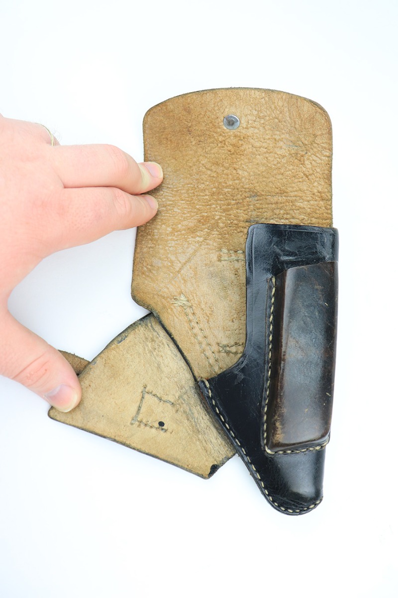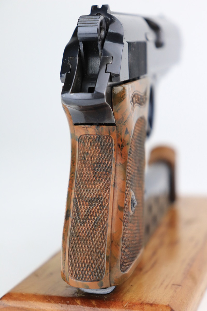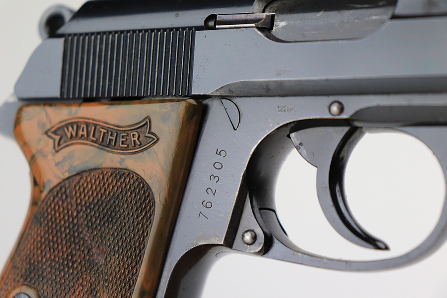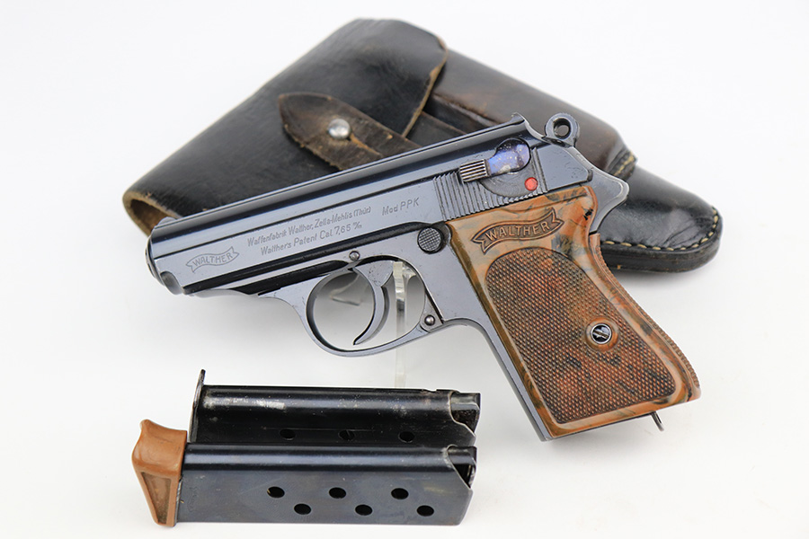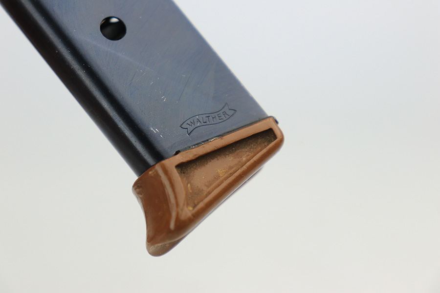 5/2/22 – This is a minty example of an early Walther PPK sold in the commercial market in 1933. The gun is all matching and has early features such as the “upside-down” serial numbering on the frame, 90 degree safety lever, and the “Crown N” firing proofs on the slide and frame instead of the ejection port. It comes as a rig with a generic unmarked leather holster, an early “no lip” finger extension magazine, and one spare Walther banner-only flat bottom magazine. The gun itself has retained about 98% of its original high polish finish. There are a few small dots of discoloration on the right side of the frame, on the front strap, and on the safety lever. There are a few small dots of oxidation here and there along the slide and a few very light scratches on the right side of the slide. Comes with a very nice brown grip with a few very light hairline cracks in the spine and on the right side. The bore is near-mint.