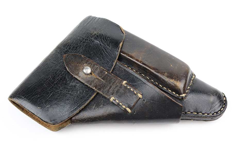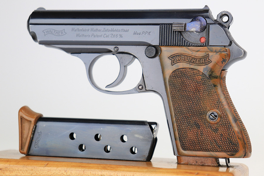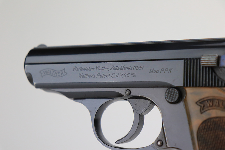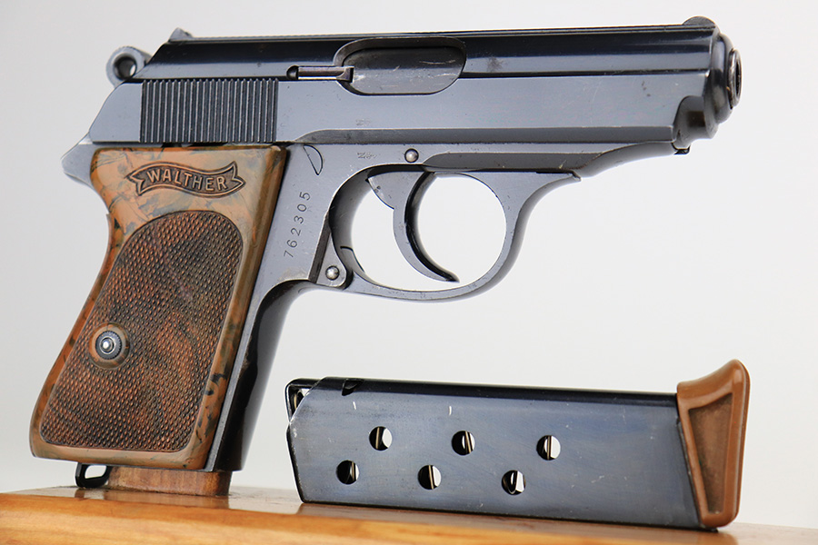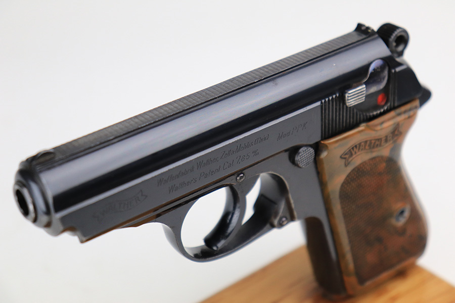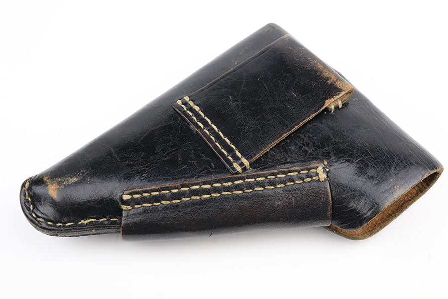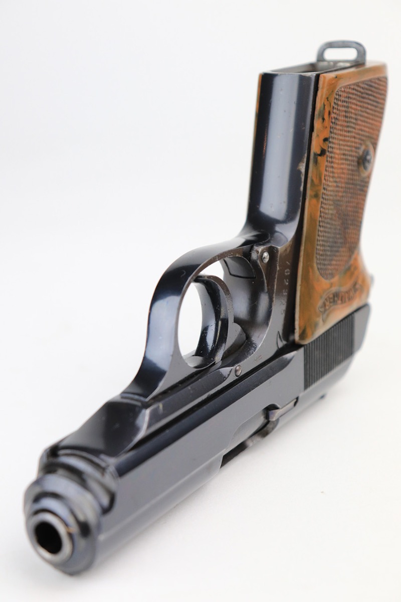 5/2/22 – This is a minty example of an early Walther PPK sold in the commercial market in 1933. The gun is all matching and has early features such as the “upside-down” serial numbering on the frame, 90 degree safety lever, and the “Crown N” firing proofs on the slide and frame instead of the ejection port. It comes as a rig with a generic unmarked leather holster, an early “no lip” finger extension magazine, and one spare Walther banner-only flat bottom magazine. The gun itself has retained about 98% of its original high polish finish. There are a few small dots of discoloration on the right side of the frame, on the front strap, and on the safety lever. There are a few small dots of oxidation here and there along the slide and a few very light scratches on the right side of the slide. Comes with a very nice brown grip with a few very light hairline cracks in the spine and on the right side. The bore is near-mint.