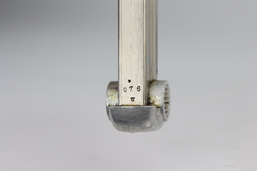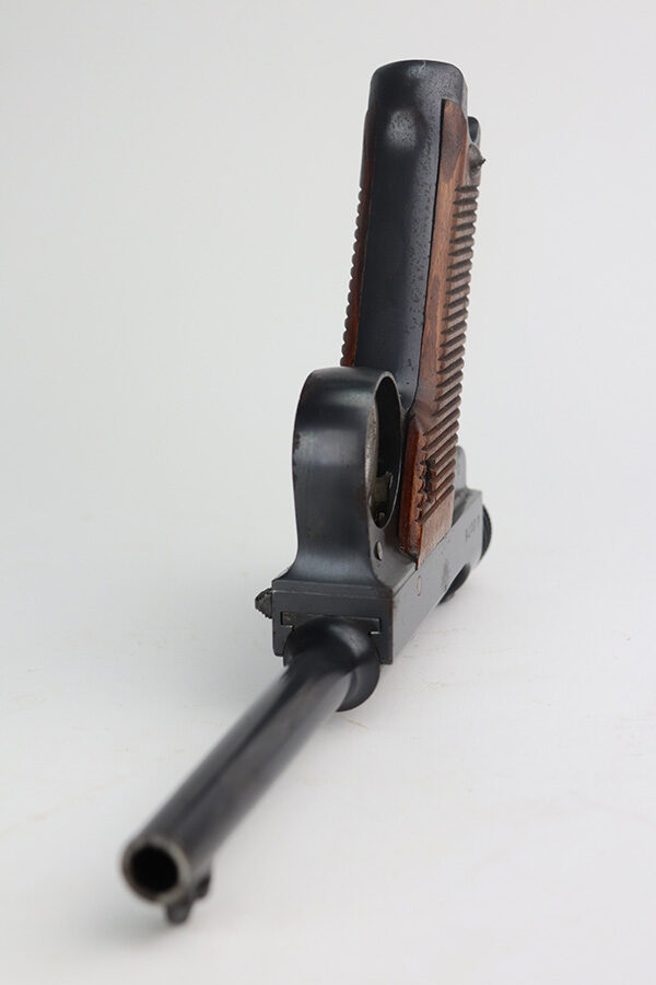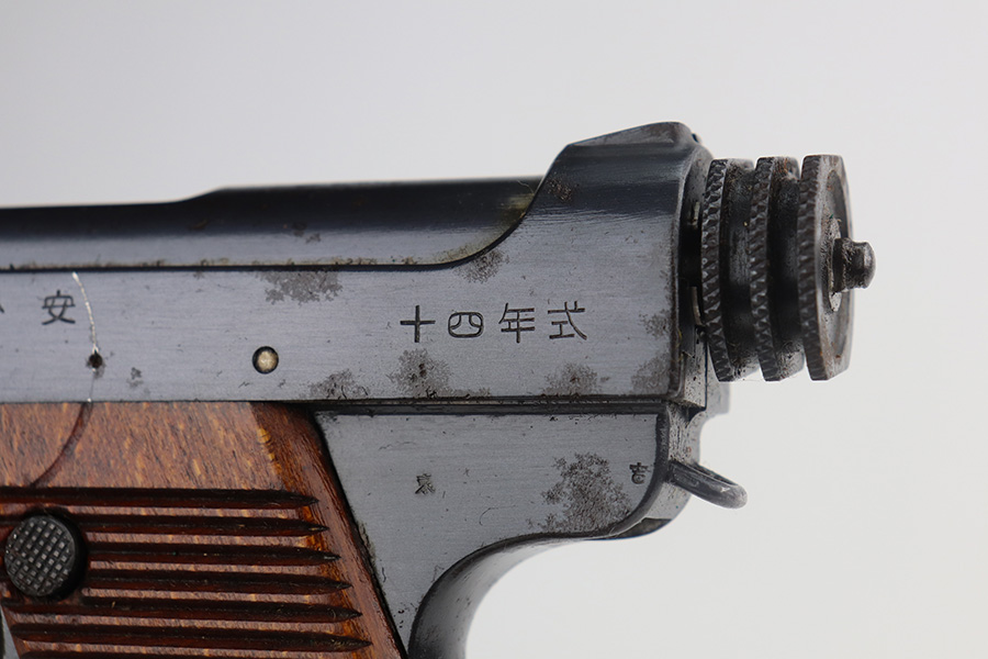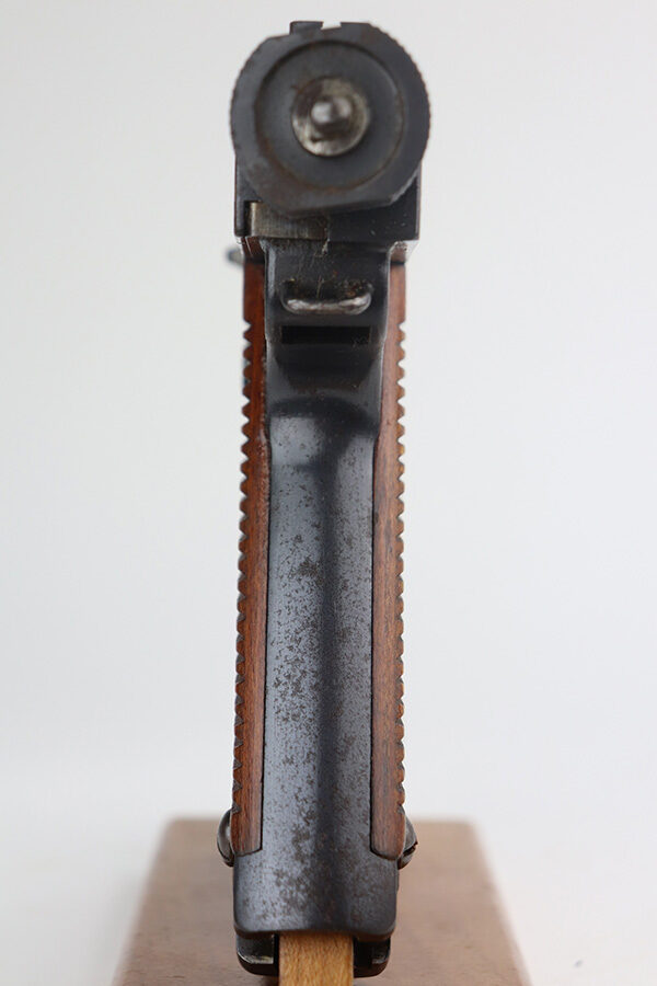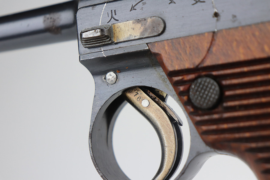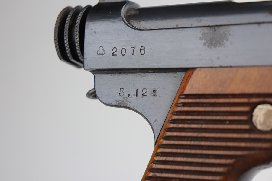 6/7/21 – This is an excellent example of an early Nambu Type 14 issued to the Japanese military in December of 1928. It is all matching and comes with one original matching magazine. It has retained about 98% of its original bluing. While there is very little actual finish loss, there are spots of noticeable oxidation and pitting on the frame and barrel. Spotty freckling on both straps. Comes with excellent matching grips. Shiny, minty bore.