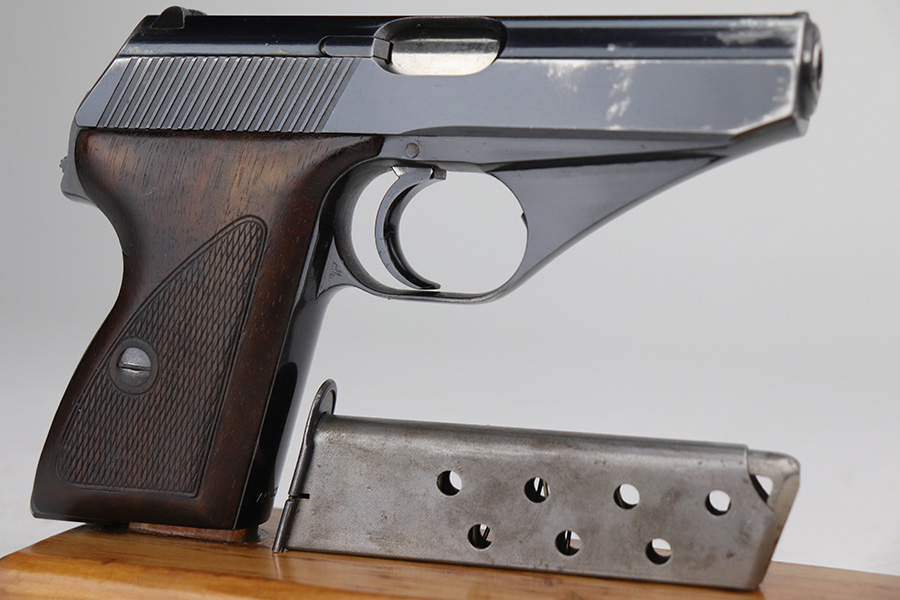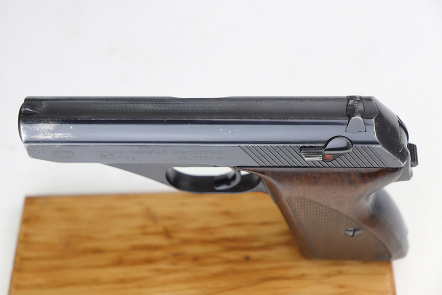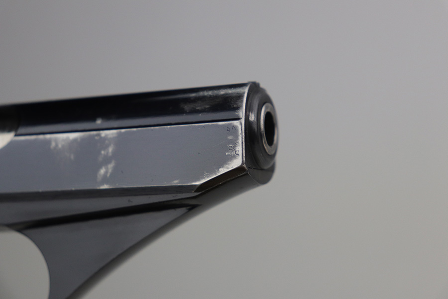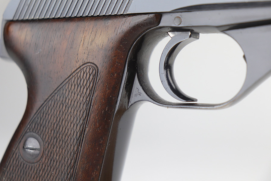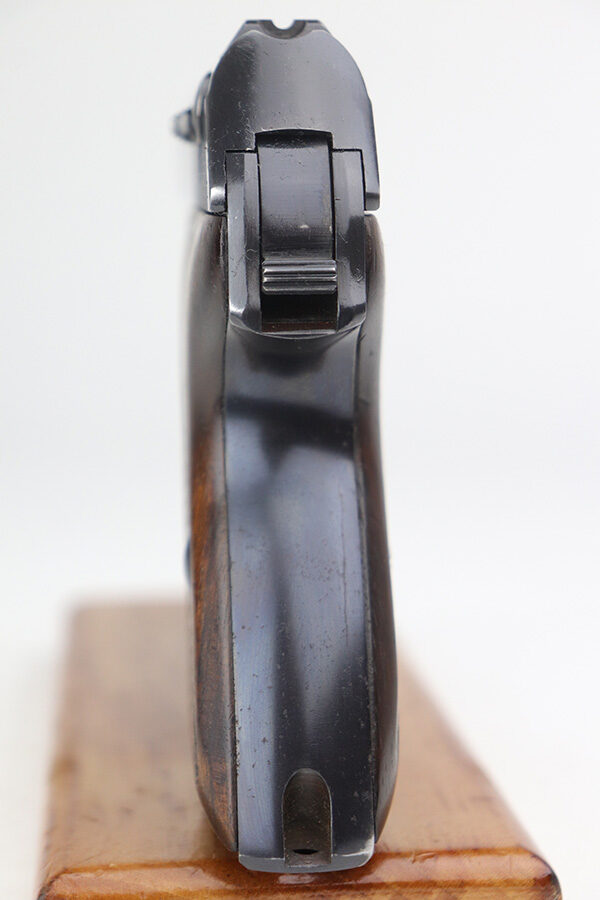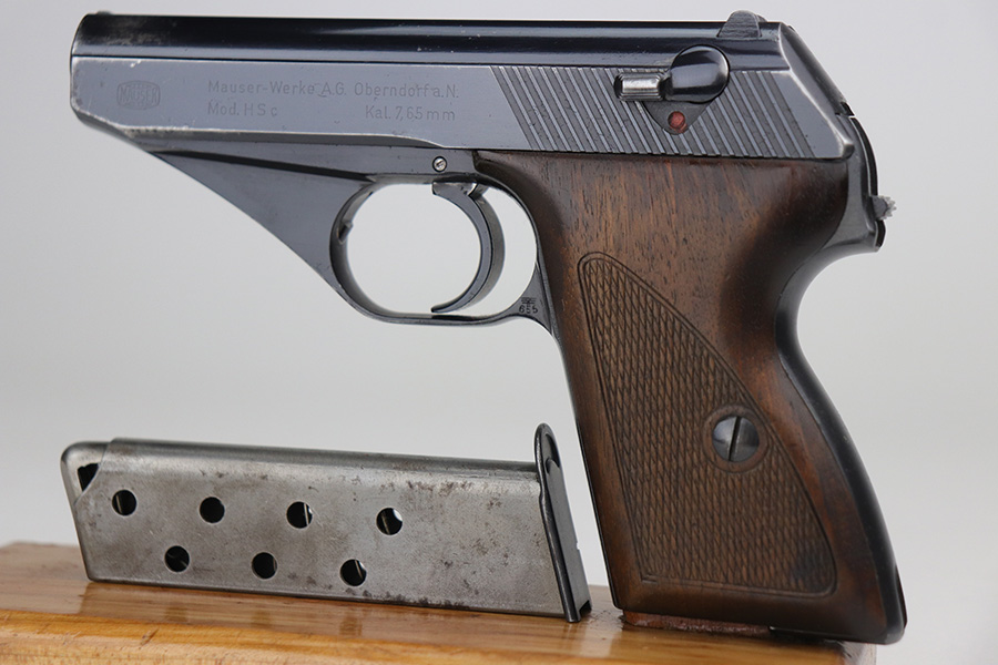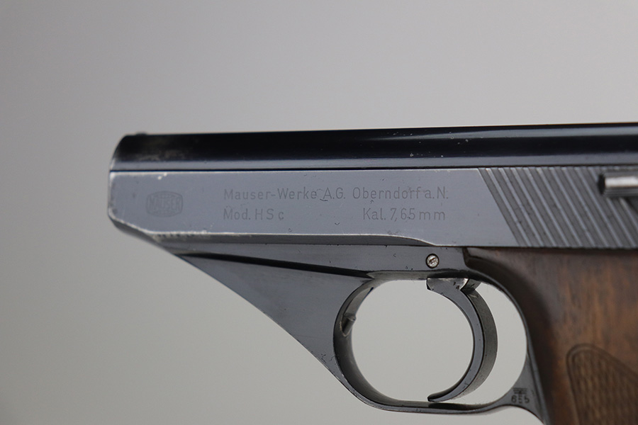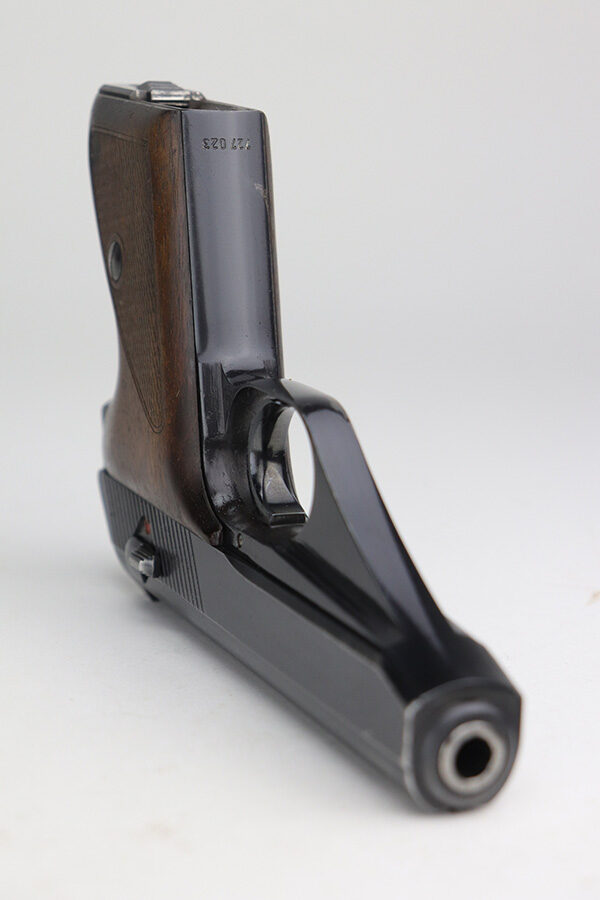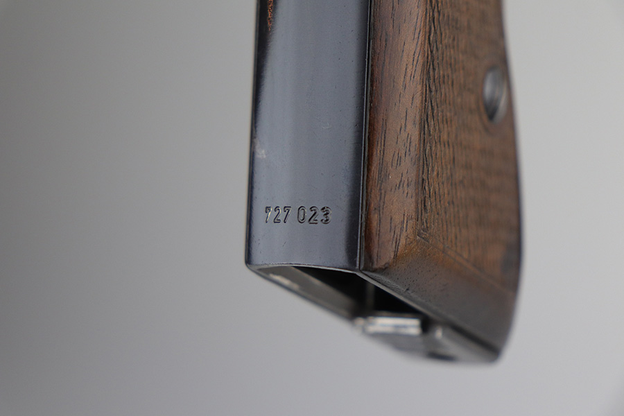 11/5/21 – This is a very nice example of an early Mauser HSC issued to the Nazi military in 1941. It is all matching and has early features such as the “Eagle 655” Nazi military acceptance proof and early high polish finish. It has retained about 92-93% of its original bluing. Most of the finish loss is spotty wear around the muzzle and an area of spotty wear on the right side of the slide. There is also very minor wear on the high edges of the slide and one small spot of wear on the front grip strap. There is an area with tiny dots of discoloration on the top of the slide. Some minor freckling on the back strap. Comes with excellent period-correct grips and a half-moon magazine. The bore is mint.