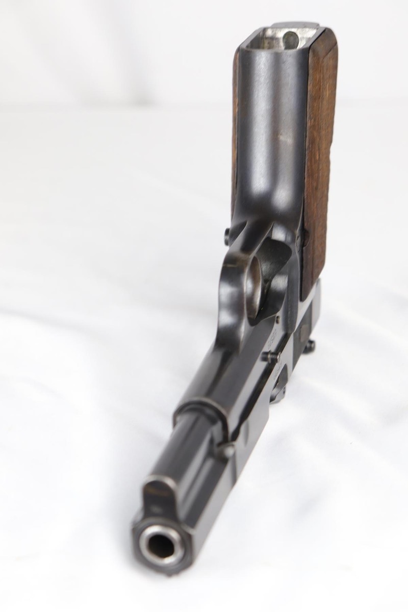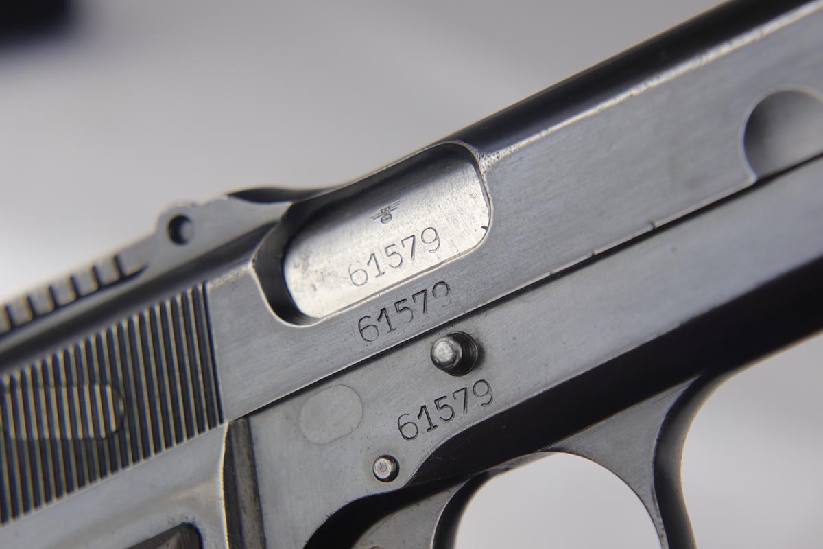 9/25/18 – This is an early Browning Hi Power with tangent sight and scarce WaA613 proofs on frame and slide. The pistol is Nazi issued and fully original and matching with correct and matching proof marked magazine. (Magazine is WaA613 as well) . The bluing rates in the Mid 90s with high edge thinning and freckling, and some thinning/patina on the straps. Grips are in great condition and the bore is very nice.