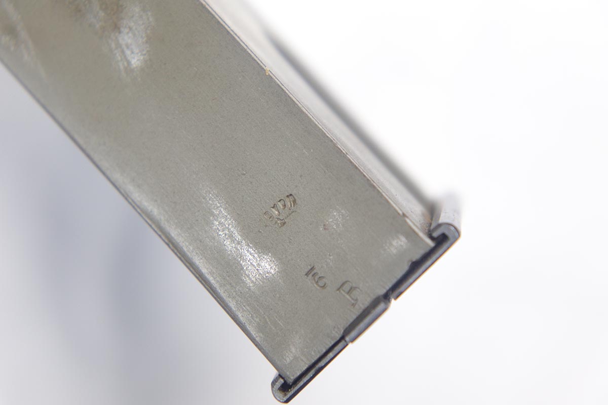 8/9/18 – This is an early Nazi Browning High Power with tangent sight and WaA103 proofs on slide and frame. It is all original and correct with about 95-96 blue remaining. The slide is very nice but the straps show some patina coming through. 500-meter tangent sight and waffen proofed magazine. Rare phosphate magazine with WaA613 proof. Original grips but note that the right panel has a crack that has been repaired. Very nice bore with no major flaws.