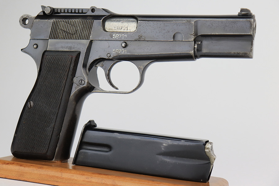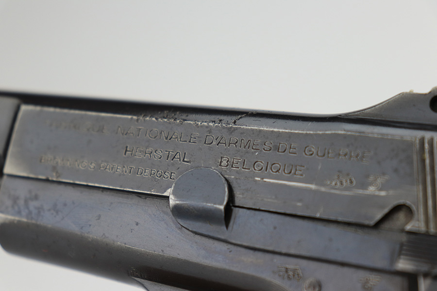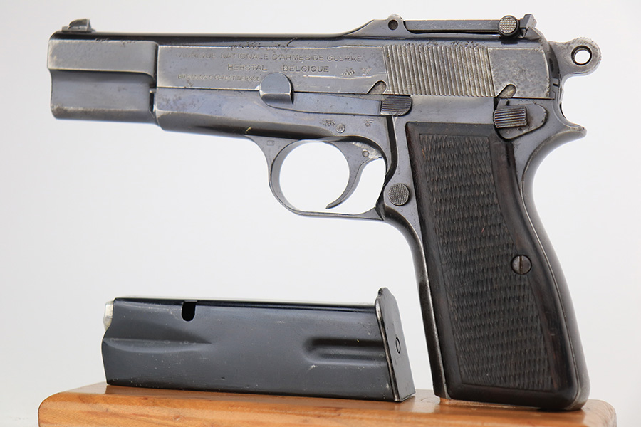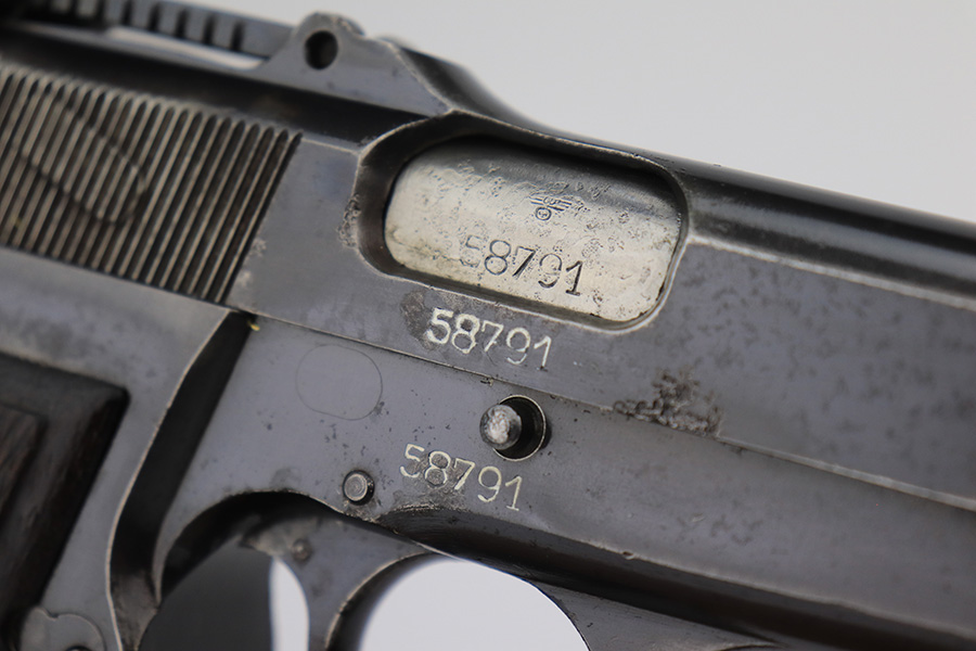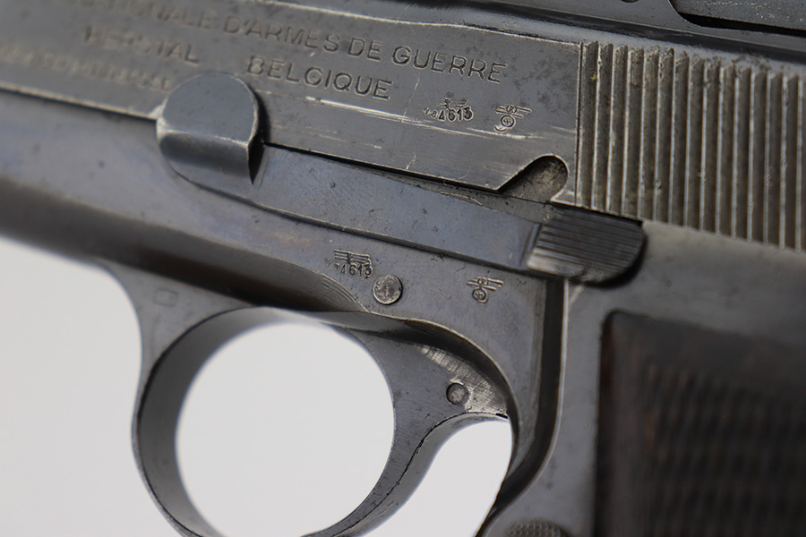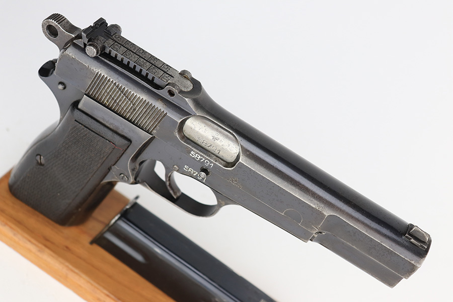 3/31/23 – This is an early FN Browning Hi Power issued to the Nazi military during WW2. It is all matching, has the proper early “Waffen 613” proofs throughout, and has an early adjustable tangent rear sight. It has retained roughly 85% of its original bluing. Most of the actual finish loss is on the grip straps. There is noticeable spotty oxidation on the grip straps as well and along the slide. Areas of pitting here and there on the slide, around the trigger guard, and one small spot at the base of the front strap. Nice period-correct wood grips. Comes with an un-marked magazine. The bore has great rifling with some light freckling in the grooves.