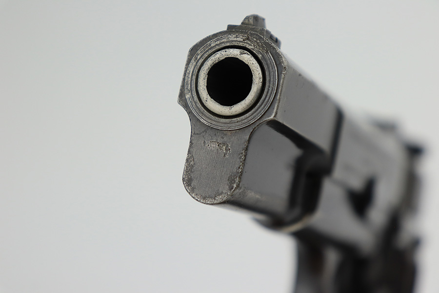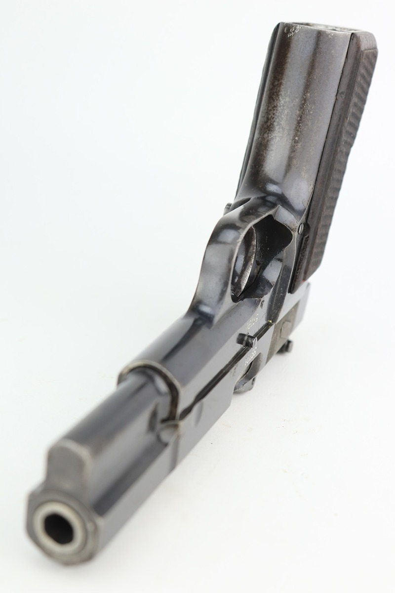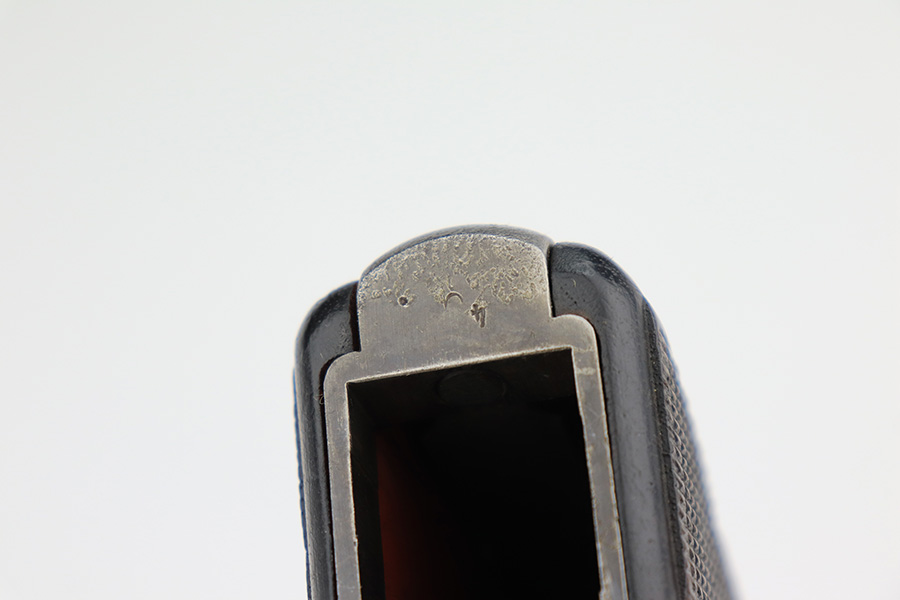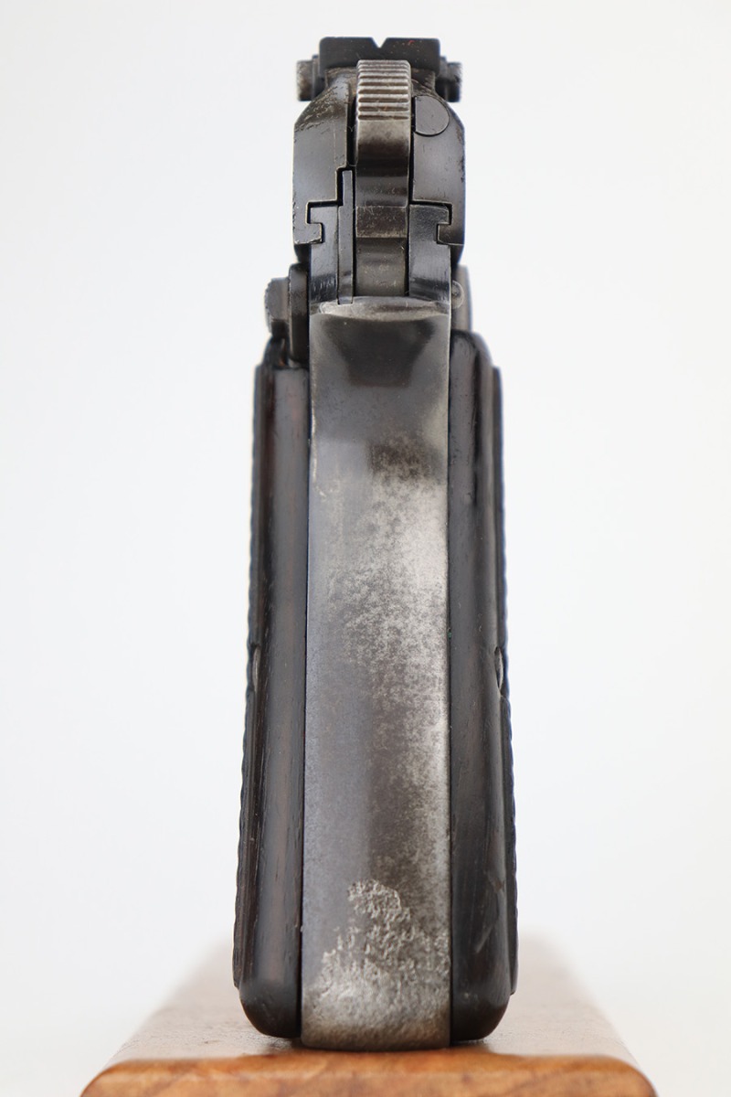 3/31/23 – This is an early FN Browning Hi Power issued to the Nazi military during WW2. It is all matching, has the proper early “Waffen 613” proofs throughout, and has an early adjustable tangent rear sight. It has retained roughly 85% of its original bluing. Most of the actual finish loss is on the grip straps. There is noticeable spotty oxidation on the grip straps as well and along the slide. Areas of pitting here and there on the slide, around the trigger guard, and one small spot at the base of the front strap. Nice period-correct wood grips. Comes with an un-marked magazine. The bore has great rifling with some light freckling in the grooves.