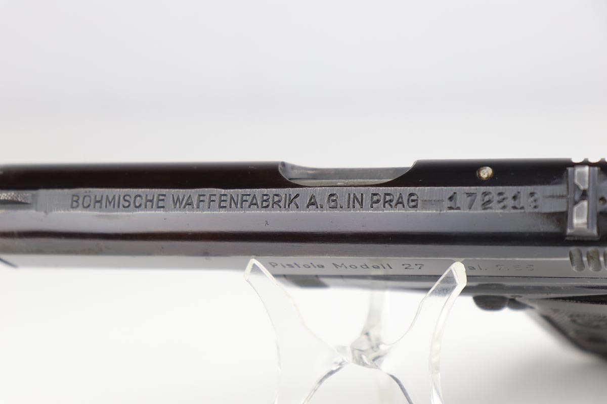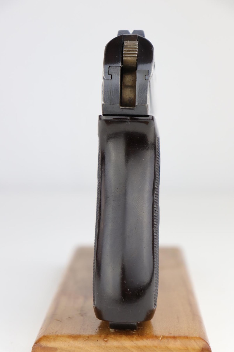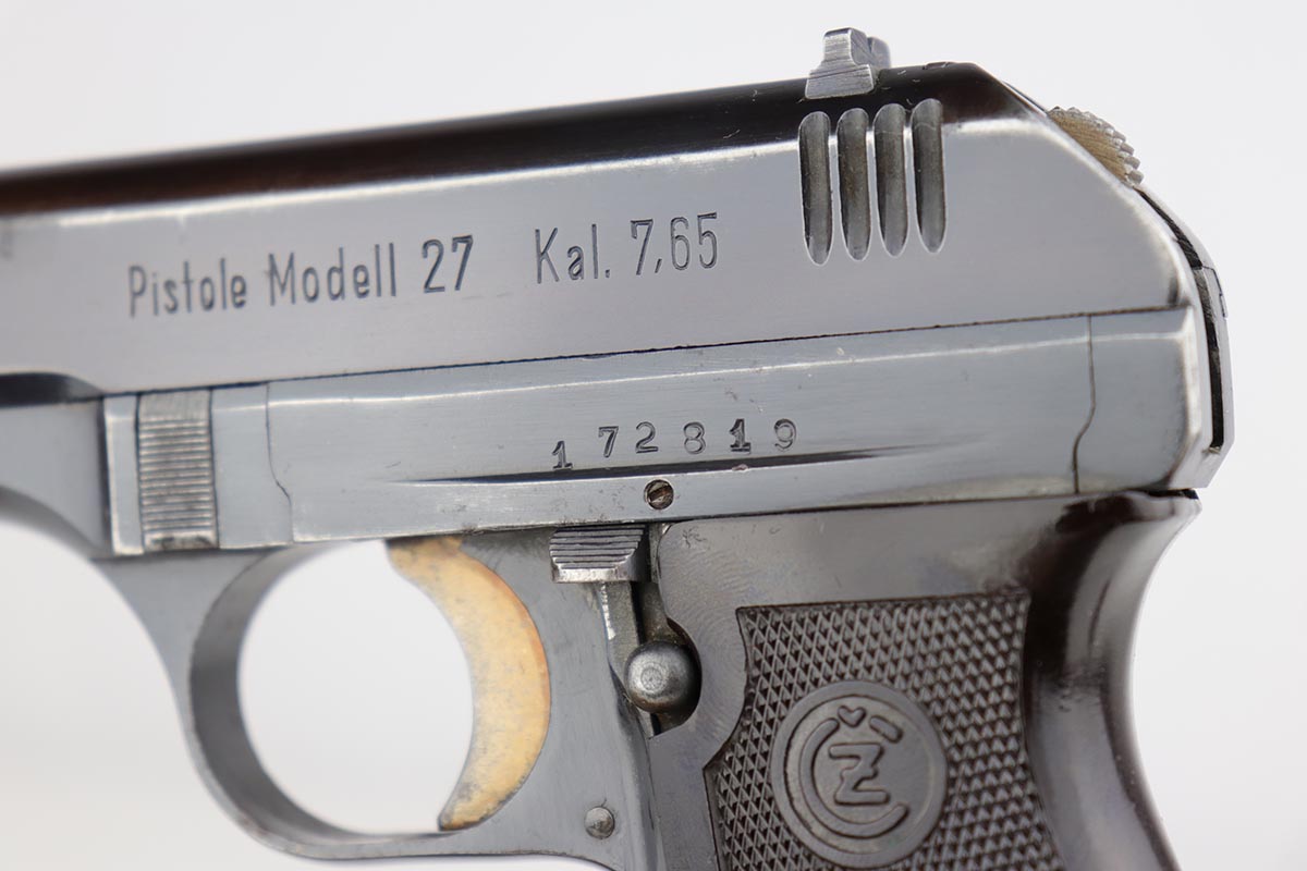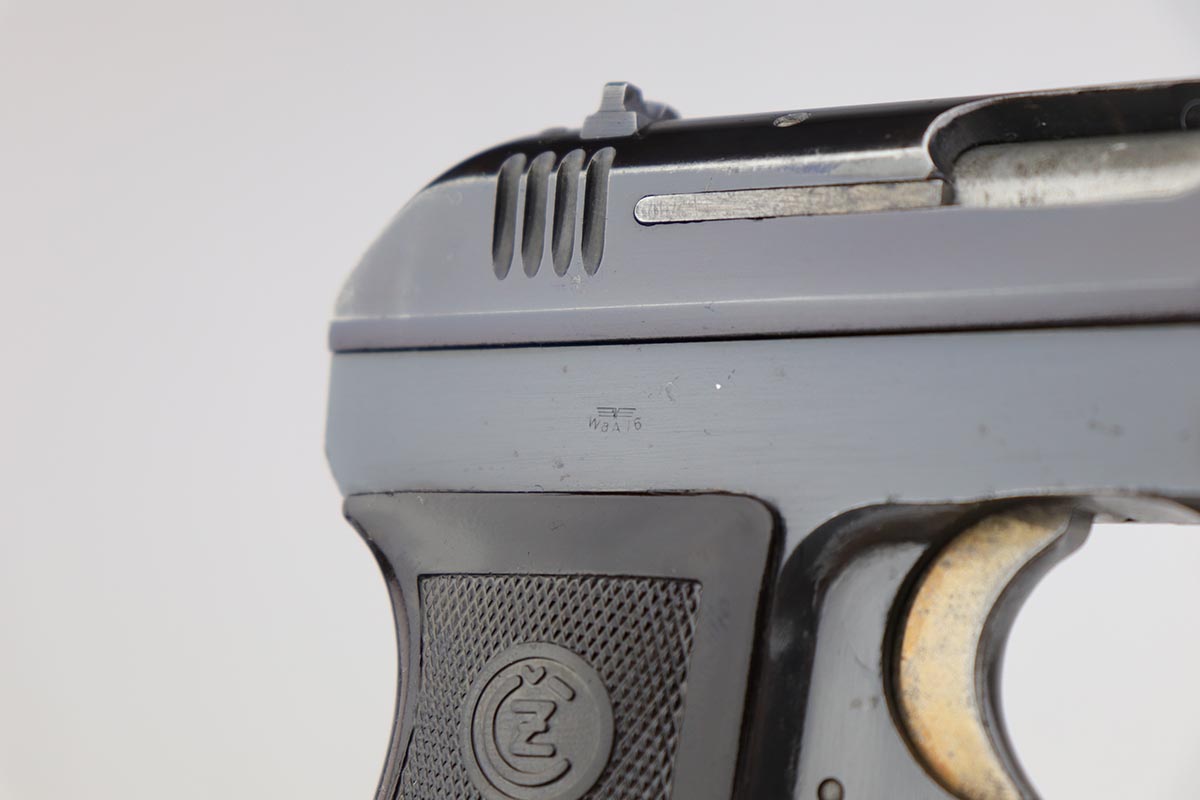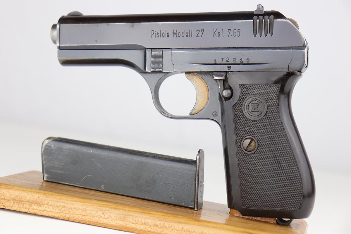 5/8/19 – This is a very nice example of a Nazi issued CZ model 27 with earlier high-polish blue. The pistol is all matching and original with about 95% blue remaining, showing common high point wear with some patina on the front strap and an area of freckling along the left side slide edge. Nice original grip, but both sides have the common corner chip. Correct magazine. Bore is shiny with strong rifling, but does have a small area of freckling in it.