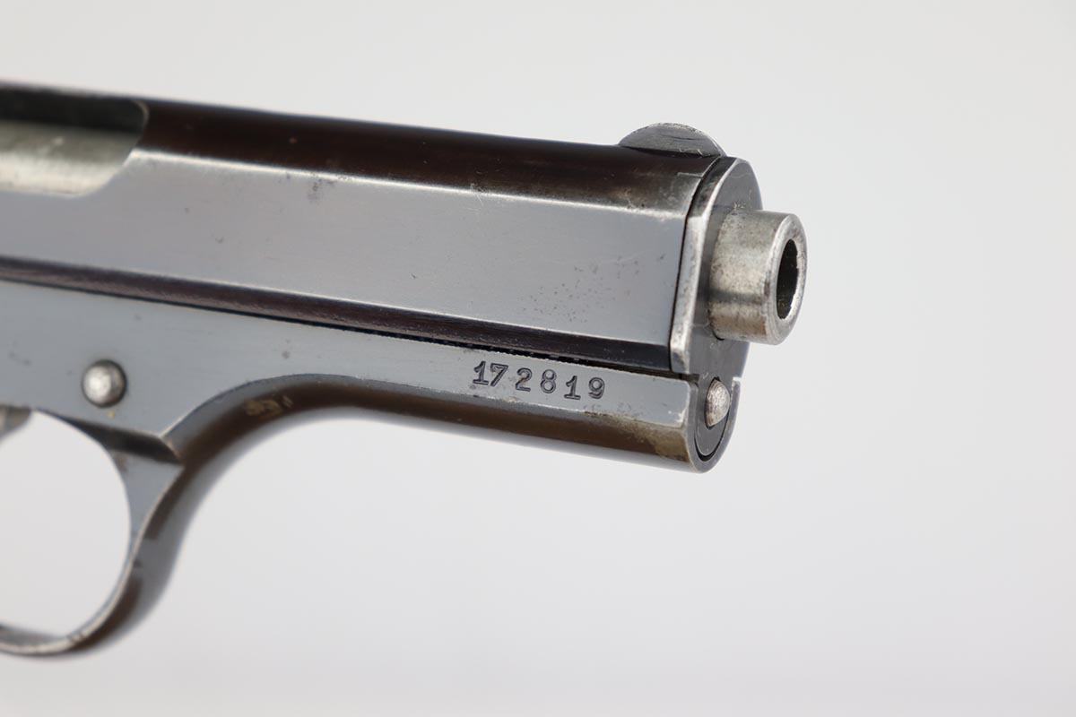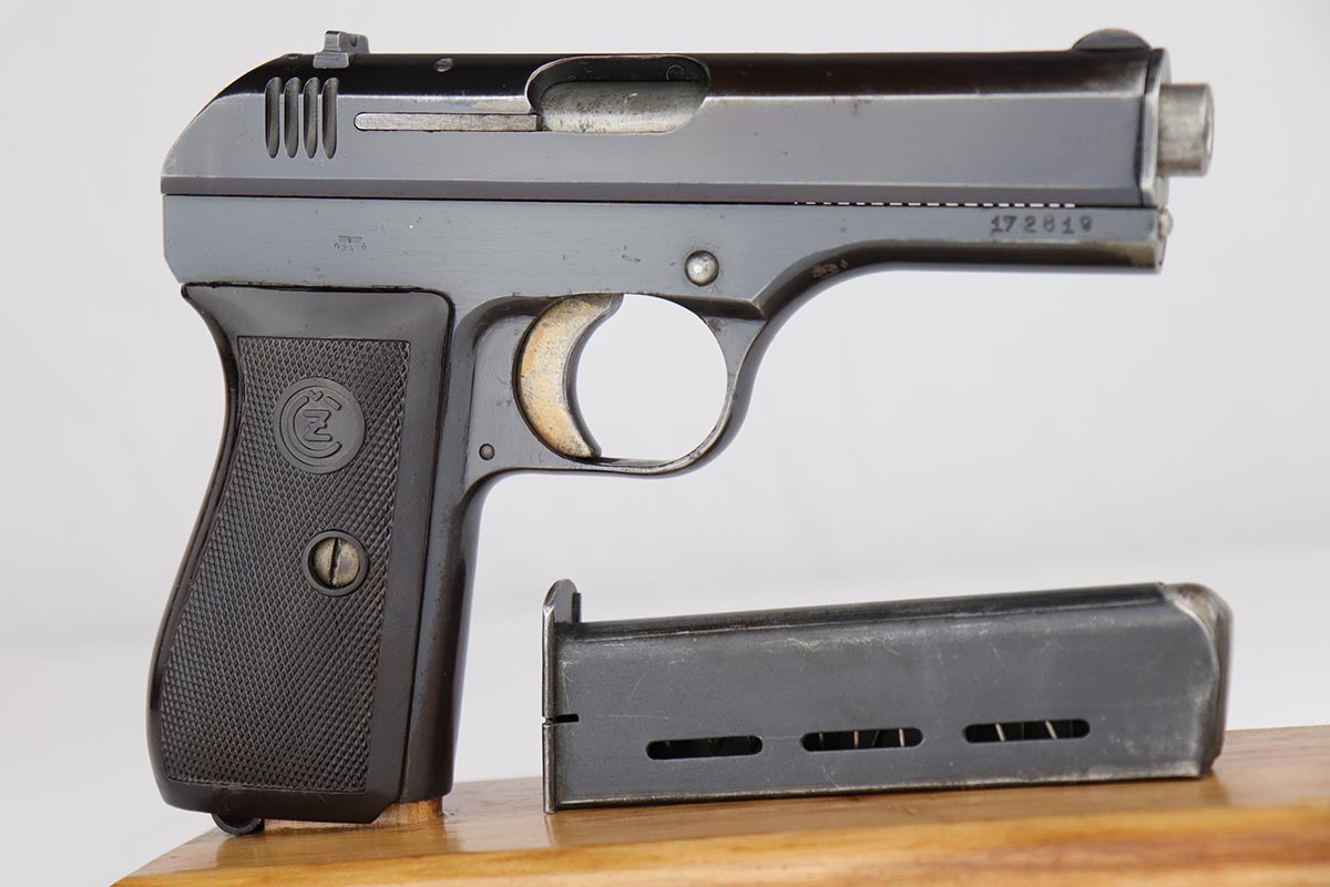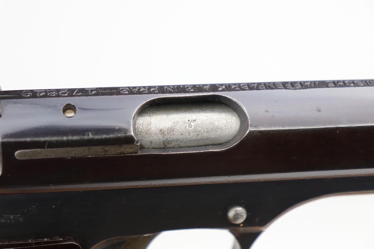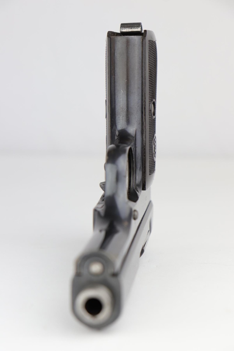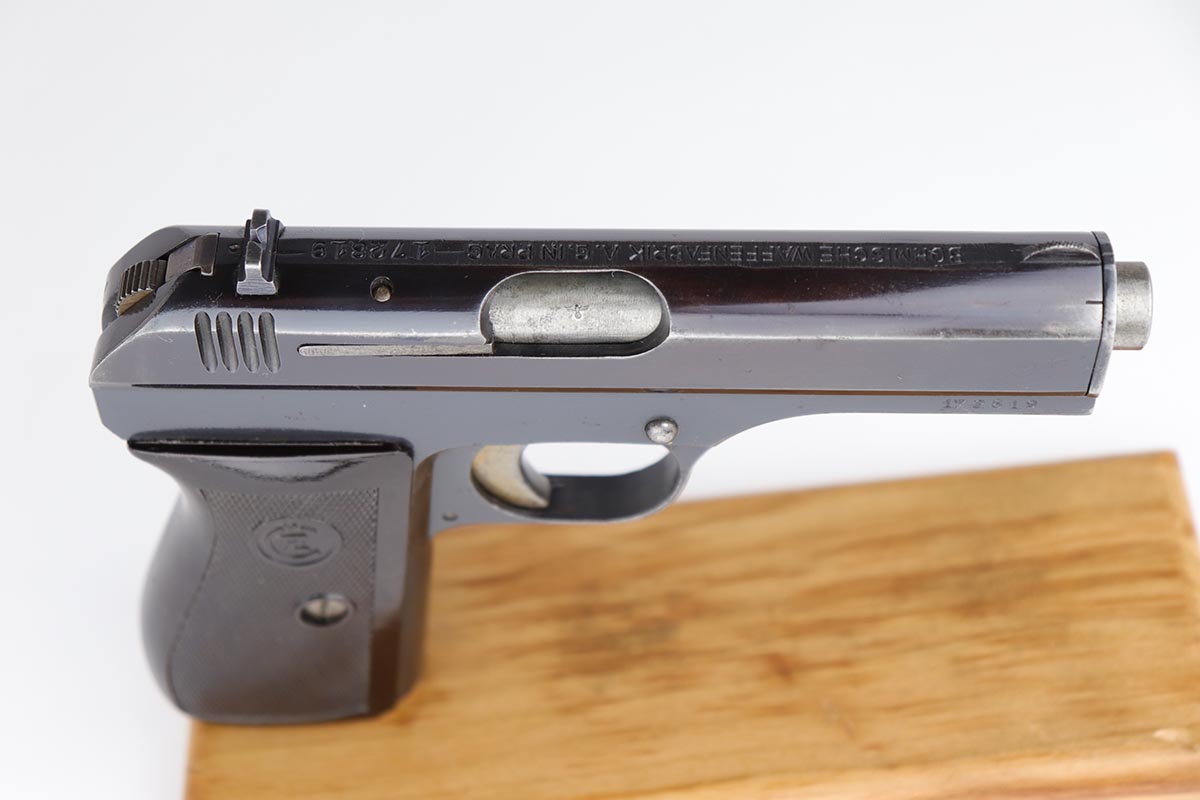 5/8/19 – This is a very nice example of a Nazi issued CZ model 27 with earlier high-polish blue. The pistol is all matching and original with about 95% blue remaining, showing common high point wear with some patina on the front strap and an area of freckling along the left side slide edge. Nice original grip, but both sides have the common corner chip. Correct magazine. Bore is shiny with strong rifling, but does have a small area of freckling in it.