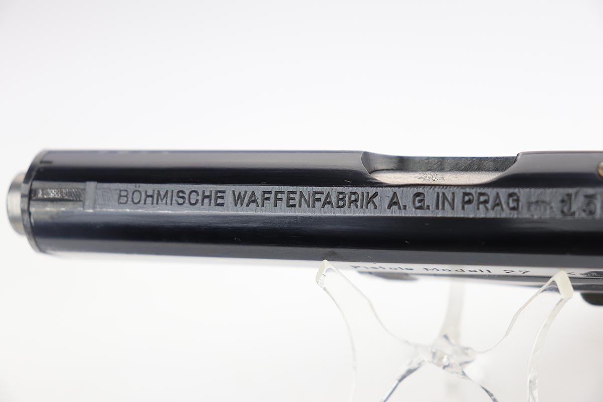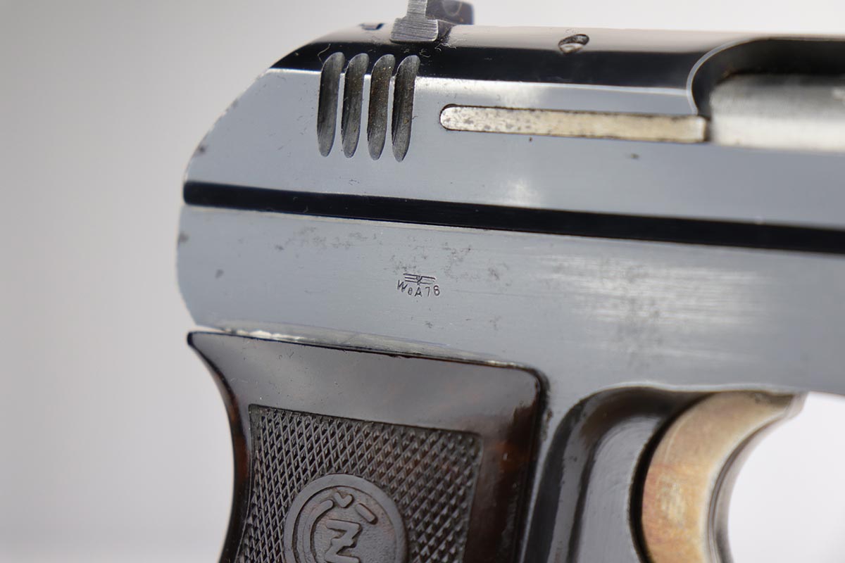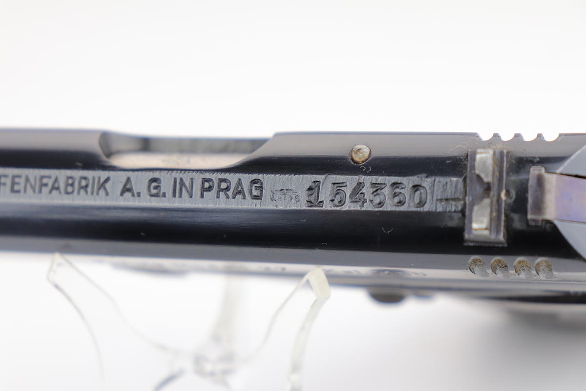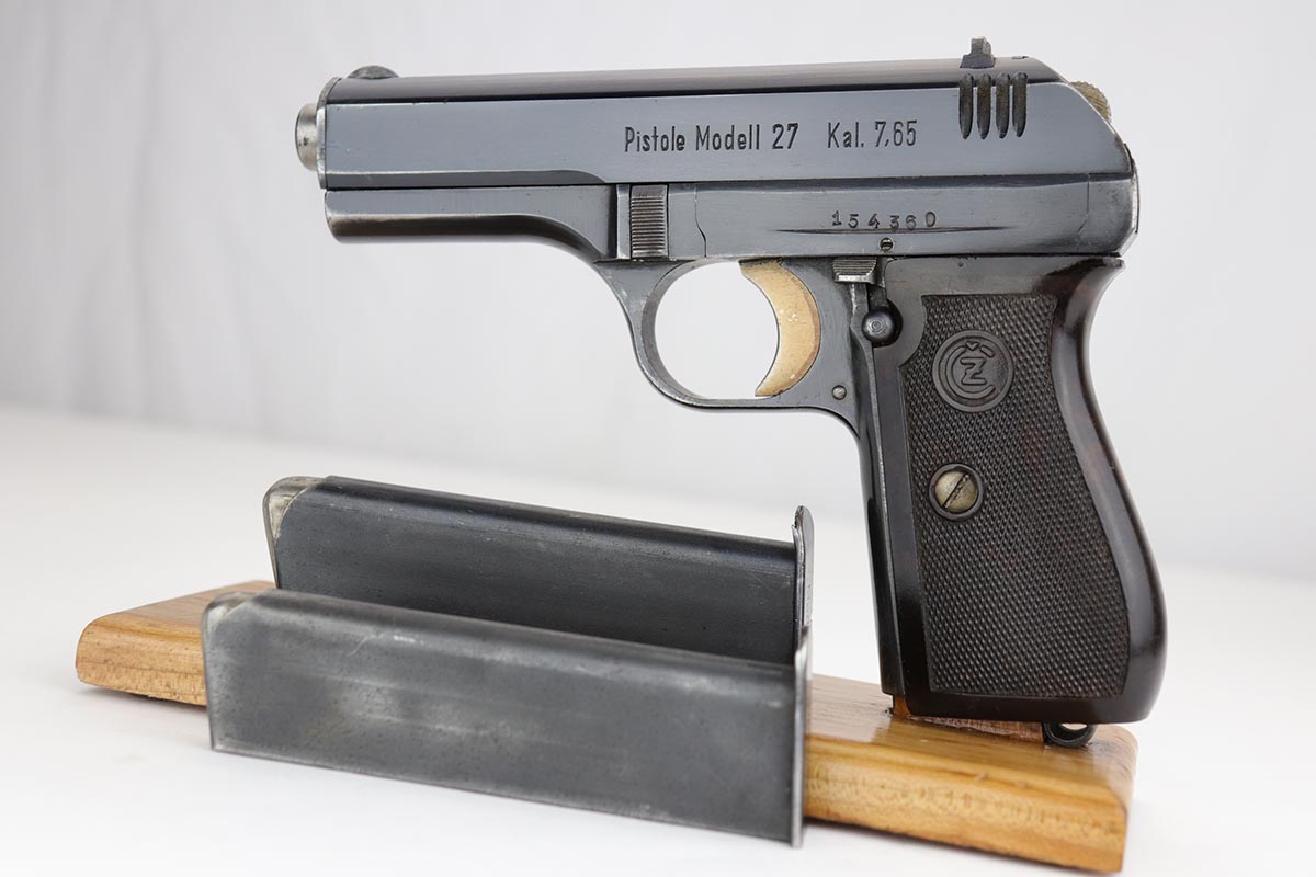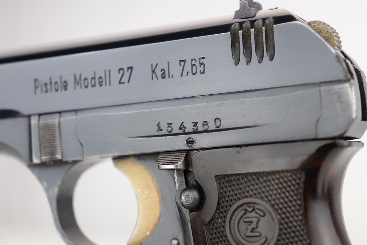 12/19/19 – This is a complete Nazi CZ 27 rig with early, high-polish blue. The gun is all matching and original, with about 90-92% of the blue remaining. There are areas of rub wear on the front strap and right side of slide/frame. Minty bore. Terrific grip that doesn’t have the chips we see on nearly 100% of these grips. The rig includes a total of two original magazines, marked ‘P. MOD. 27’ on the bases. Rig is completed by an excellent, original holster. It is 1942 dated with sharp waffenamt and CZ maker mark.
