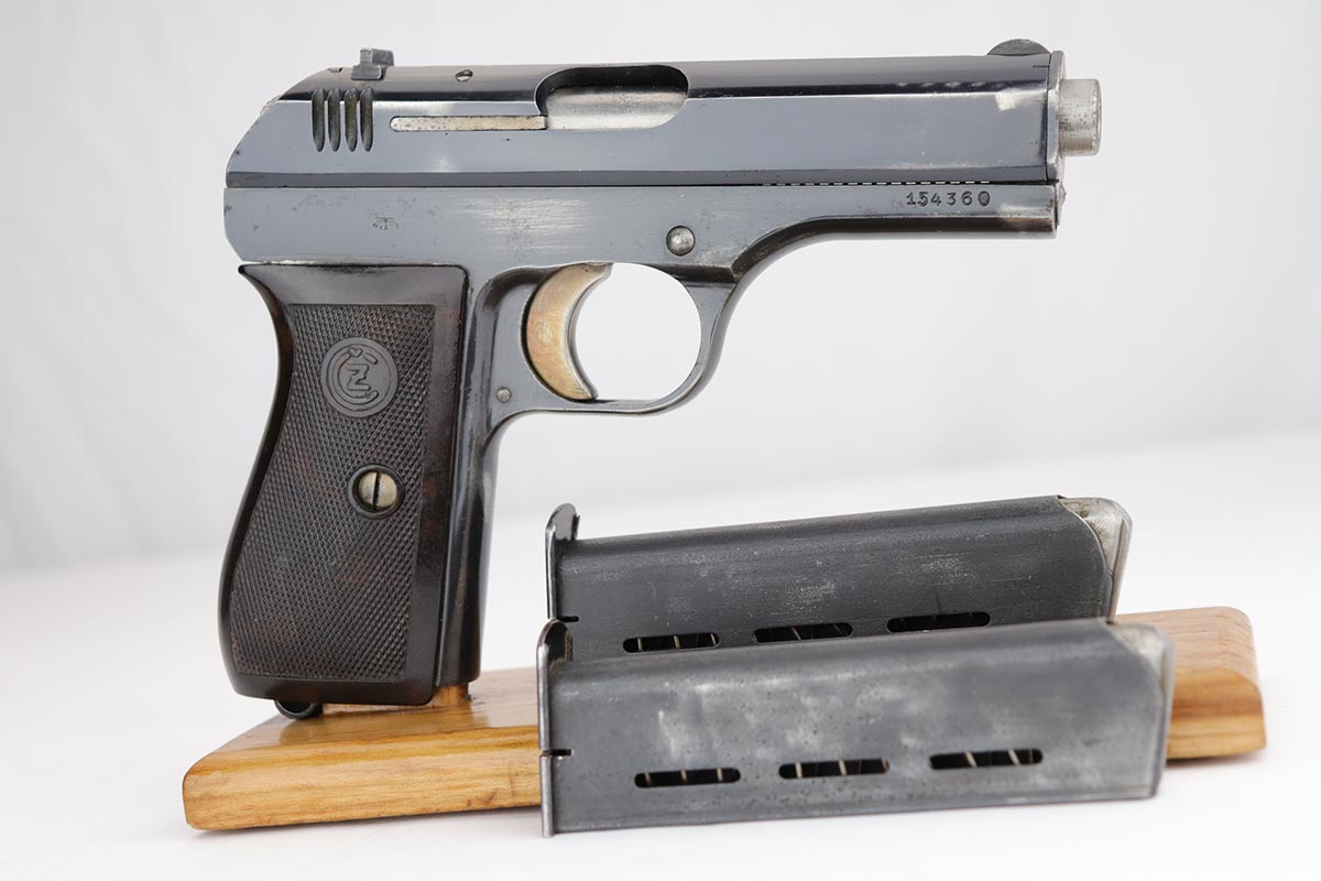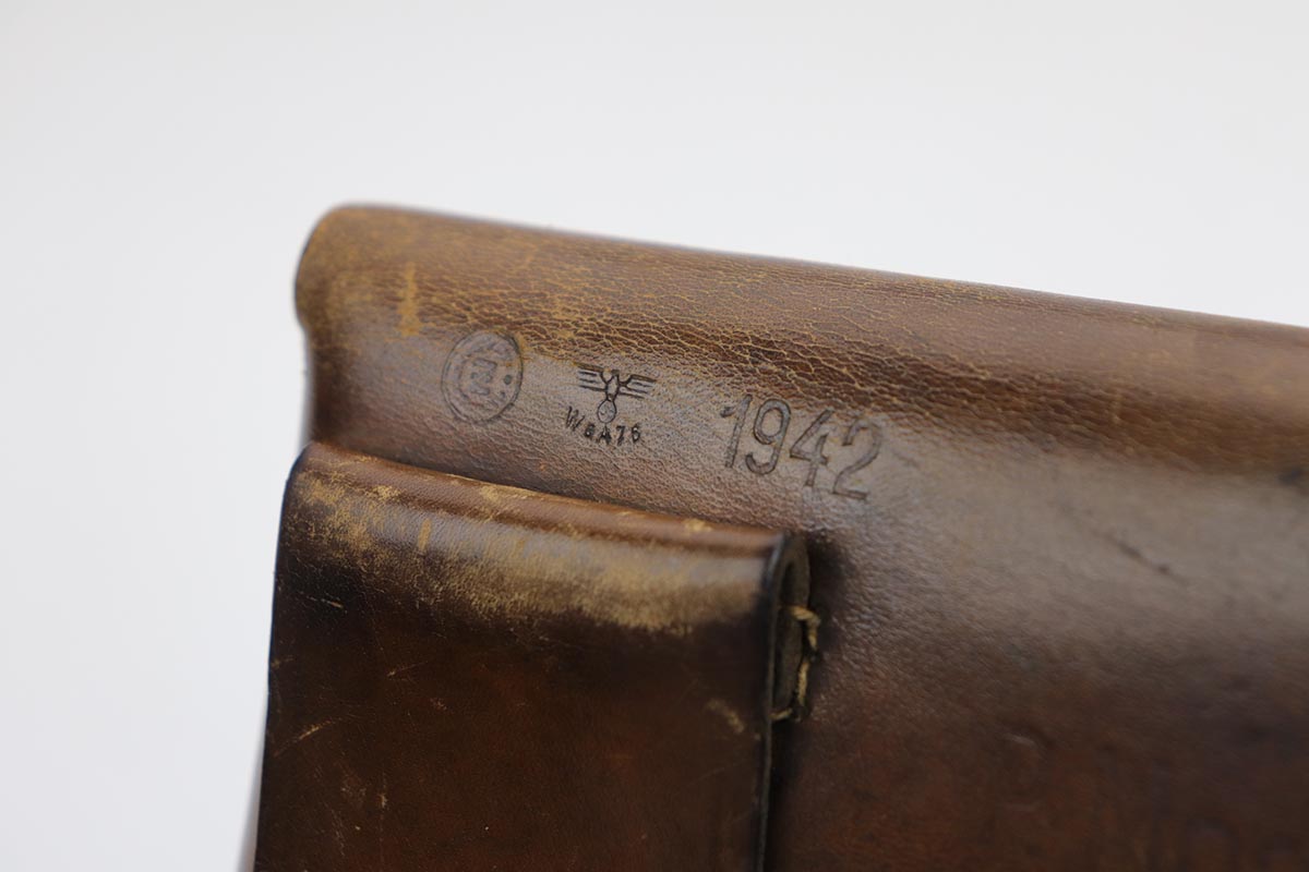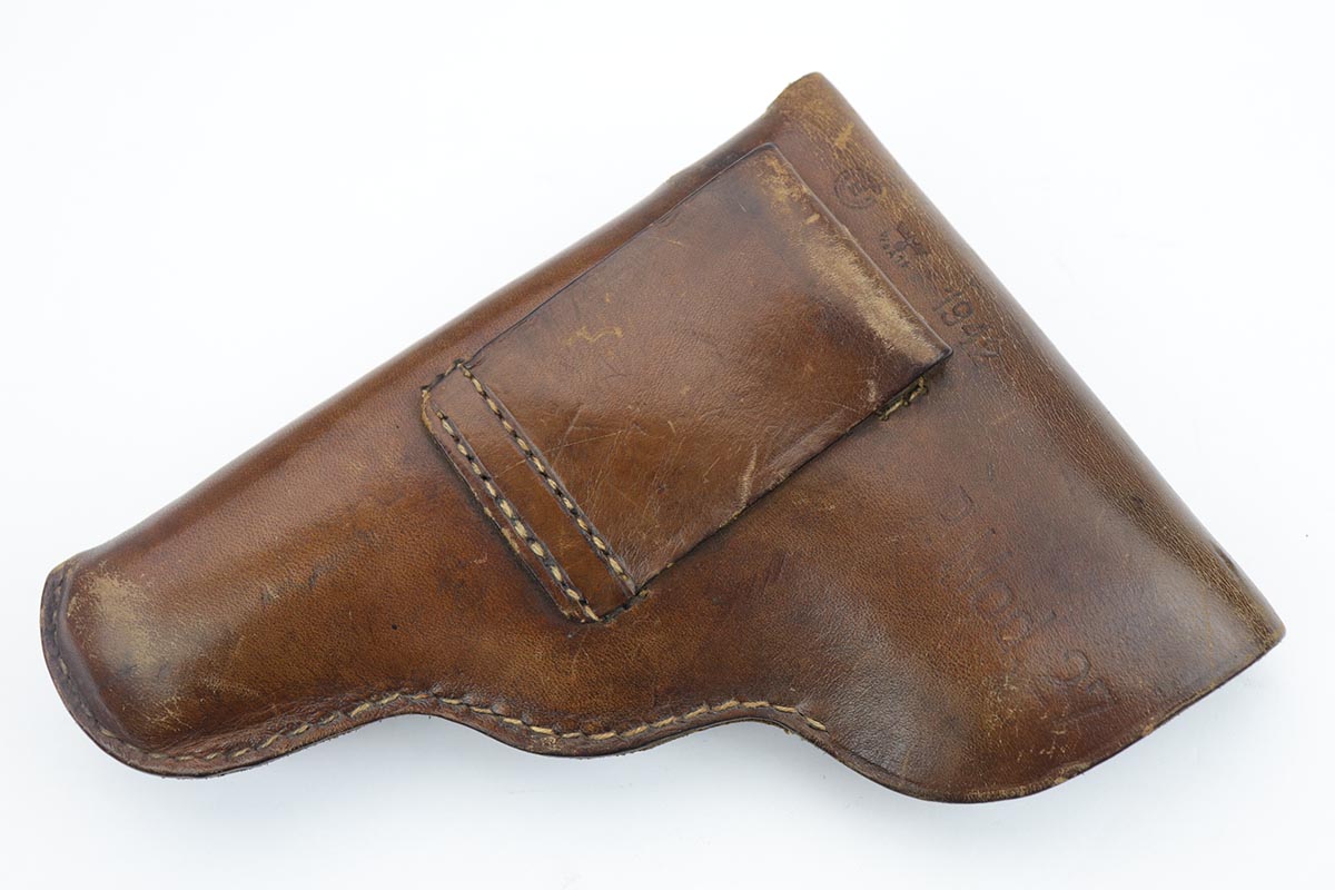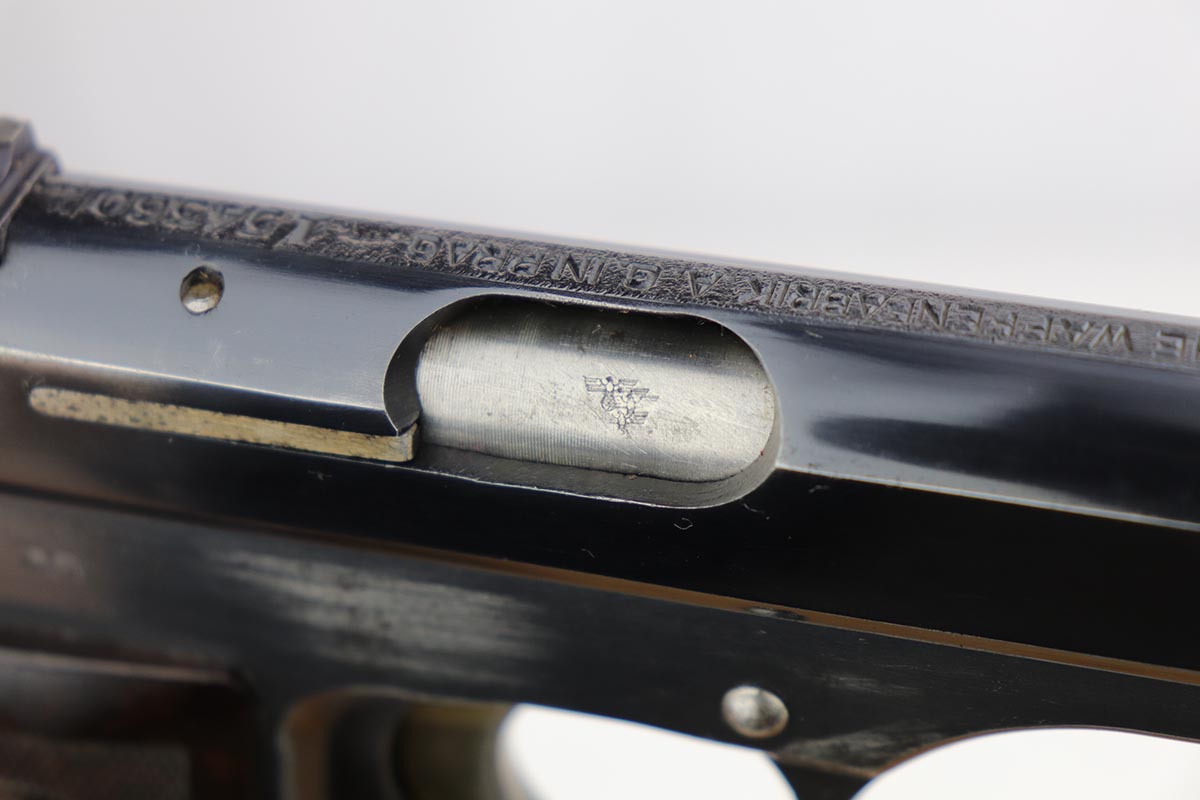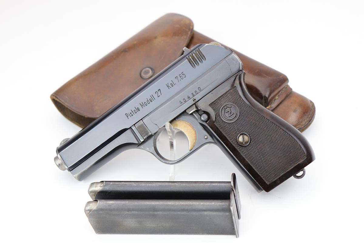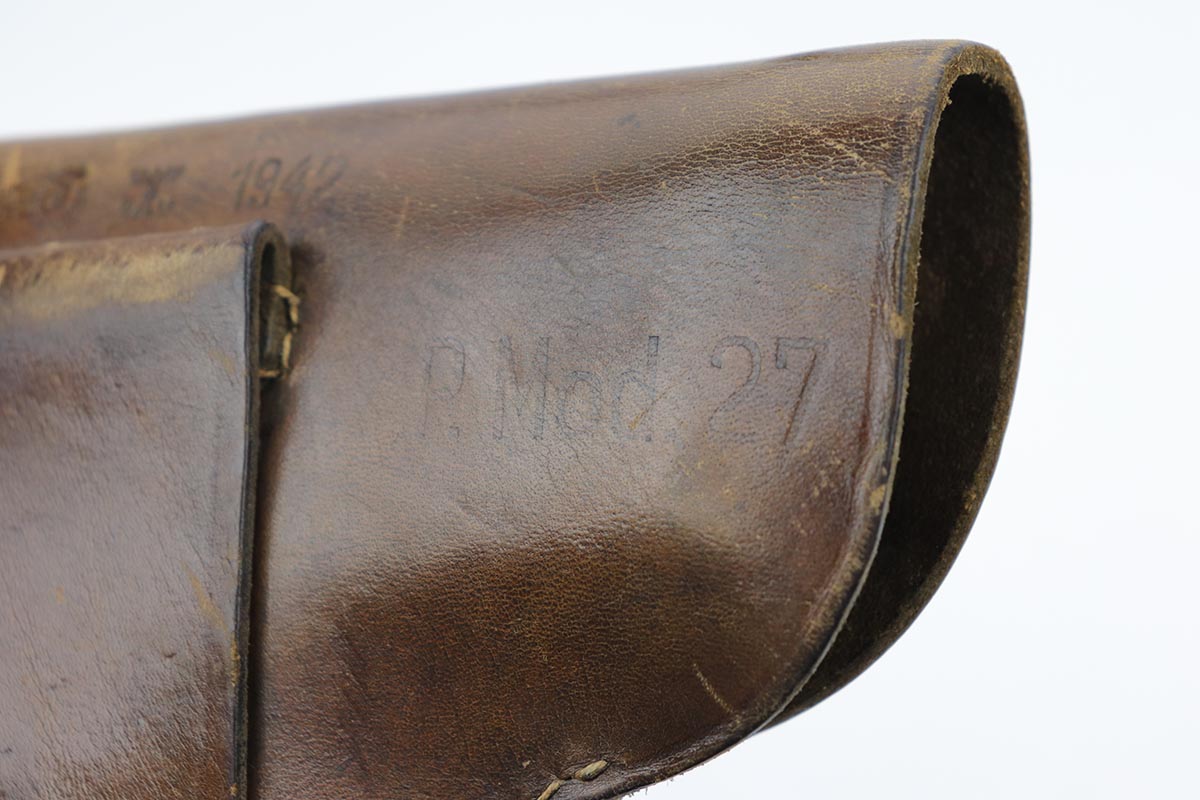 12/19/19 – This is a complete Nazi CZ 27 rig with early, high-polish blue. The gun is all matching and original, with about 90-92% of the blue remaining. There are areas of rub wear on the front strap and right side of slide/frame. Minty bore. Terrific grip that doesn’t have the chips we see on nearly 100% of these grips. The rig includes a total of two original magazines, marked ‘P. MOD. 27’ on the bases. Rig is completed by an excellent, original holster. It is 1942 dated with sharp waffenamt and CZ maker mark.