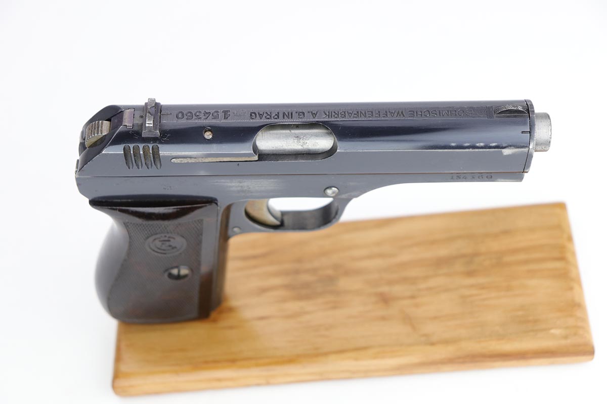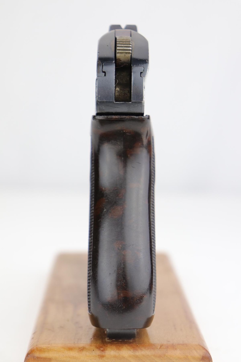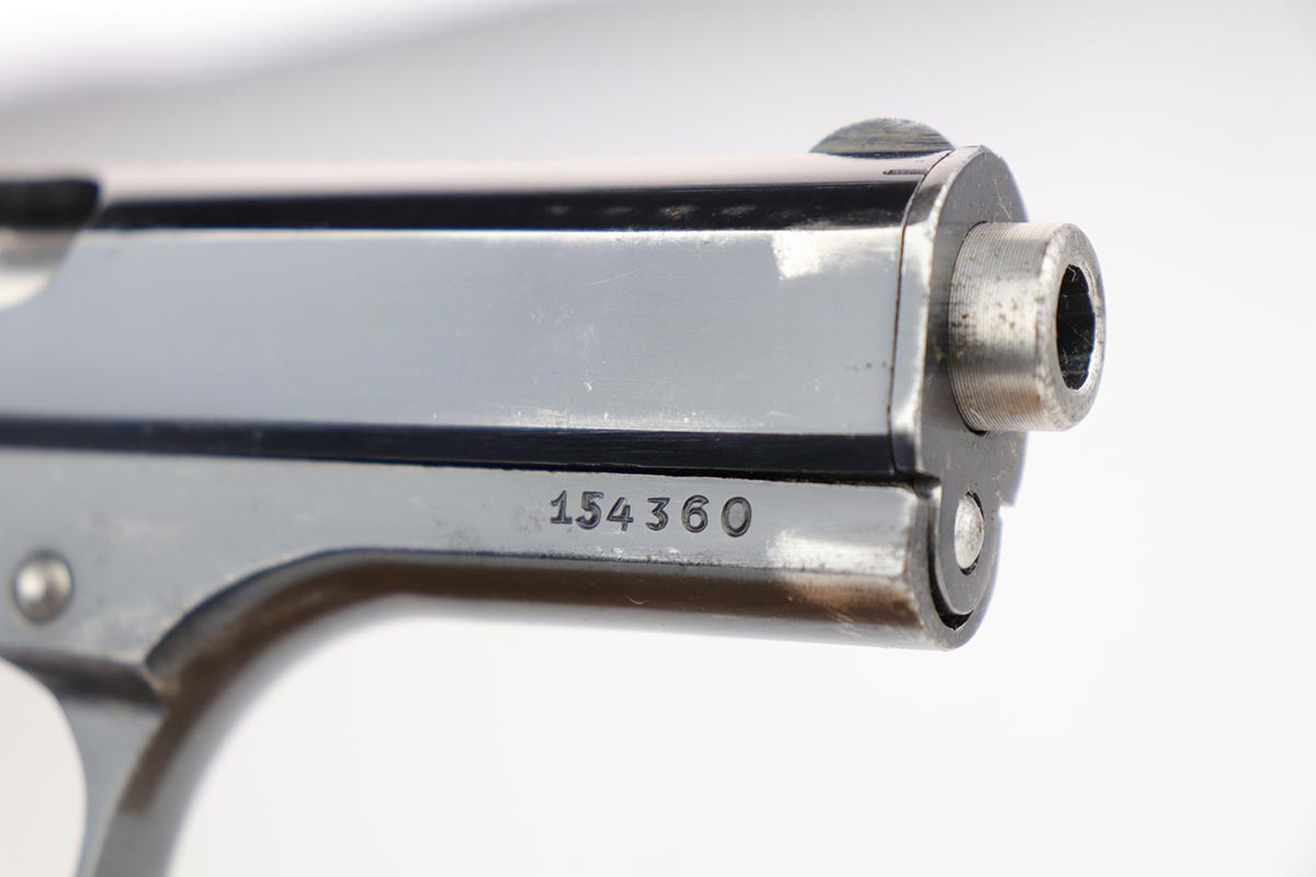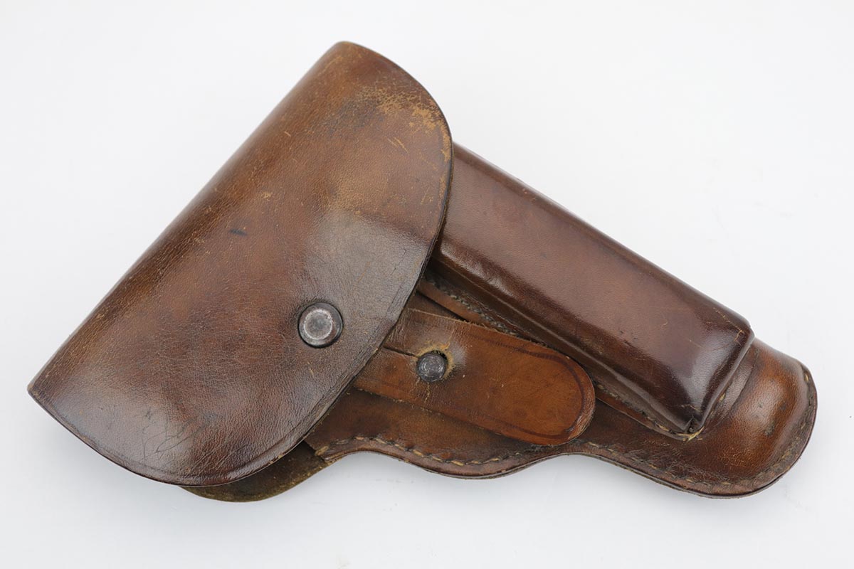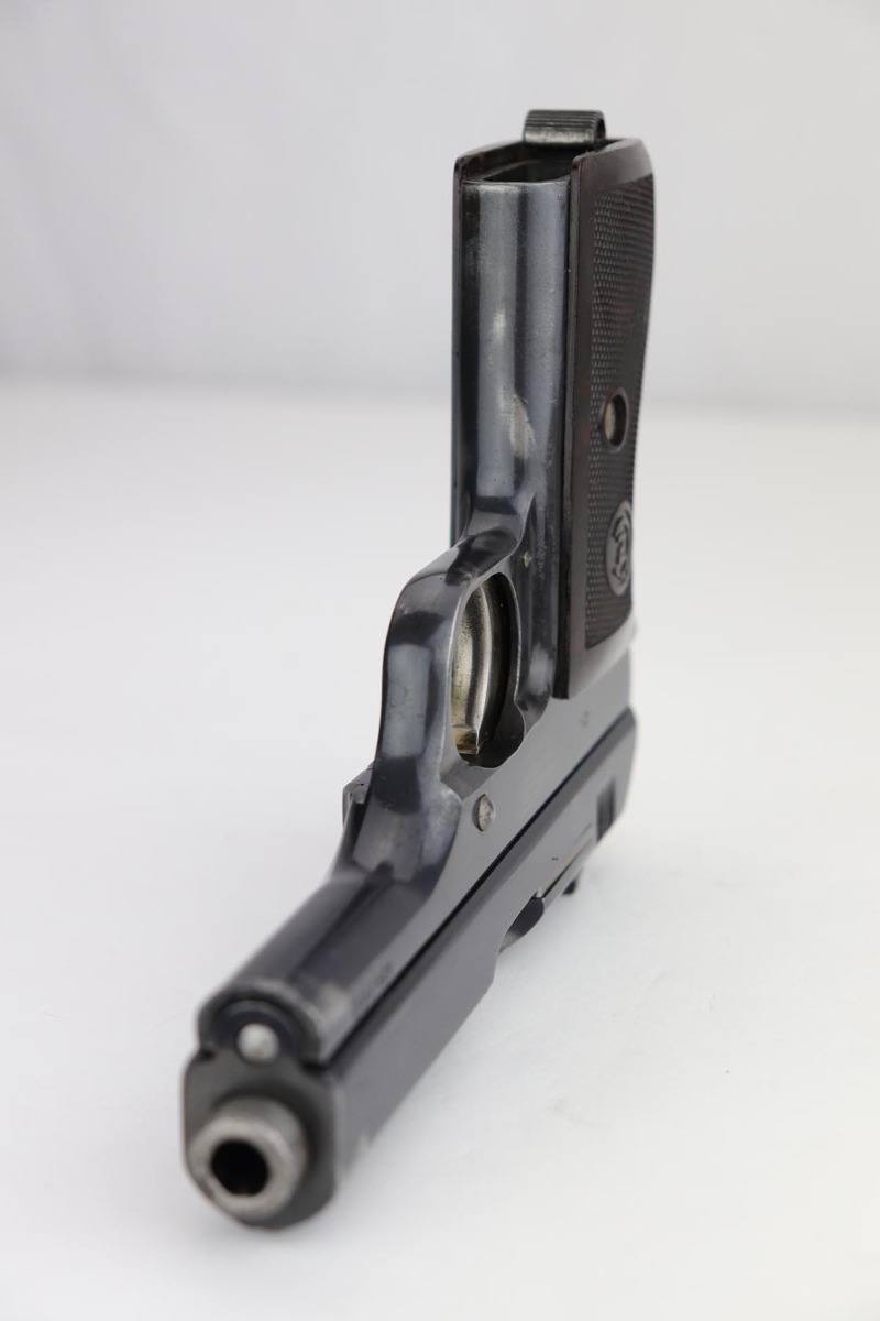 12/19/19 – This is a complete Nazi CZ 27 rig with early, high-polish blue. The gun is all matching and original, with about 90-92% of the blue remaining. There are areas of rub wear on the front strap and right side of slide/frame. Minty bore. Terrific grip that doesn’t have the chips we see on nearly 100% of these grips. The rig includes a total of two original magazines, marked ‘P. MOD. 27’ on the bases. Rig is completed by an excellent, original holster. It is 1942 dated with sharp waffenamt and CZ maker mark.