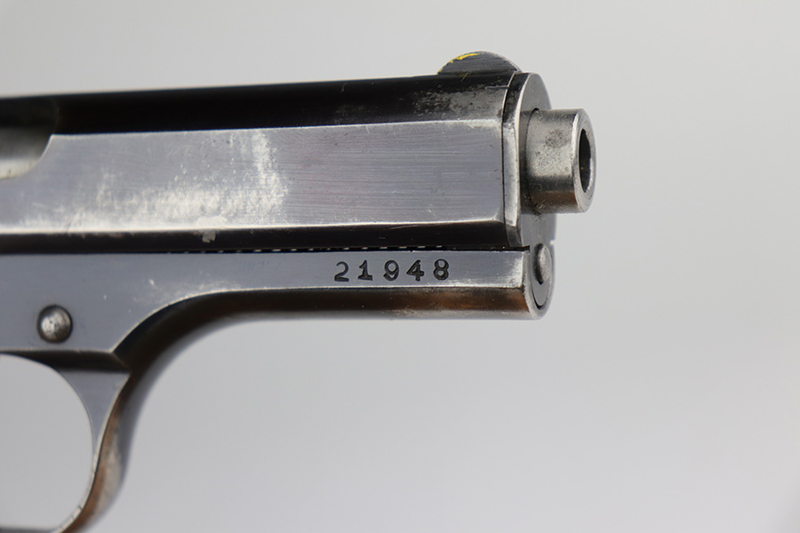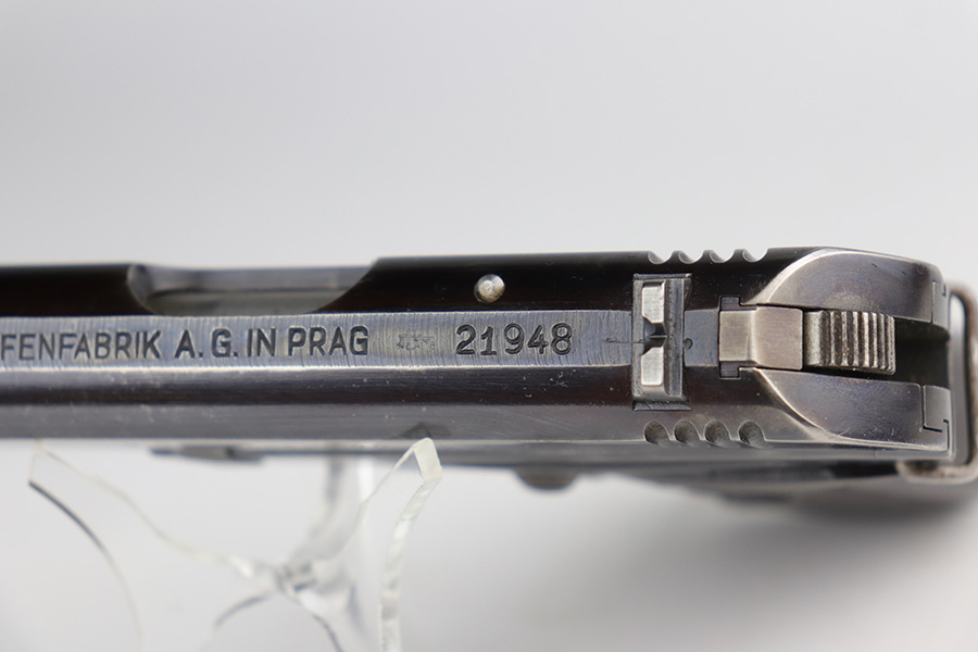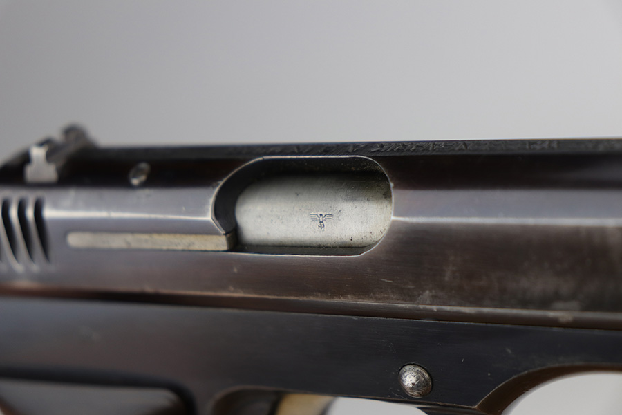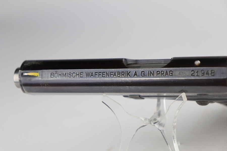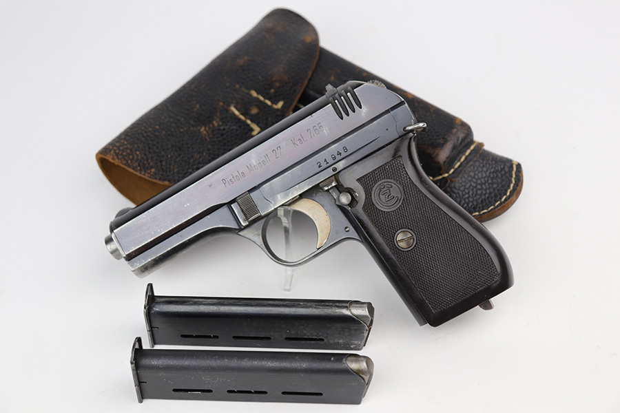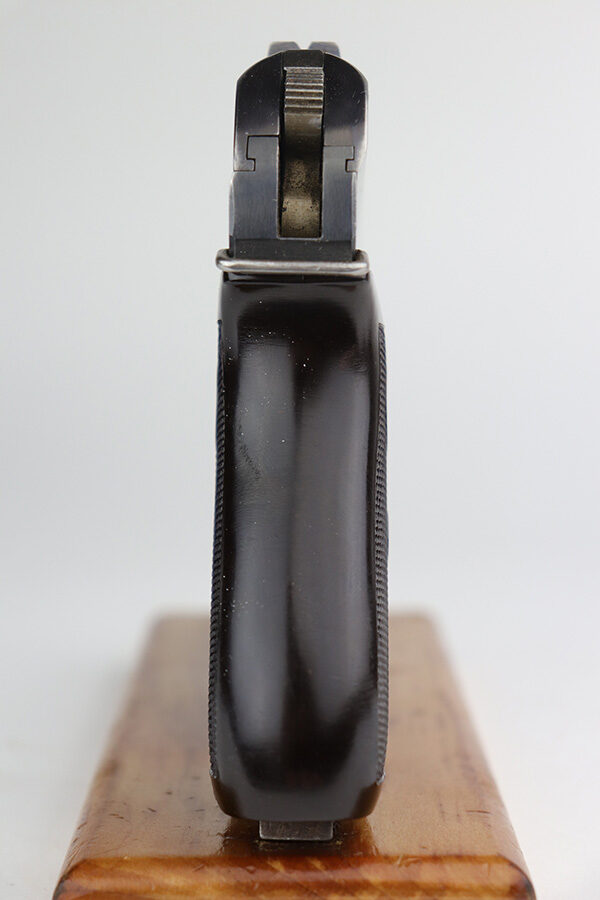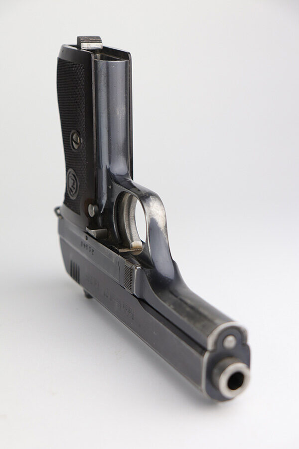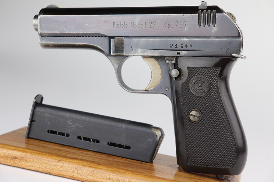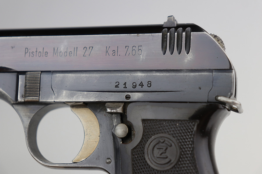9/15/21 – This is a nice example of an early CZ 27 issued to the Nazi military during WW2. The gun is all matching and has the proper “Waffen 76” military proofs. It comes with a nice 1944-dated waffen-proofed holster and two period-correct magazines – one has a blank bottom. It has an early high polish finish and a post-factory lanyard loop installed at the back of the frame. It has retained roughly 85% of its original finish. There is minor wear on the high edges and around the muzzle. Areas of spotty wear throughout, most noticeable on the underside of the frame, trigger guard, and right side of the slide. Comes with an excellent grip – no chips or cracks. The front sight was painted yellow. The bore is mint.