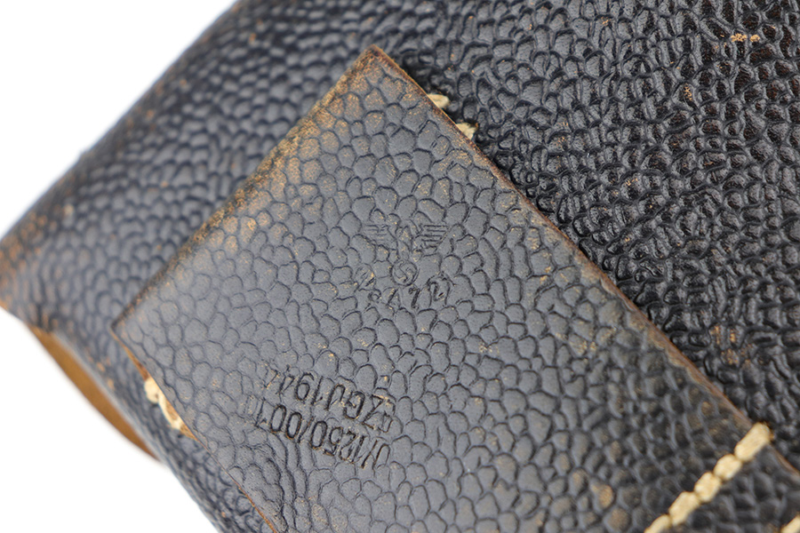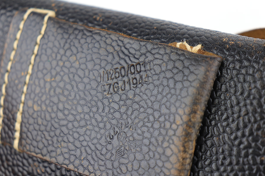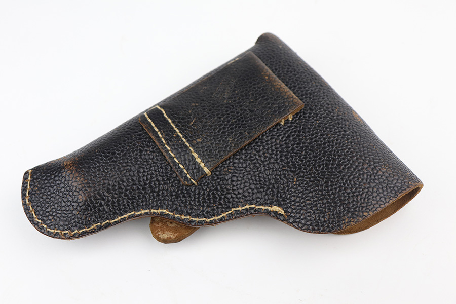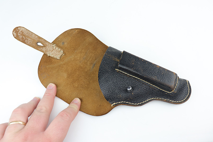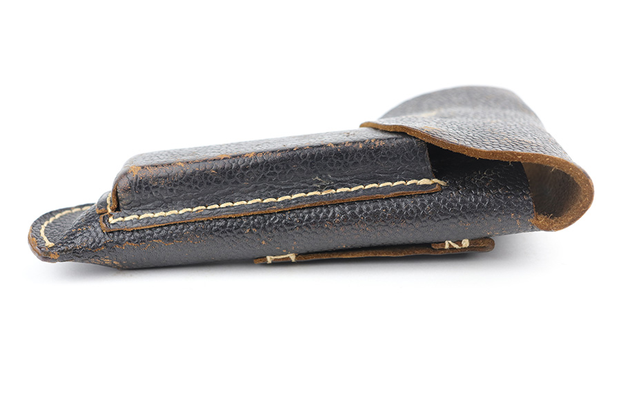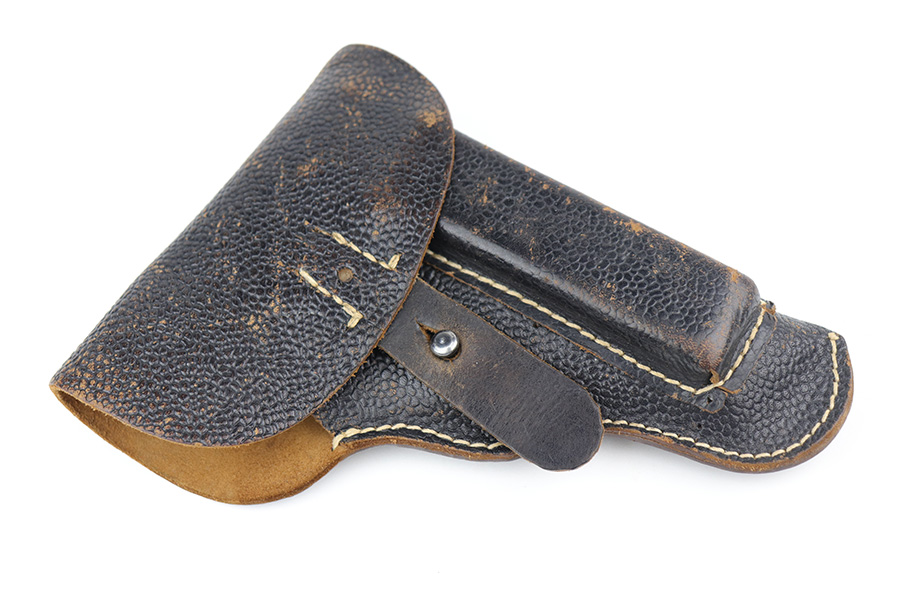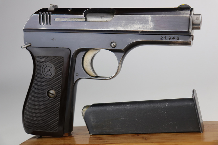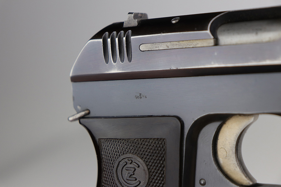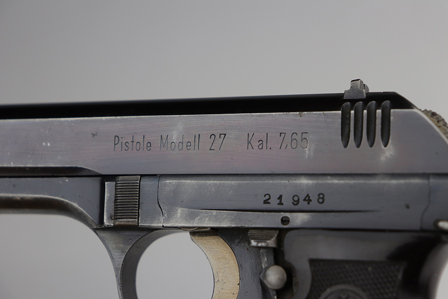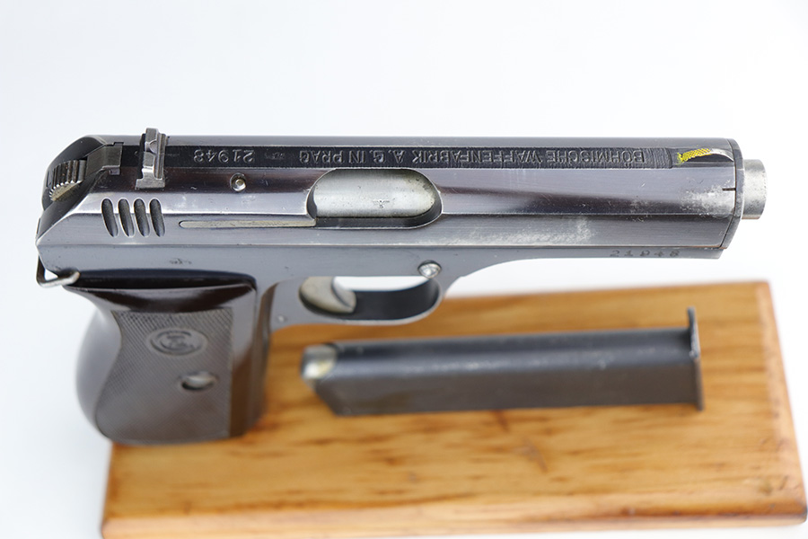 9/15/21 – This is a nice example of an early CZ 27 issued to the Nazi military during WW2. The gun is all matching and has the proper “Waffen 76” military proofs. It comes with a nice 1944-dated waffen-proofed holster and two period-correct magazines – one has a blank bottom. It has an early high polish finish and a post-factory lanyard loop installed at the back of the frame. It has retained roughly 85% of its original finish. There is minor wear on the high edges and around the muzzle. Areas of spotty wear throughout, most noticeable on the underside of the frame, trigger guard, and right side of the slide. Comes with an excellent grip – no chips or cracks. The front sight was painted yellow. The bore is mint.